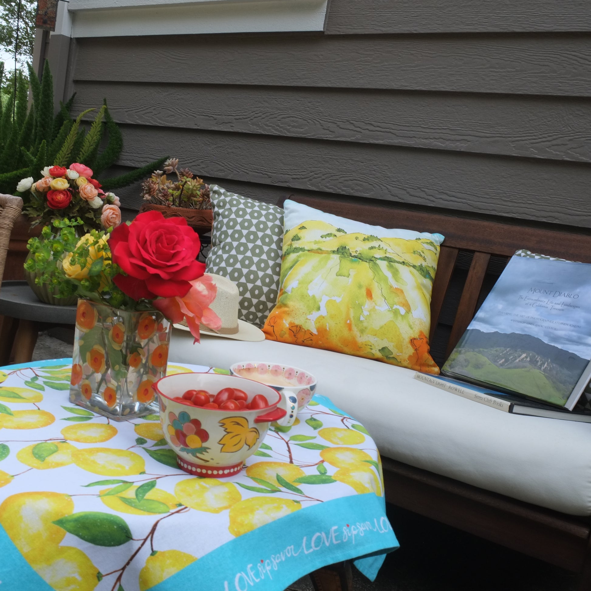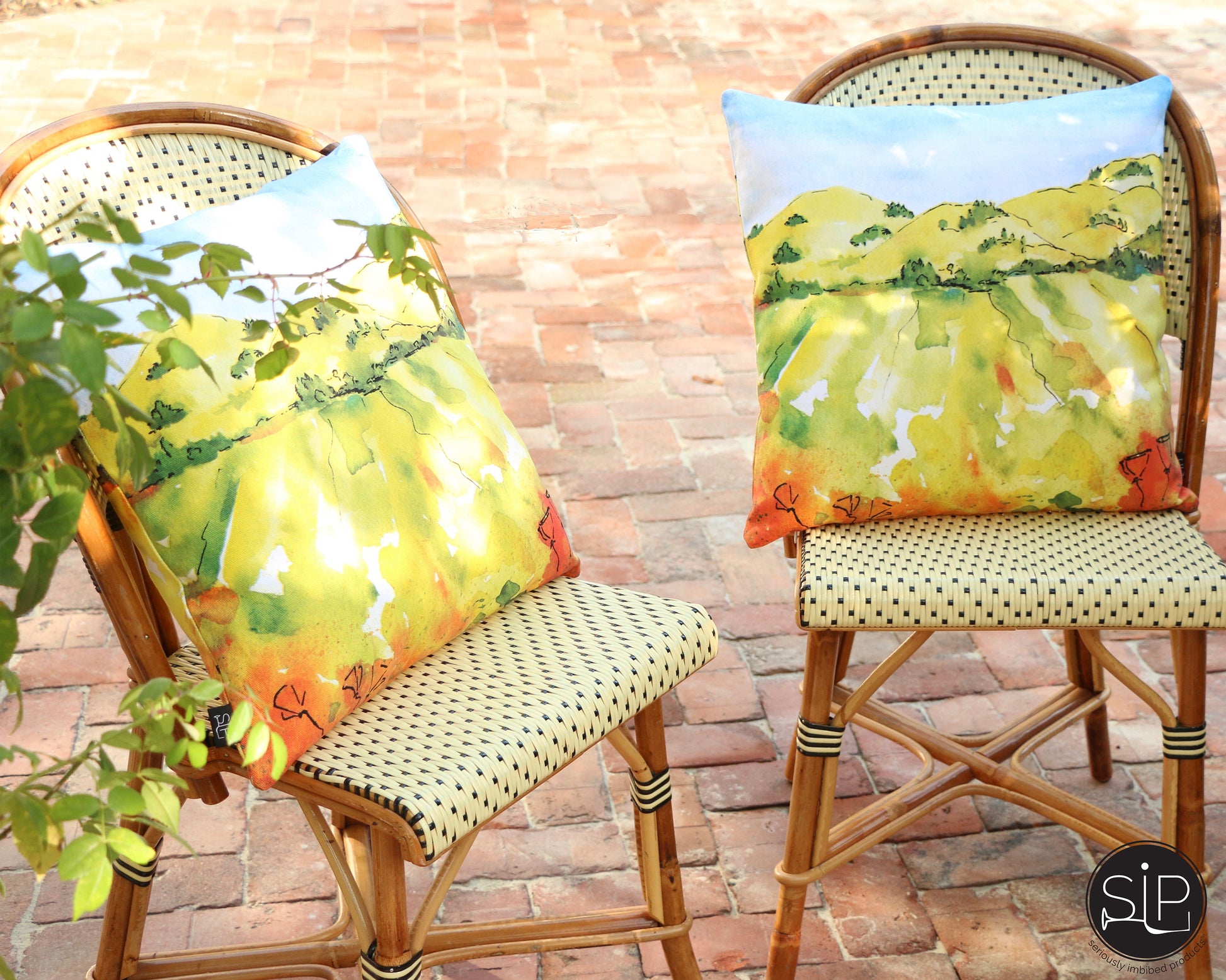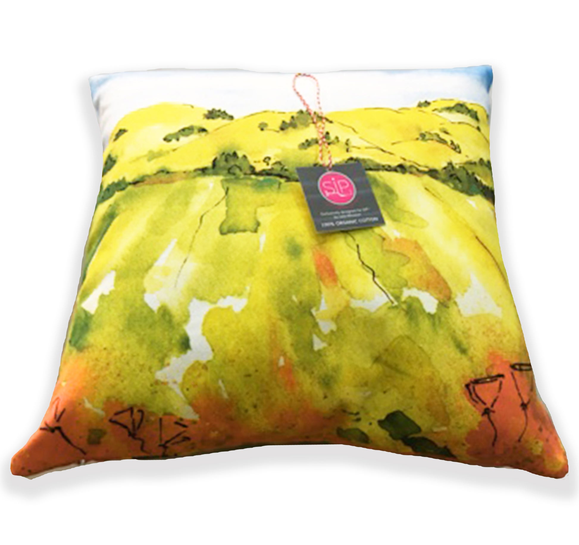 PILLOW COVER ONLY - Rolling hills, vineyards and blooming poppies makes this image a delight for wine country lovers. 18 x 18" organic cotton cover with polyester fill. Zipper for easy care. Indoor/outdoor. Washable.