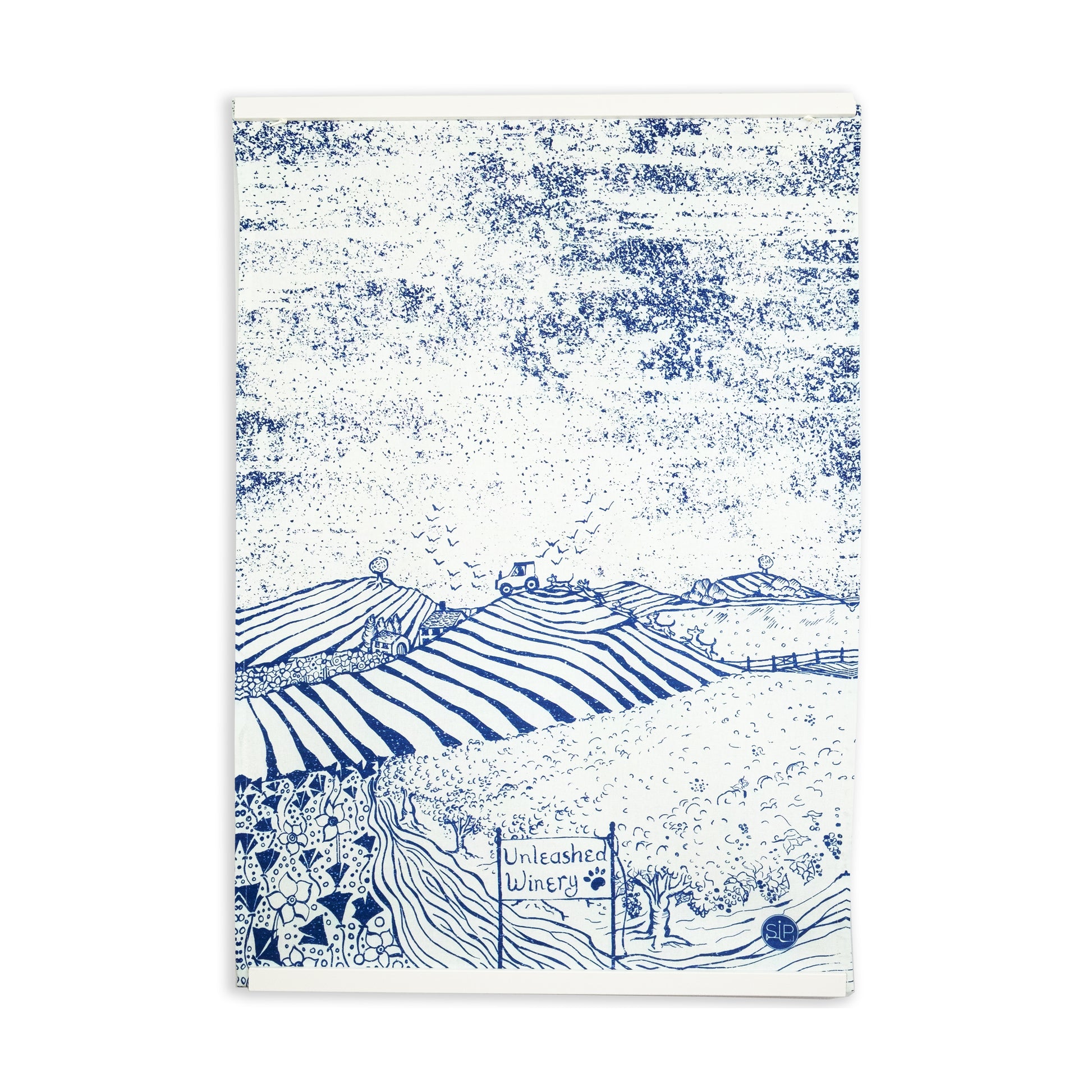 Super size 20” x 30”. 100% high grade organic cotton. Mitered corners and thoughtful hanging loop. Natural and long lasting dyes so the colors do not fade after many washings. Color safe. Colors: French Blue and white