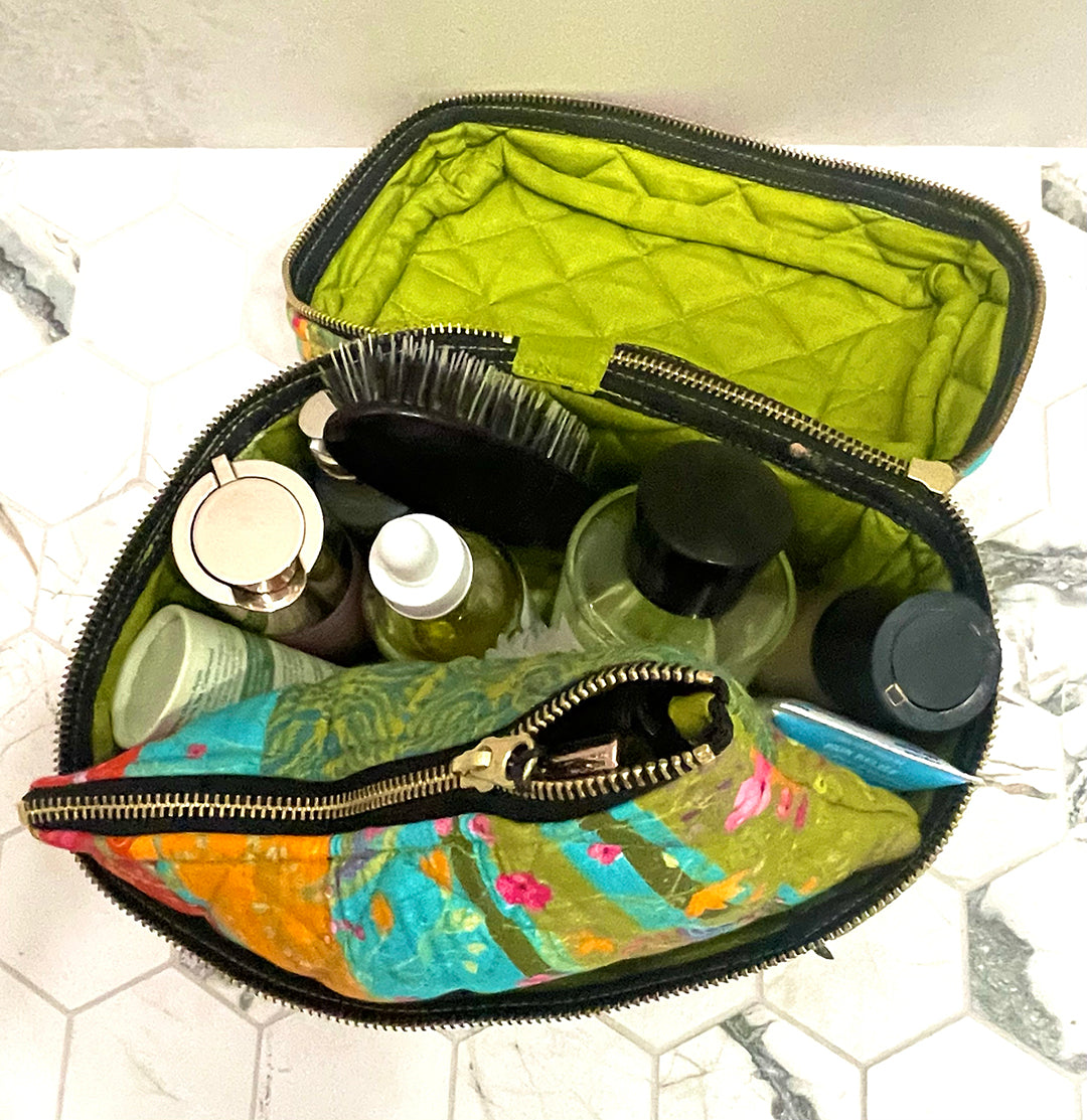 The wrap around zipper is high end and the bag is beautifully made with a top handle. This style larger bag makes it so easy to see what is inside so it is very convenient for travel or home use alike.It lots full size toiletries too.