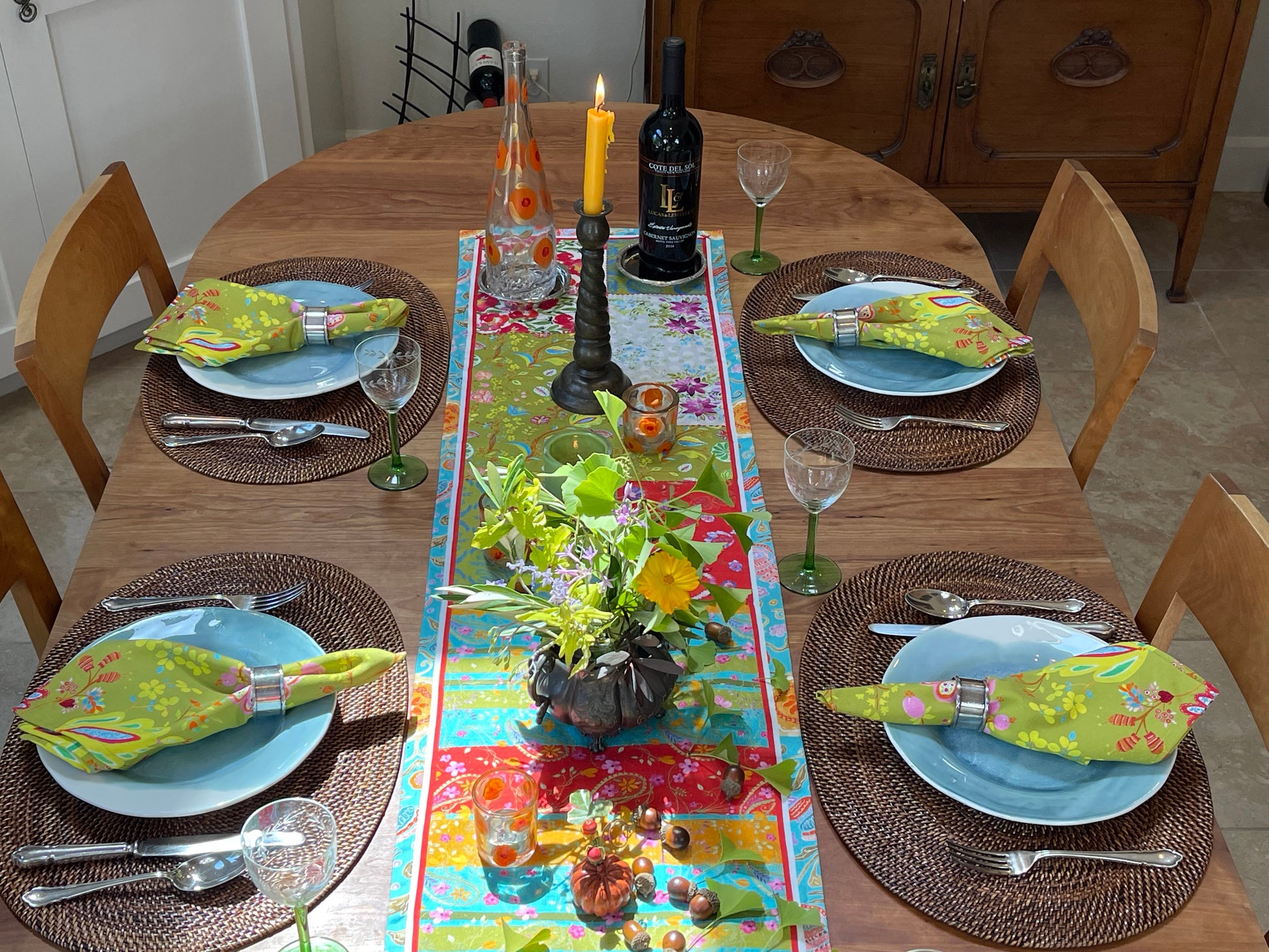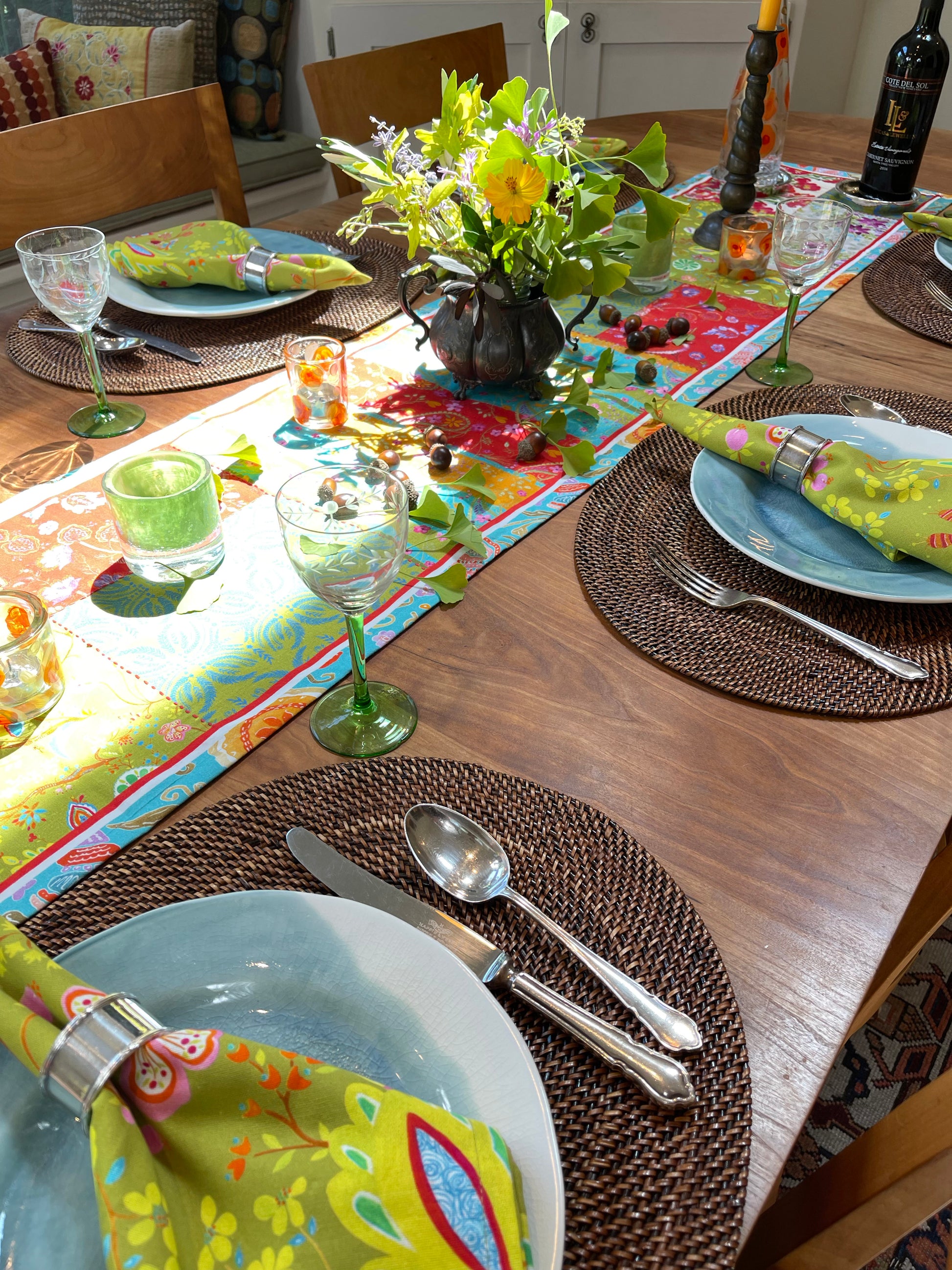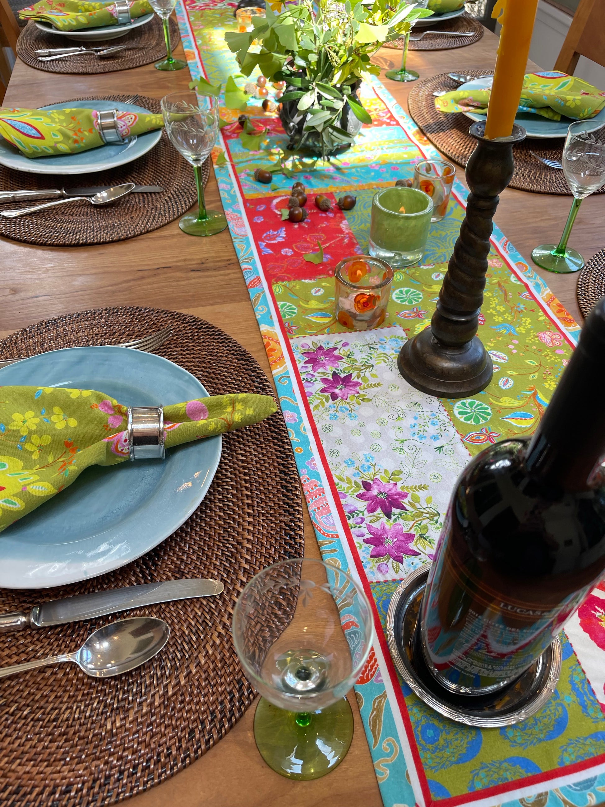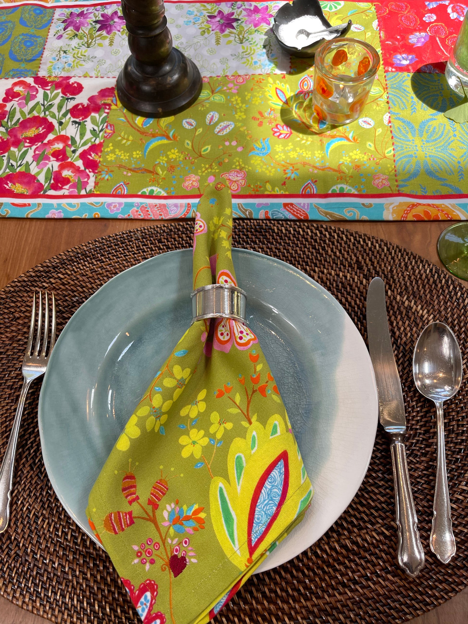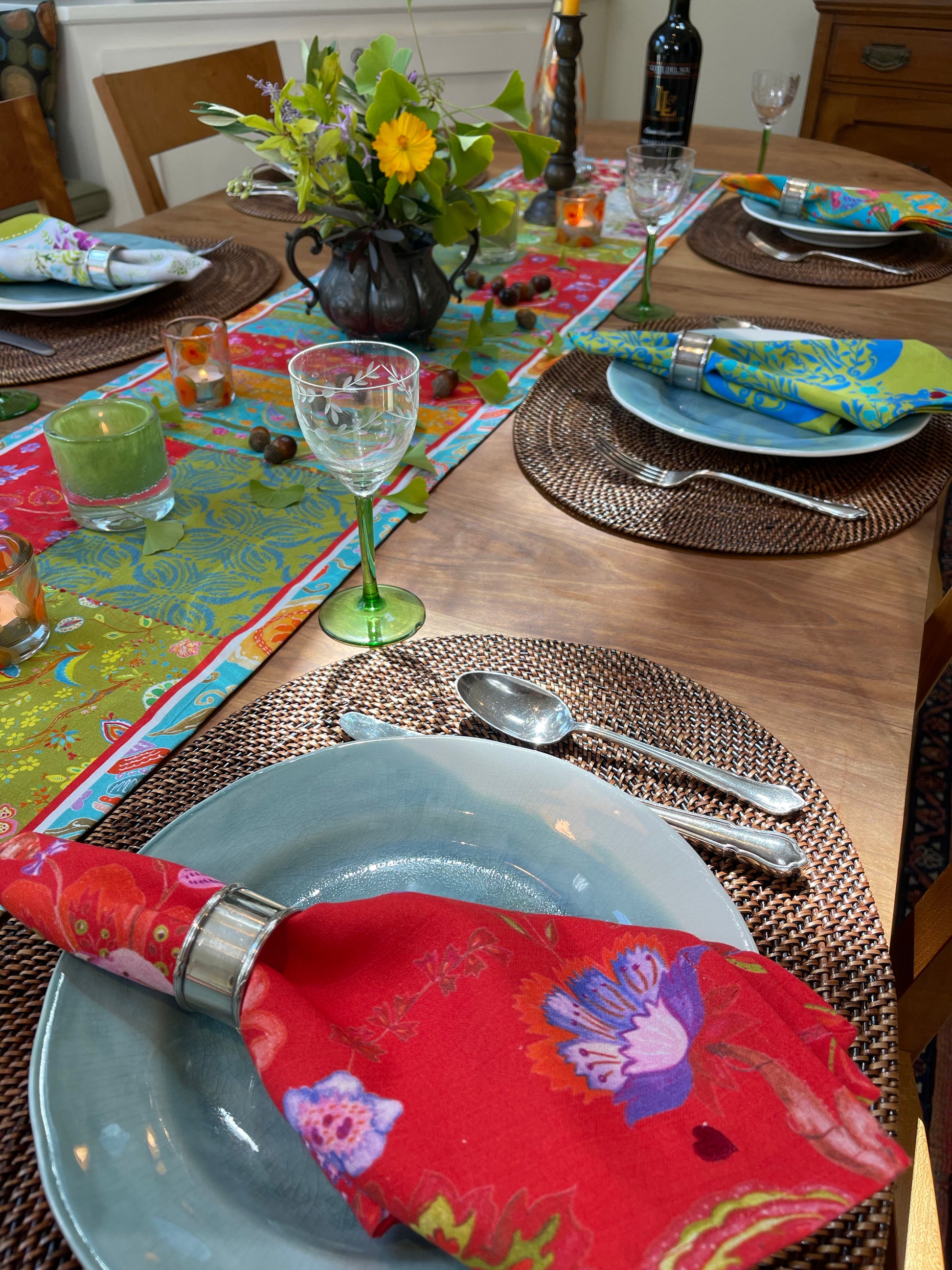I love this napkin. La Roque is a fun and fresh design inspired by wildflowers in the south of France. The icons are painted in a Jacobean style.