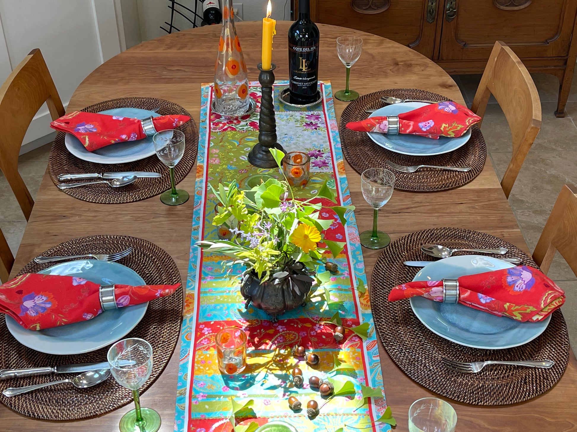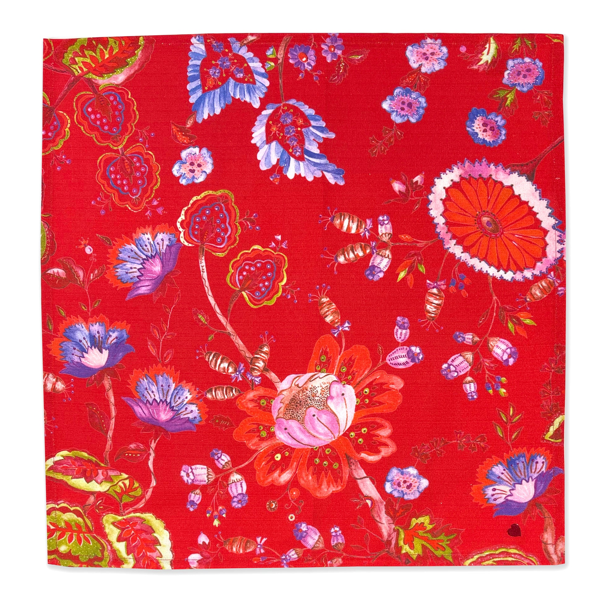 I love this napkin. Anima is a design I painted many years ago but this color way feels fun and fresh. The icons are a stylized Jacobean design.