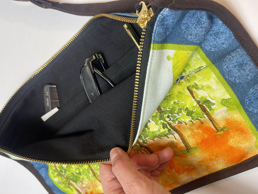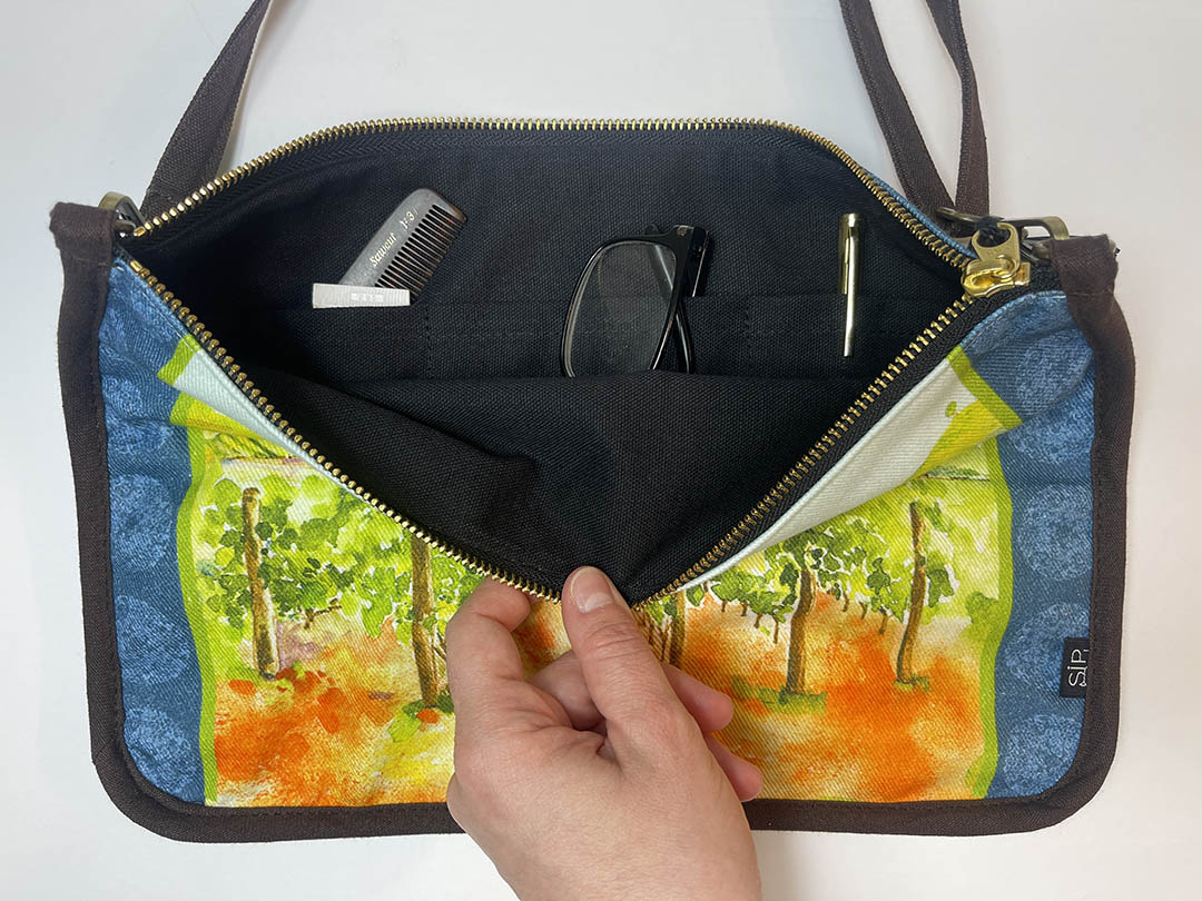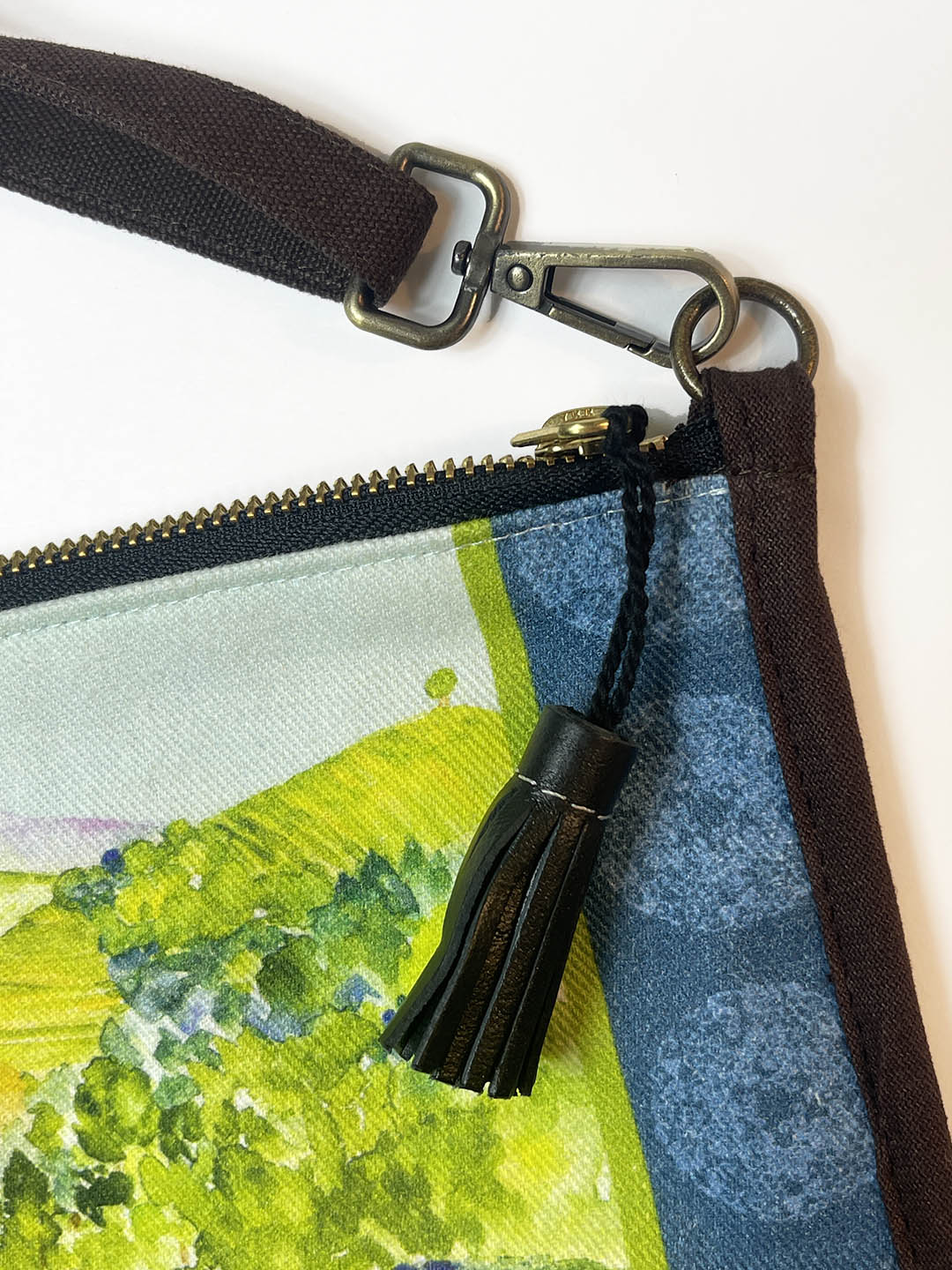 The strap is detachable and is long enough to be worn as a cross body. Beautifully made with organic cotton canvas. The brown canvas is to keep all our 'no leather' customers happy. It gives a aesthetics of leather through the color but is 100% organic.