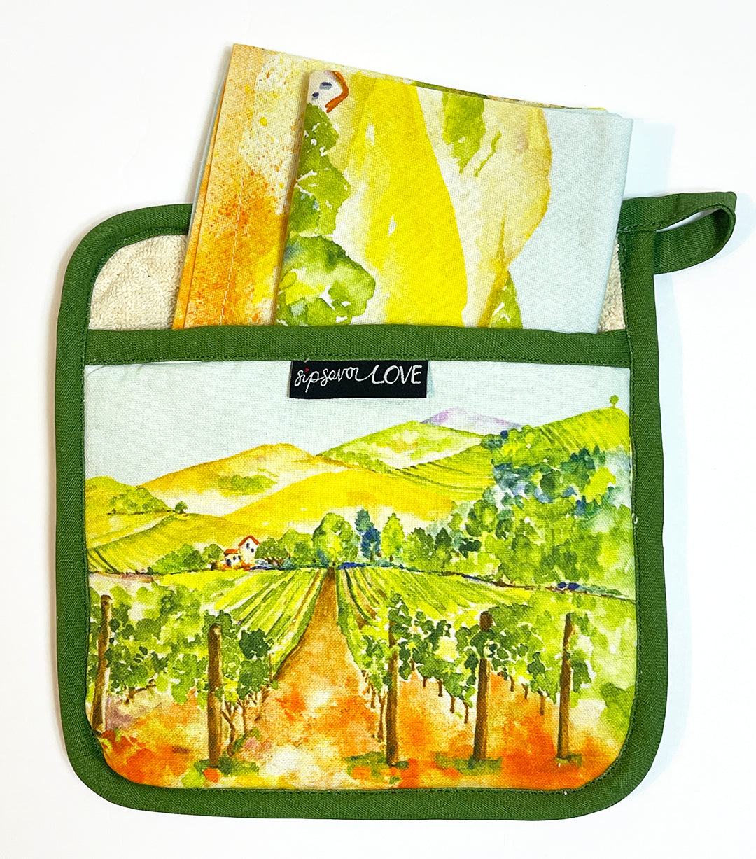 Check out the images for the towel and pot holder combos!