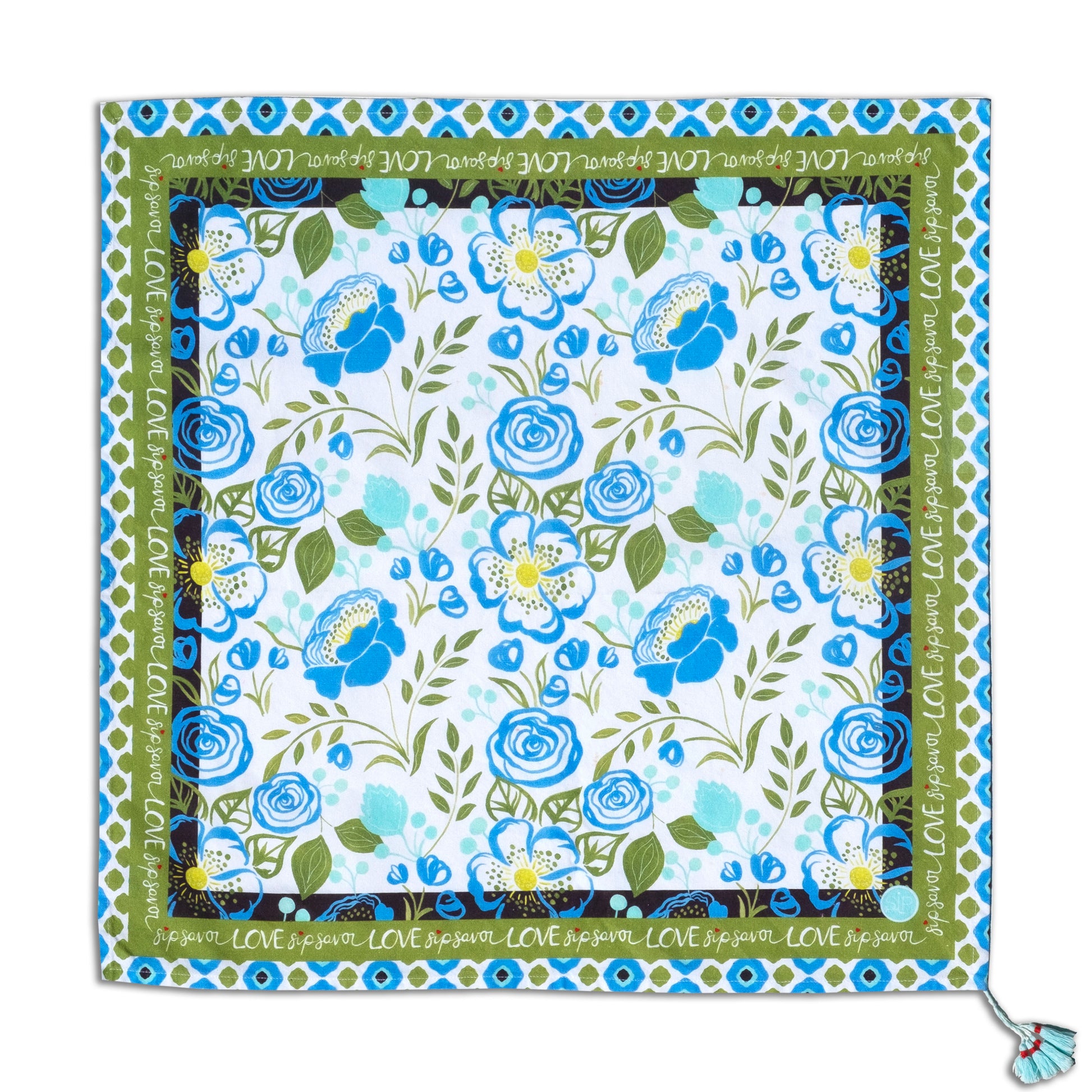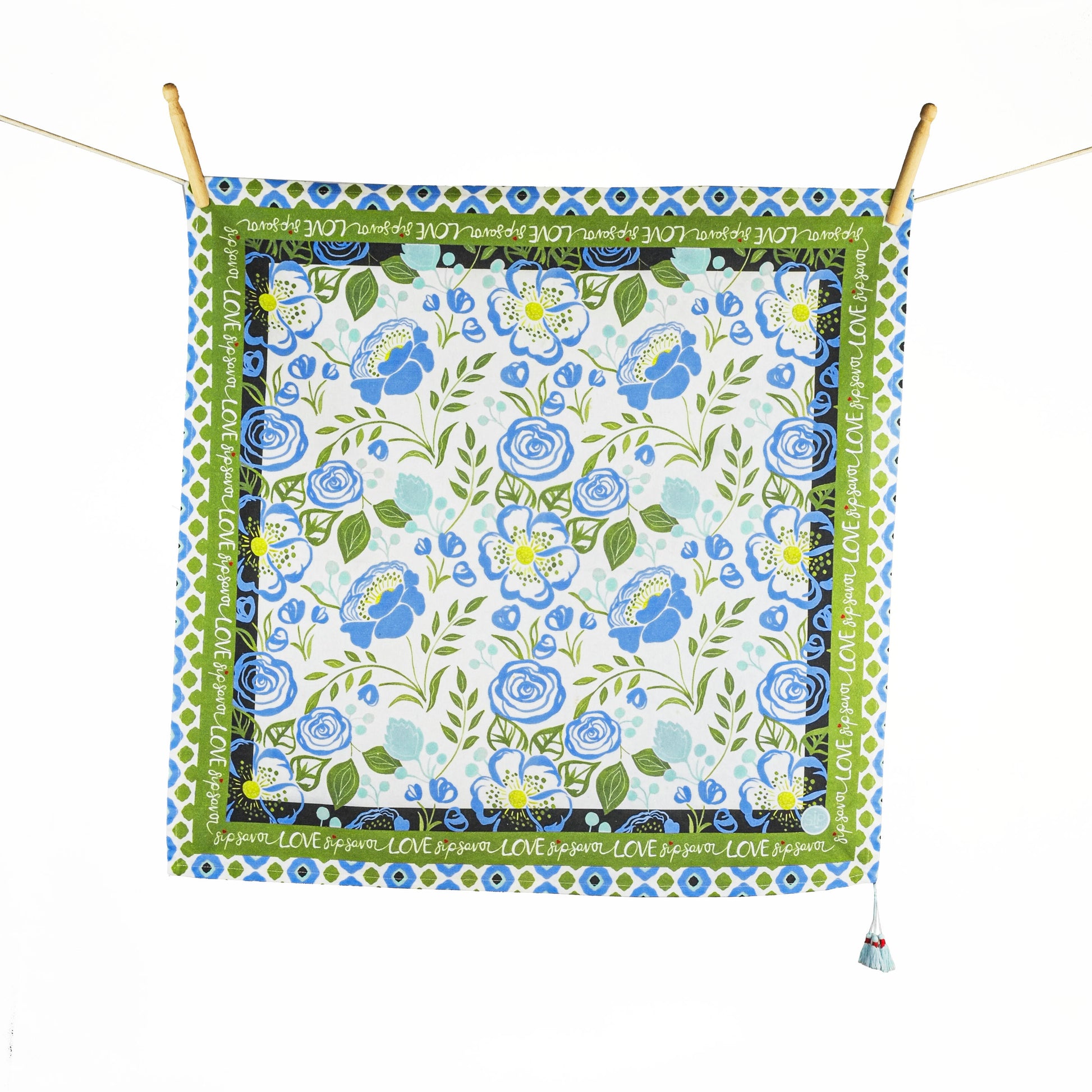 Size 26” x 26”. 100% high grade organic cotton. Mitered corners. Fun tassels adorn one corner. Natural and long lasting dyes - the colors do not fade after many washings.
