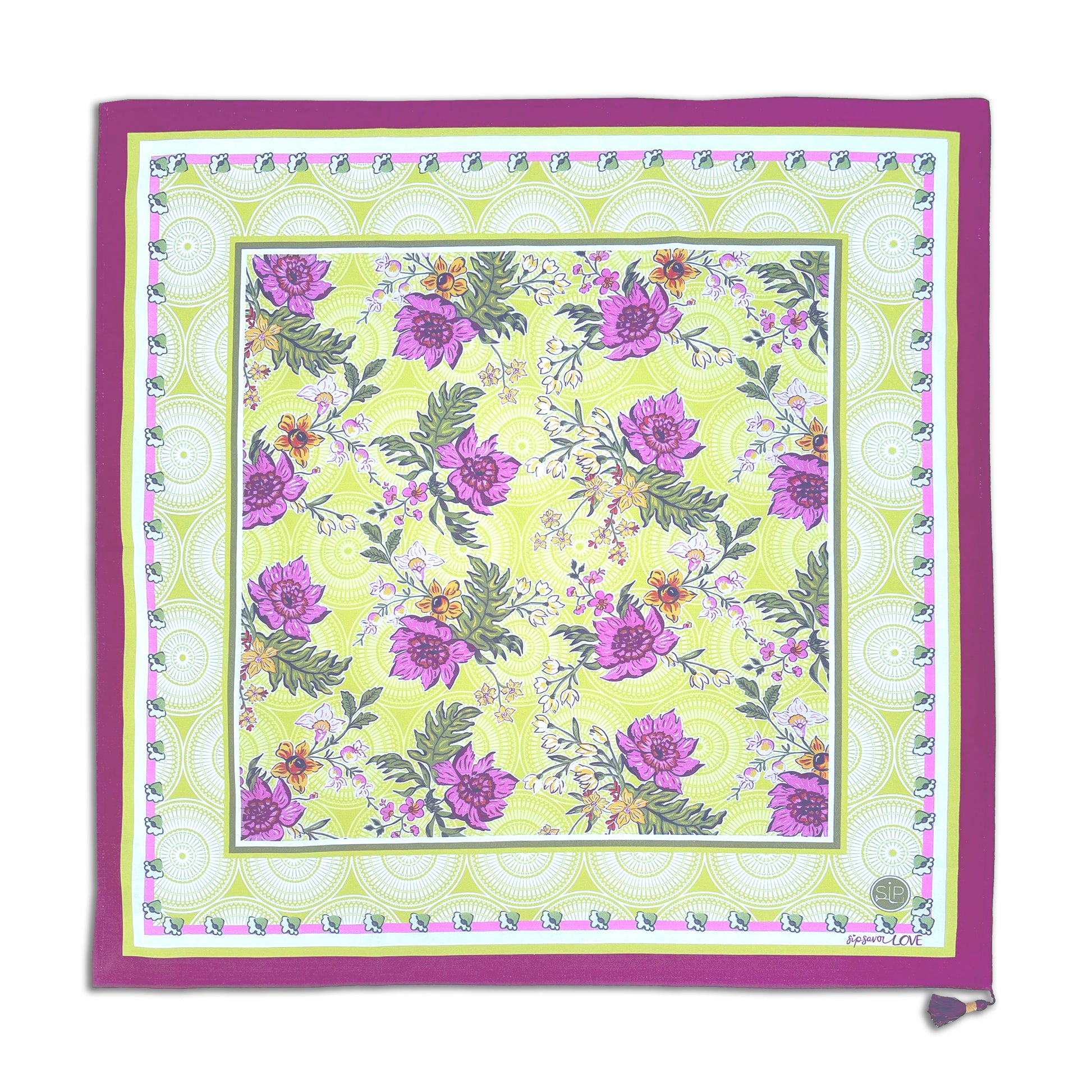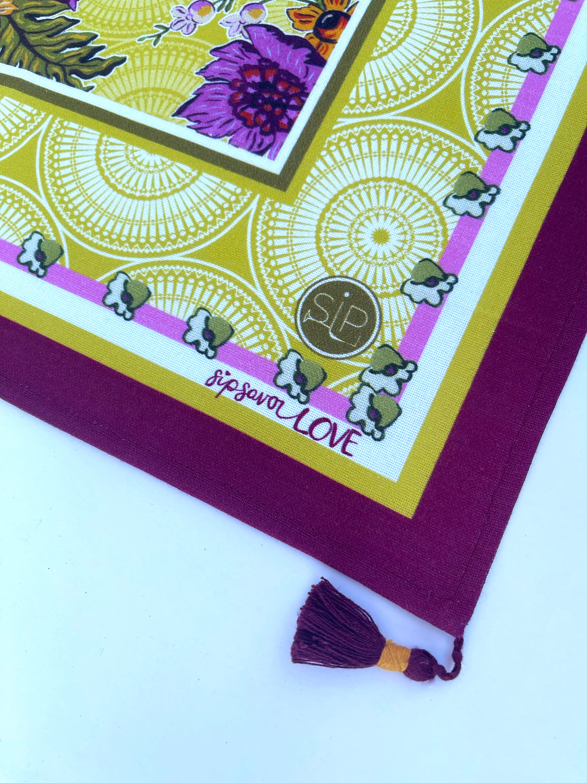 Size 26” x 26”. 100% high grade organic cotton. Beautifully mitered corners. Fun tassels adorn one corner. Natural and long lasting dyes so the colors do not fade after many washings. Color safe.