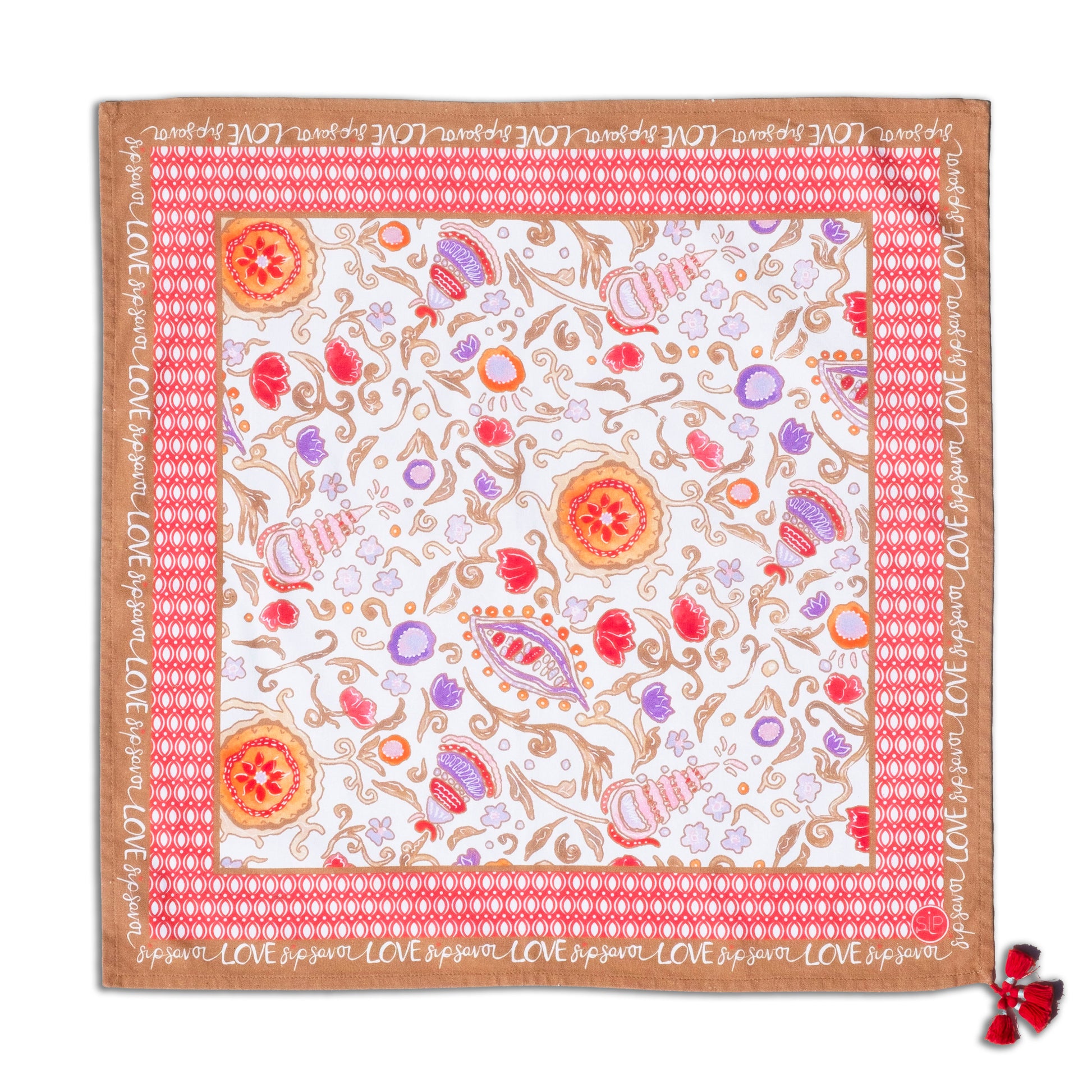 Size 26” x 26”. 100% high grade organic cotton. Beautifully mitered corners. Fun tassels adorn one corner. Natural and long lasting dyes so the colors do not fade after many washings. Color safe.