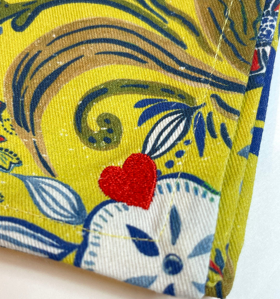 I love how the colors printed on this design. The mix of mustardy yellow with red white and blue is uplifting! Add to that the accent of a red embroidered heart!