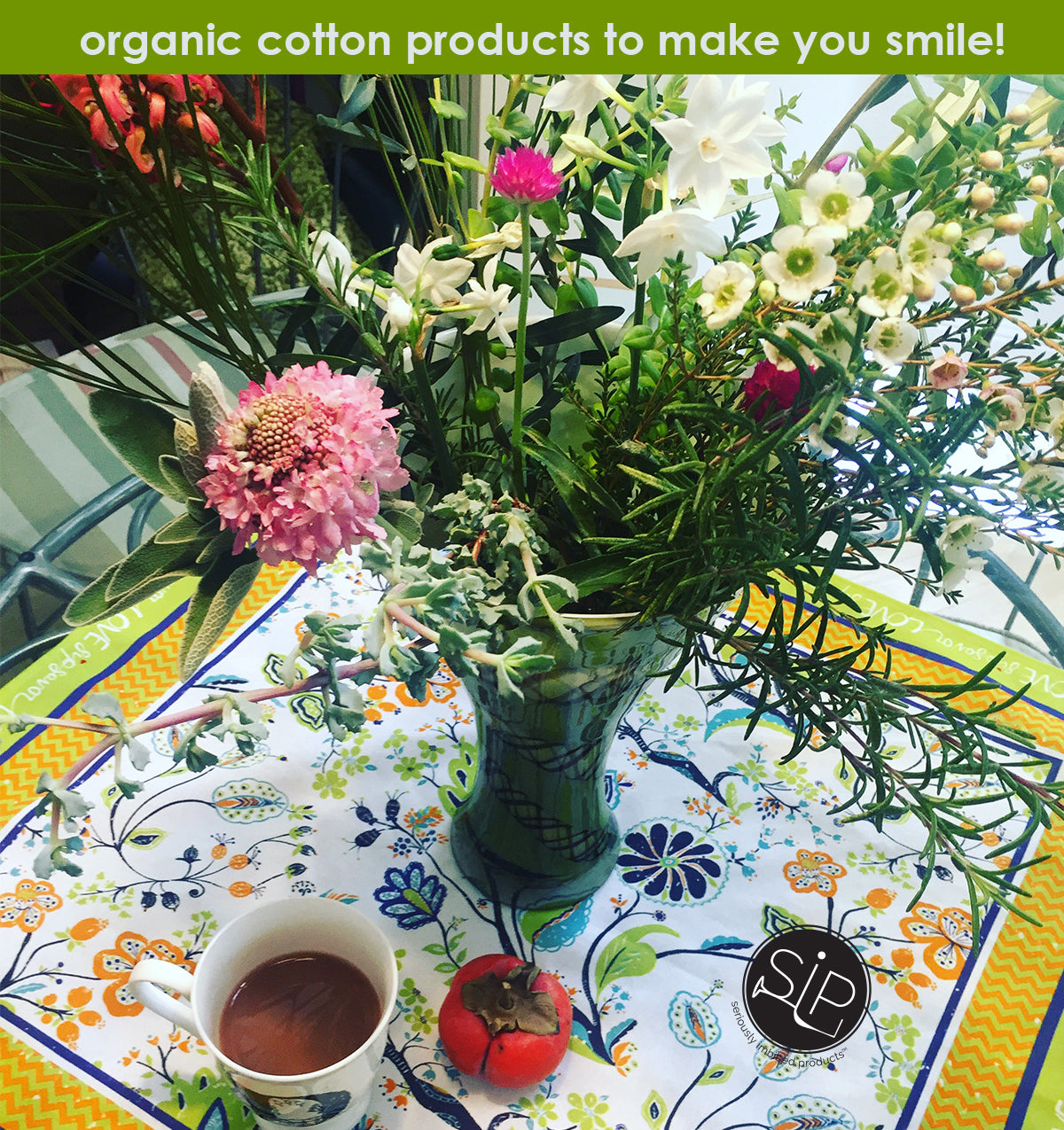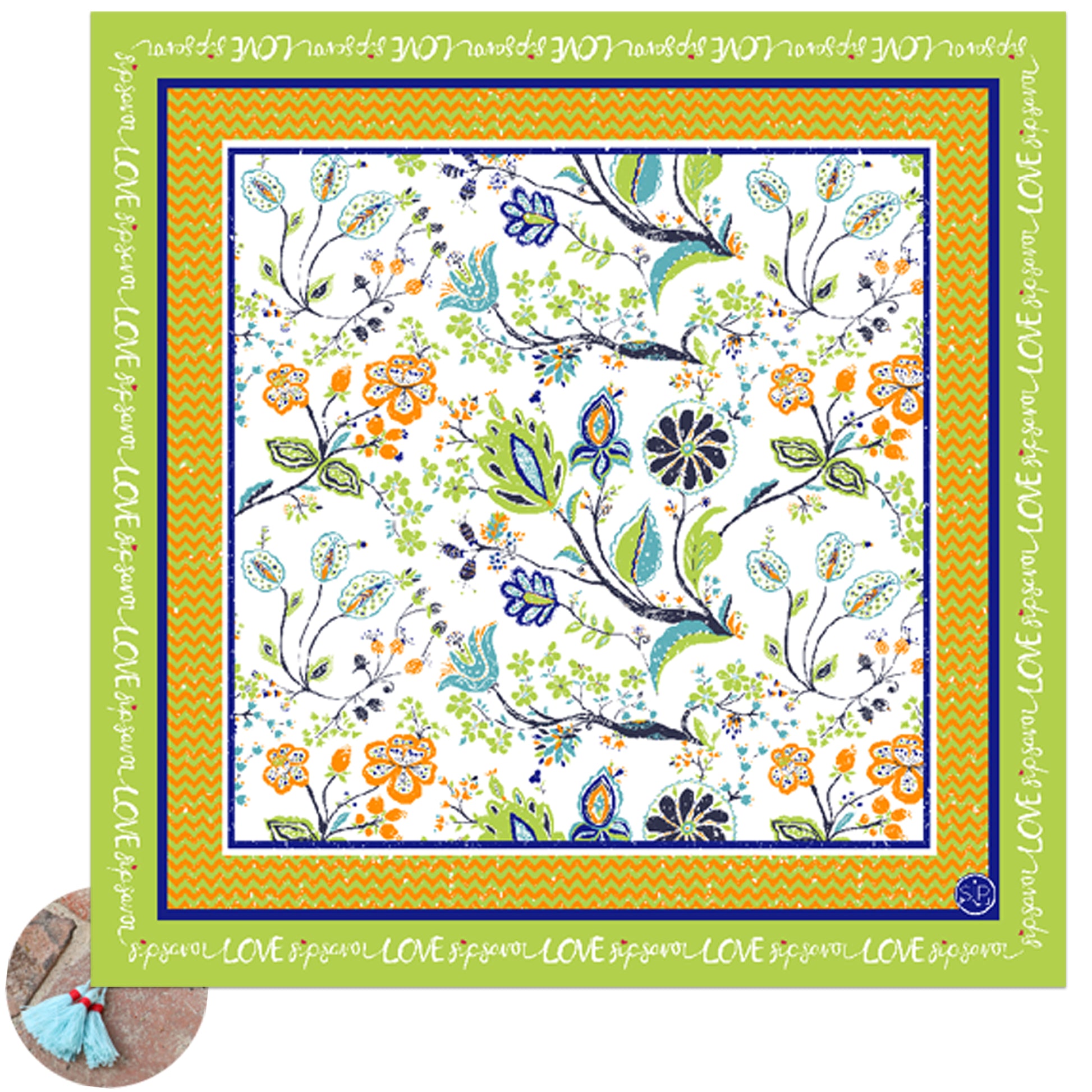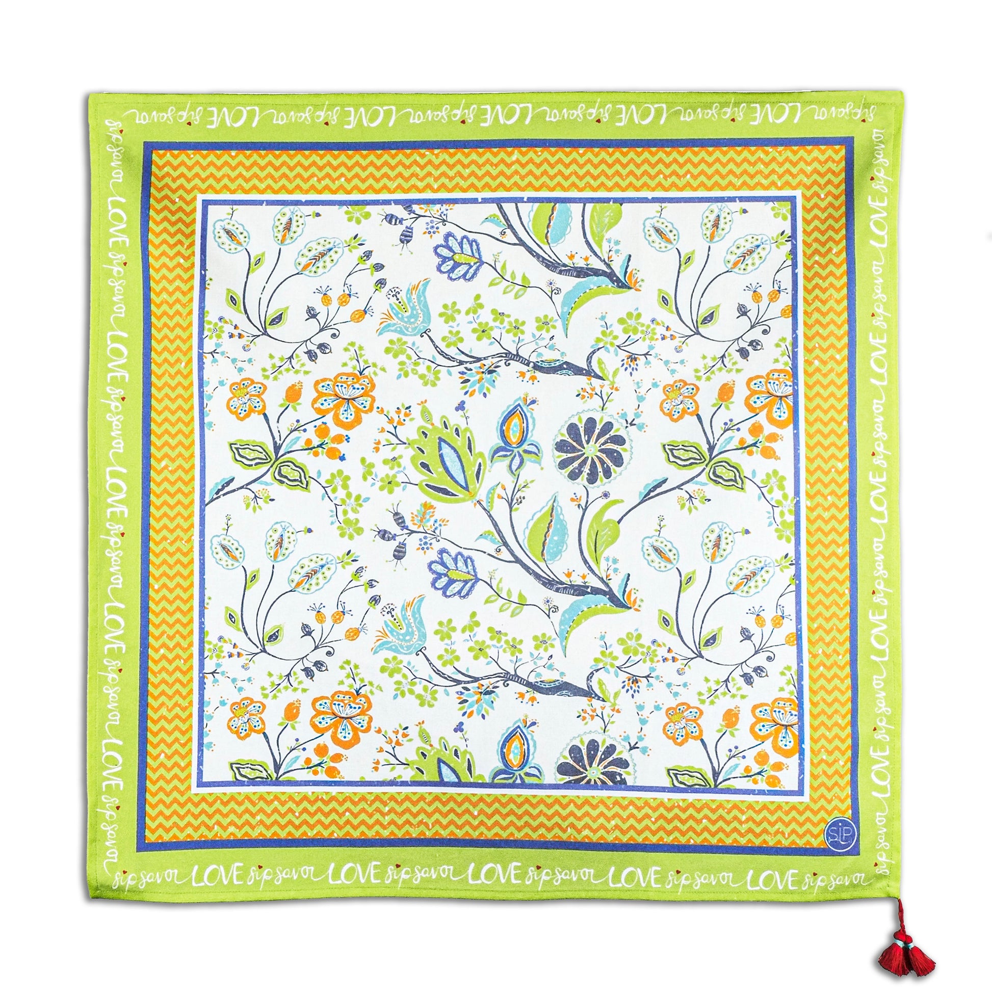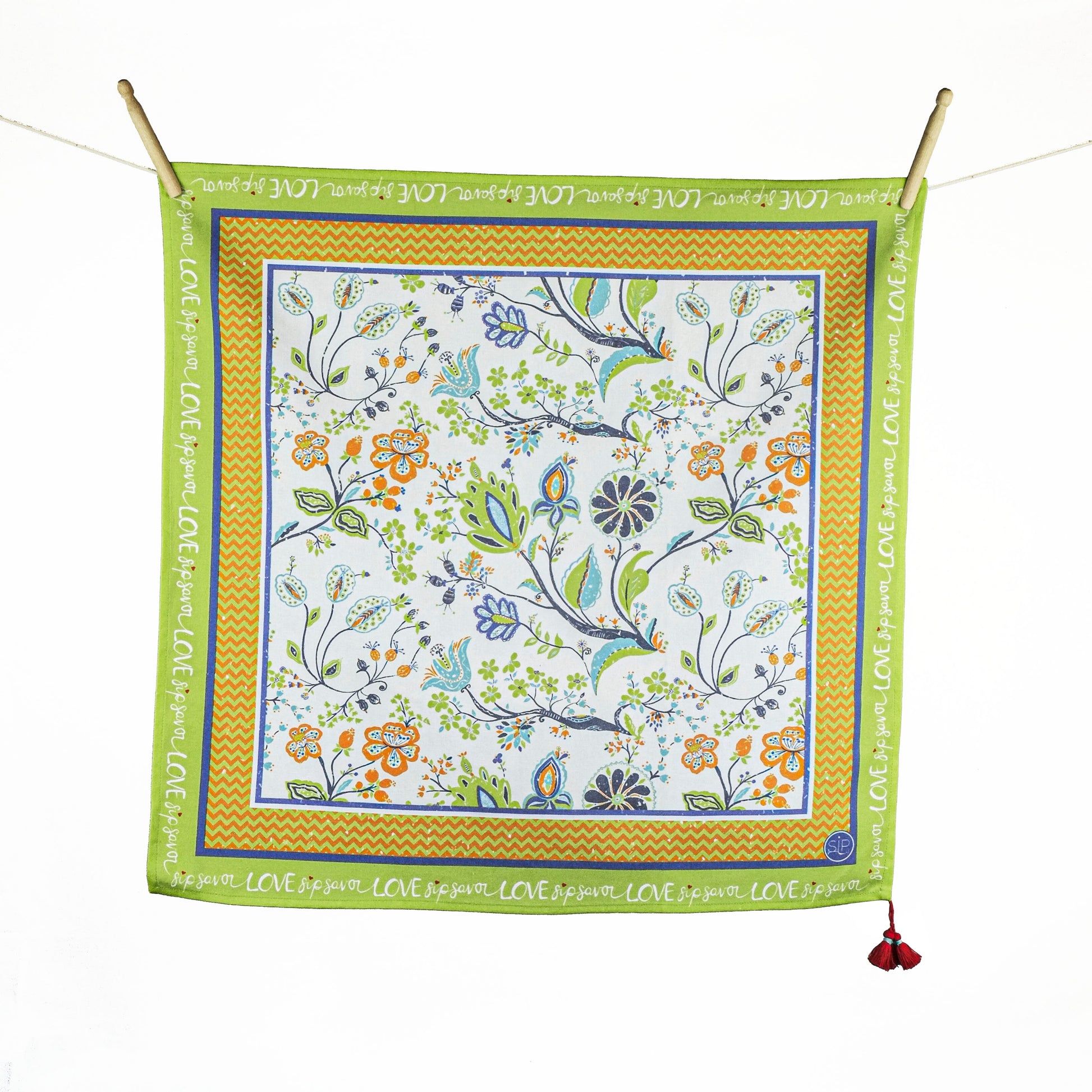 Size 26” x 26”. 100% high grade organic cotton. Beautifully mitered corners. Fun tassels adorn one corner. Natural and long lasting dyes so the colors do not fade after many washings. Color safe.