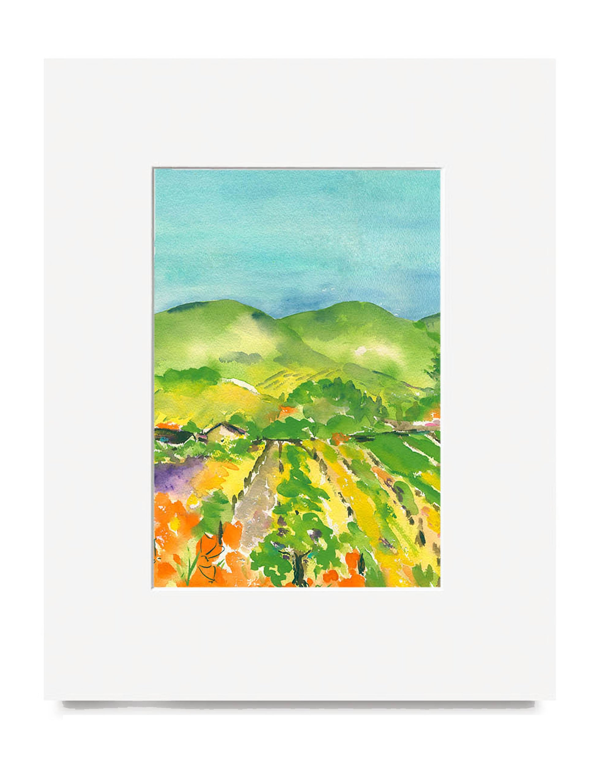There's something amazing about the West Coast Hills and I love to paint them. The continually changing color of the different seasons has dramatic contrasts. I love the bright orange poppies and springtime wild flowers which are juxtaposed against wide blue sky and either verdant green or golden yellow hills. In the Fall, the vineyards are rich with autumnal hues which just take one's breath away. It's lovely to see the resurrection of vineyards that were destroyed during prohibition times. I hope the stillness and calm of these watercolors reminds you of your time appreciating this beauty.