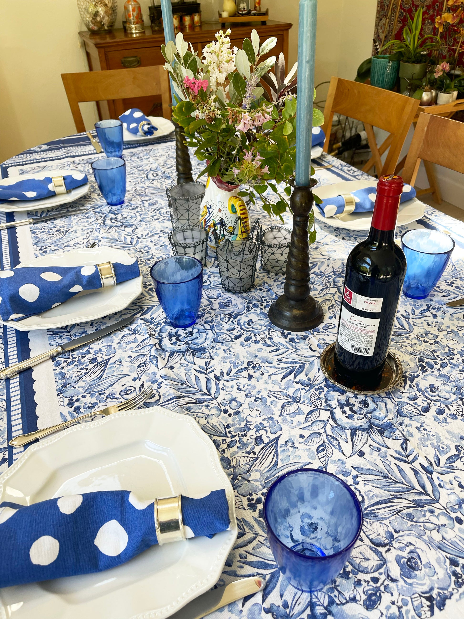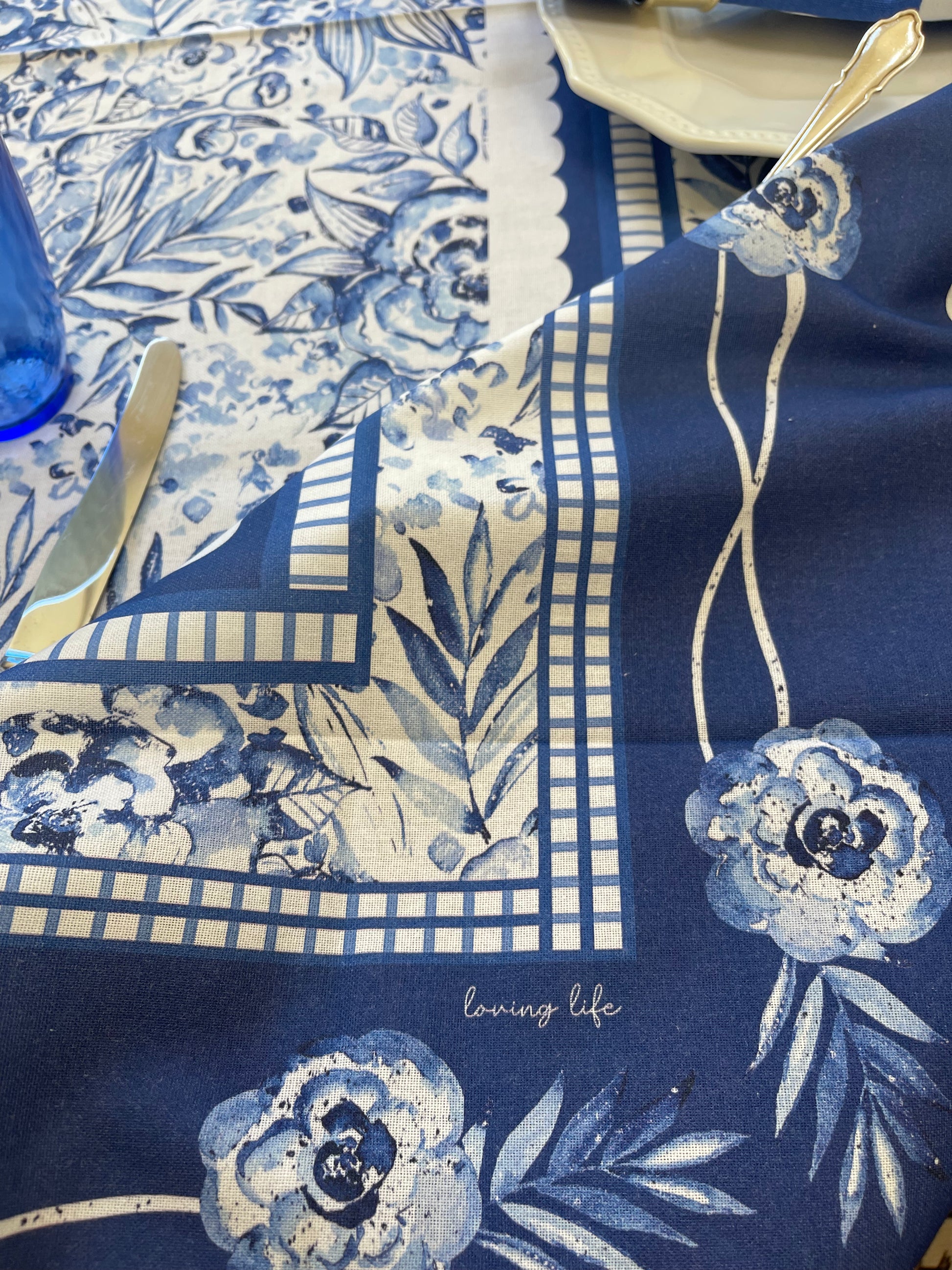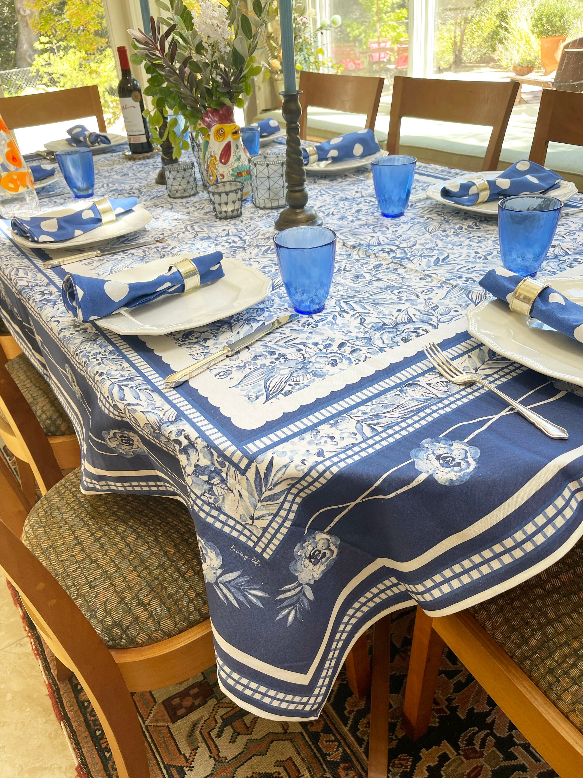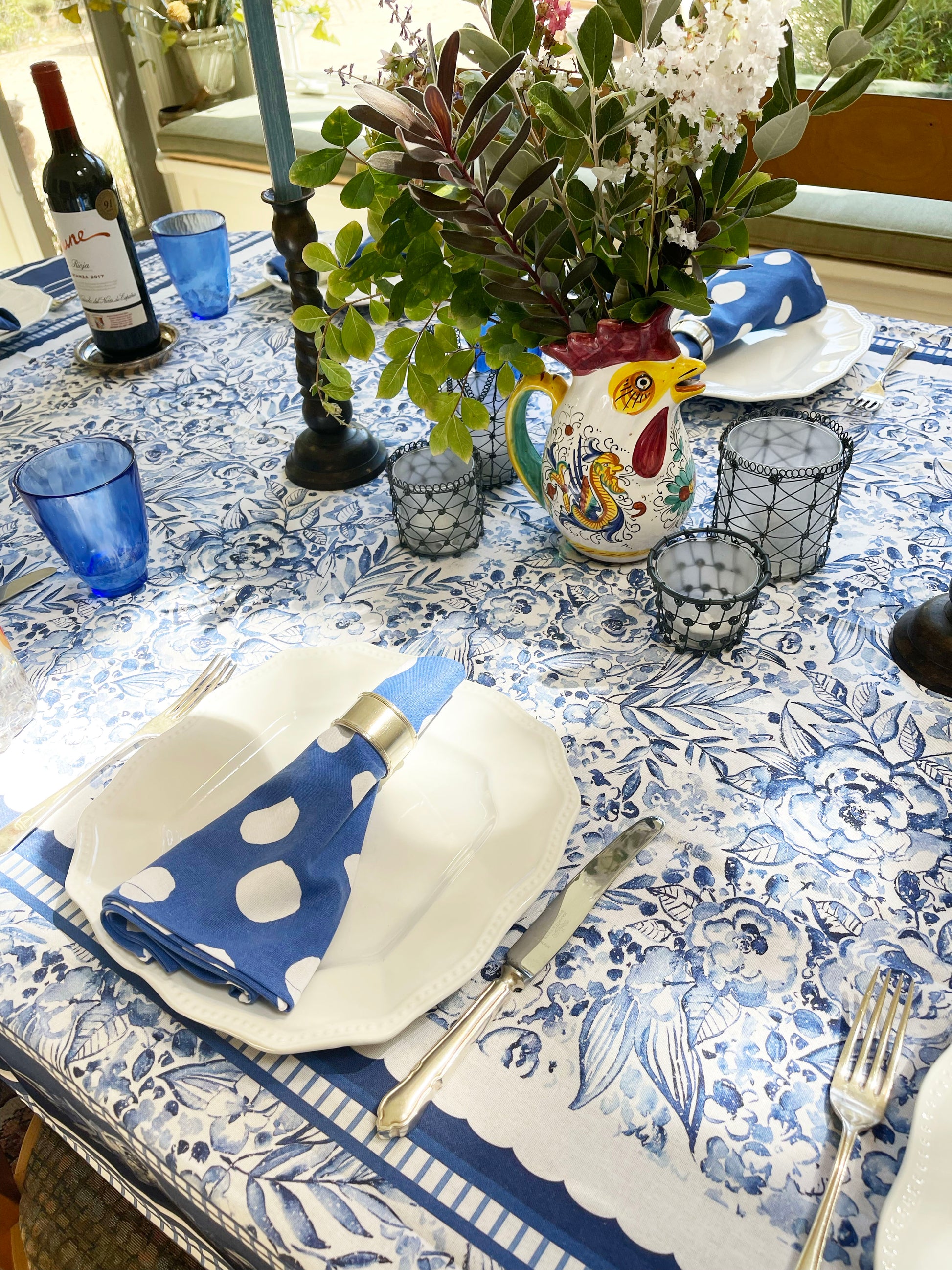 My customers have loved my Flourish runner and the fresh look blue and white give to a table. There were many requests for a tablecloth so here it is!