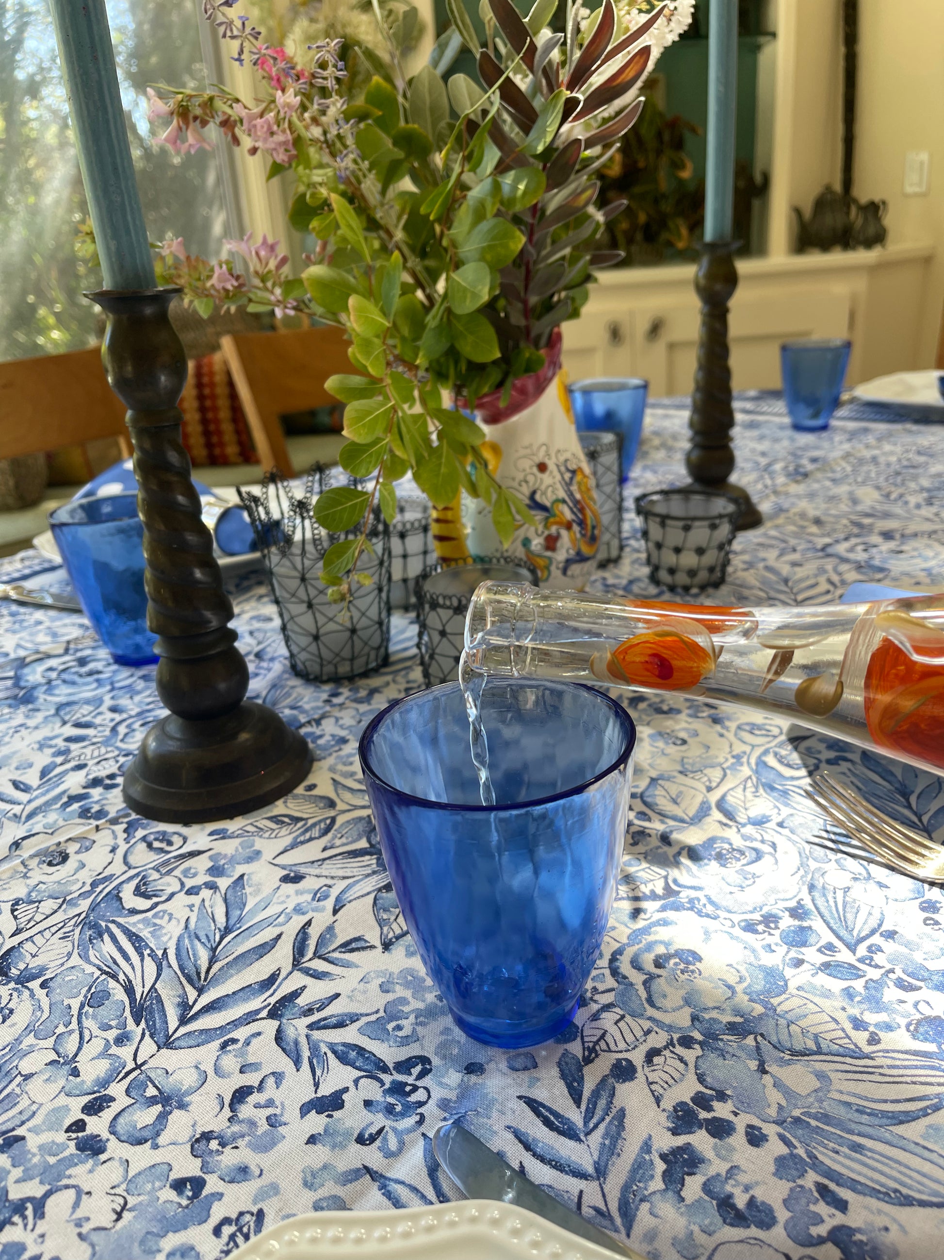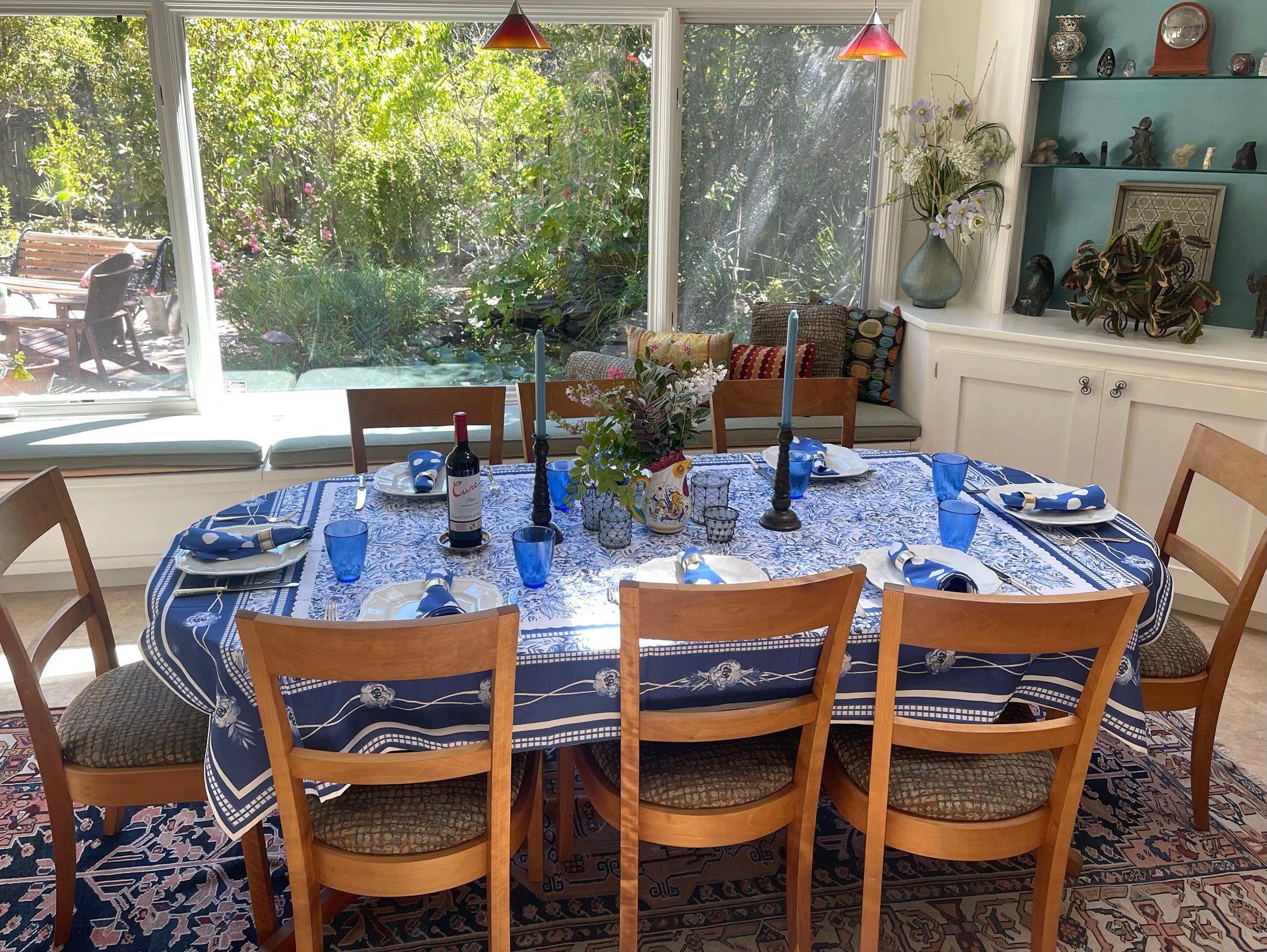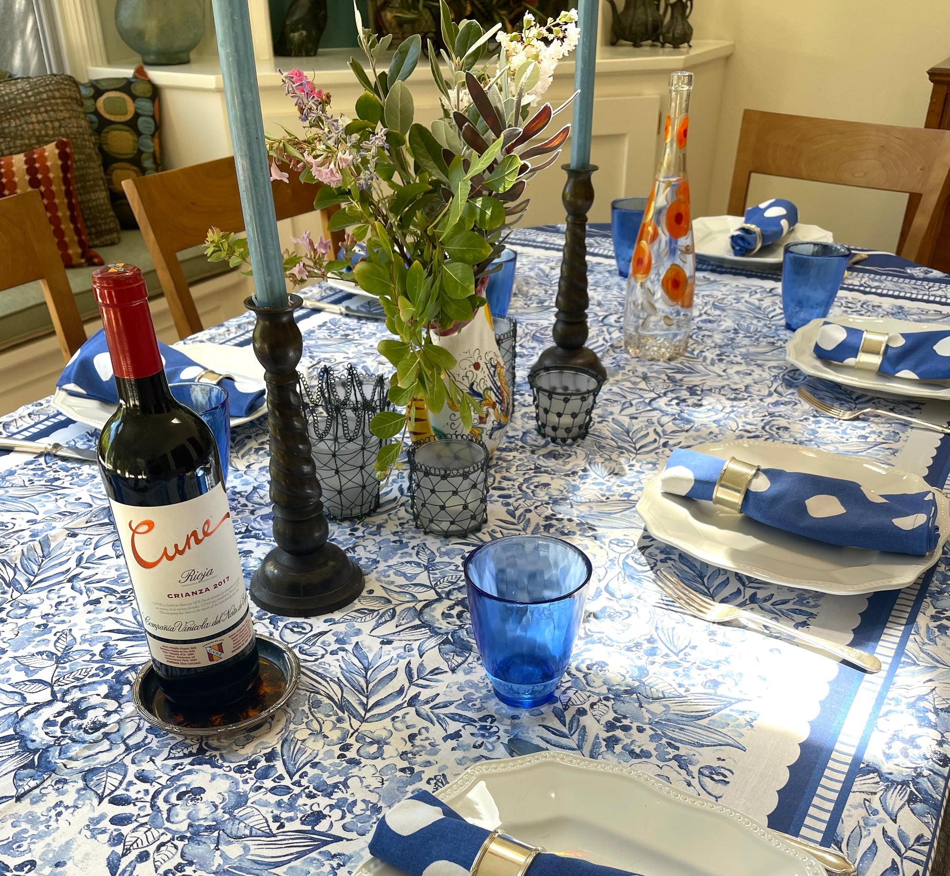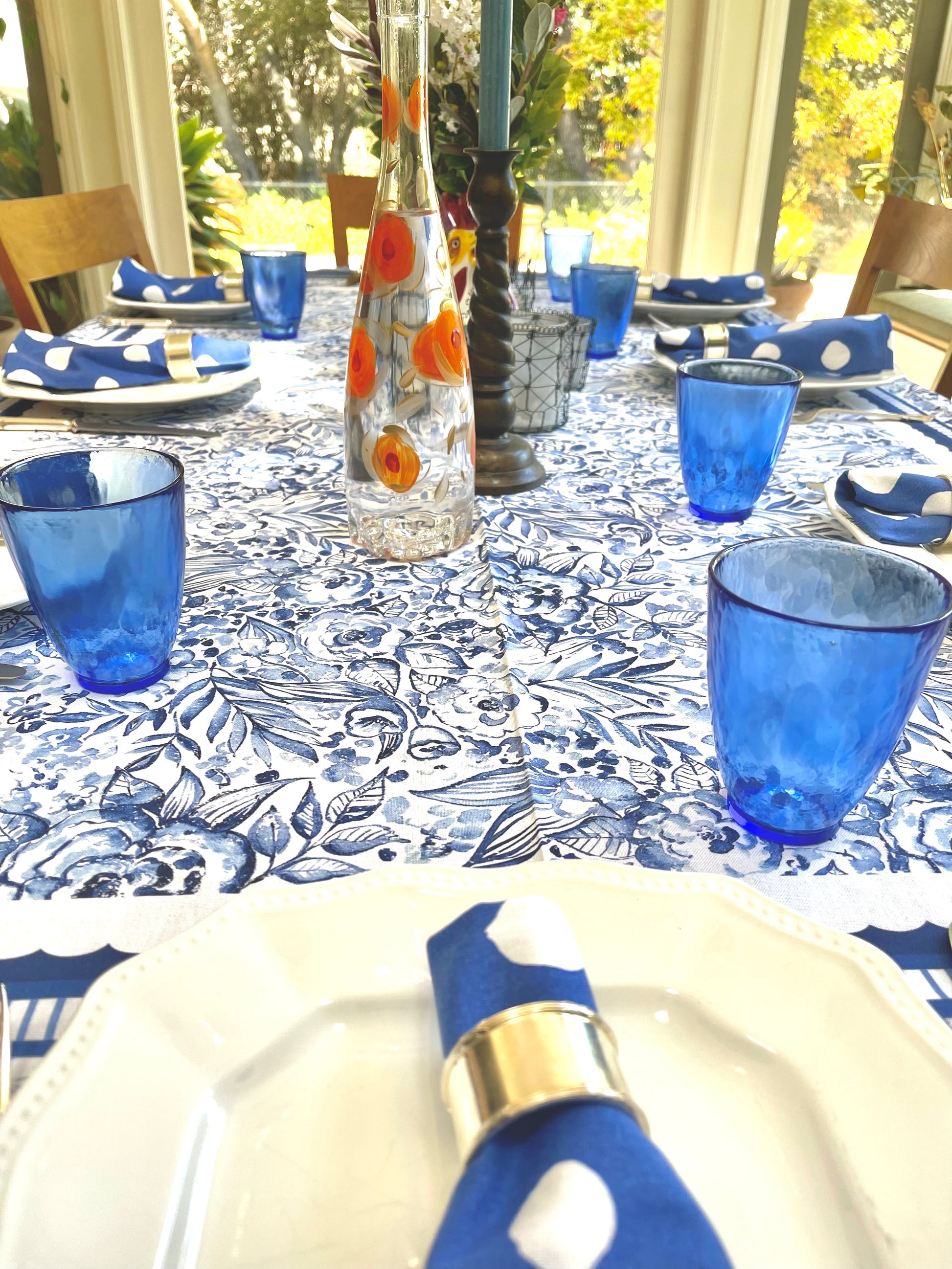 My customers have loved my Flourish runner and the fresh look blue and white give to a table. There were many requests for a tablecloth so here it is!