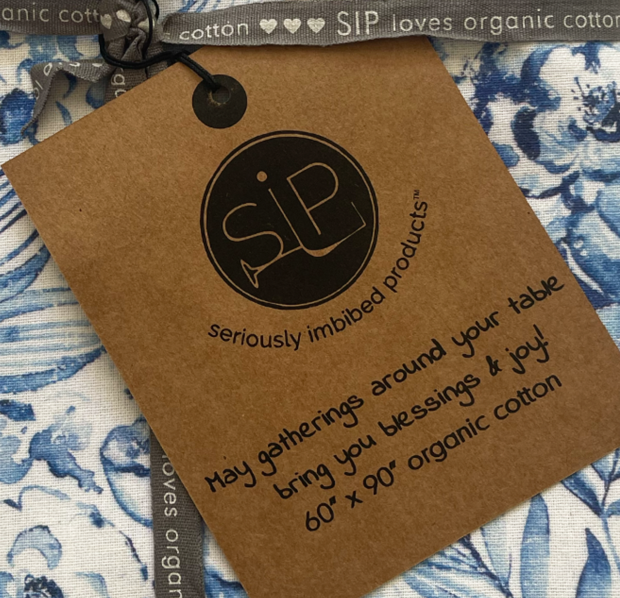 60" x 90" organic cotton tablecloth with beautifully mitered corners.