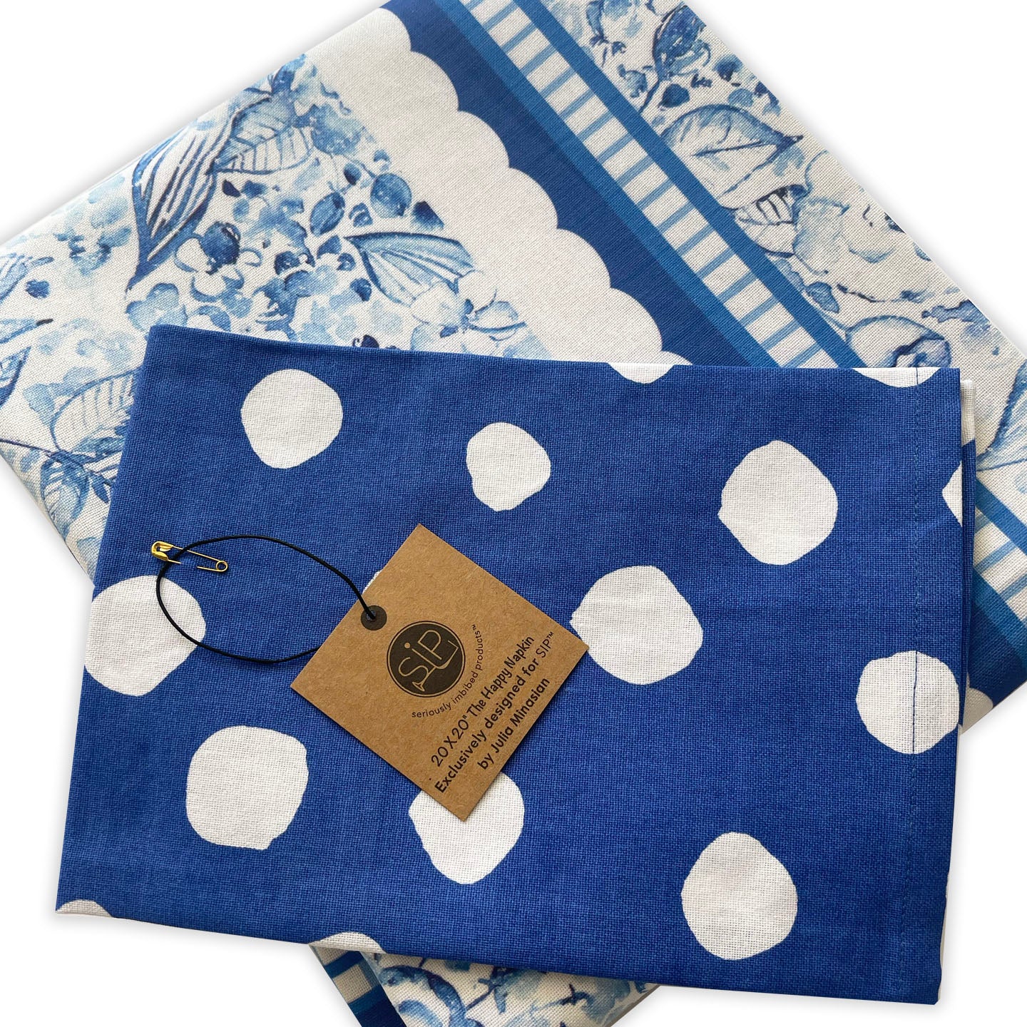 There are coordinating Flourish napkins (available separately) with a white polka dot on a matching blue.