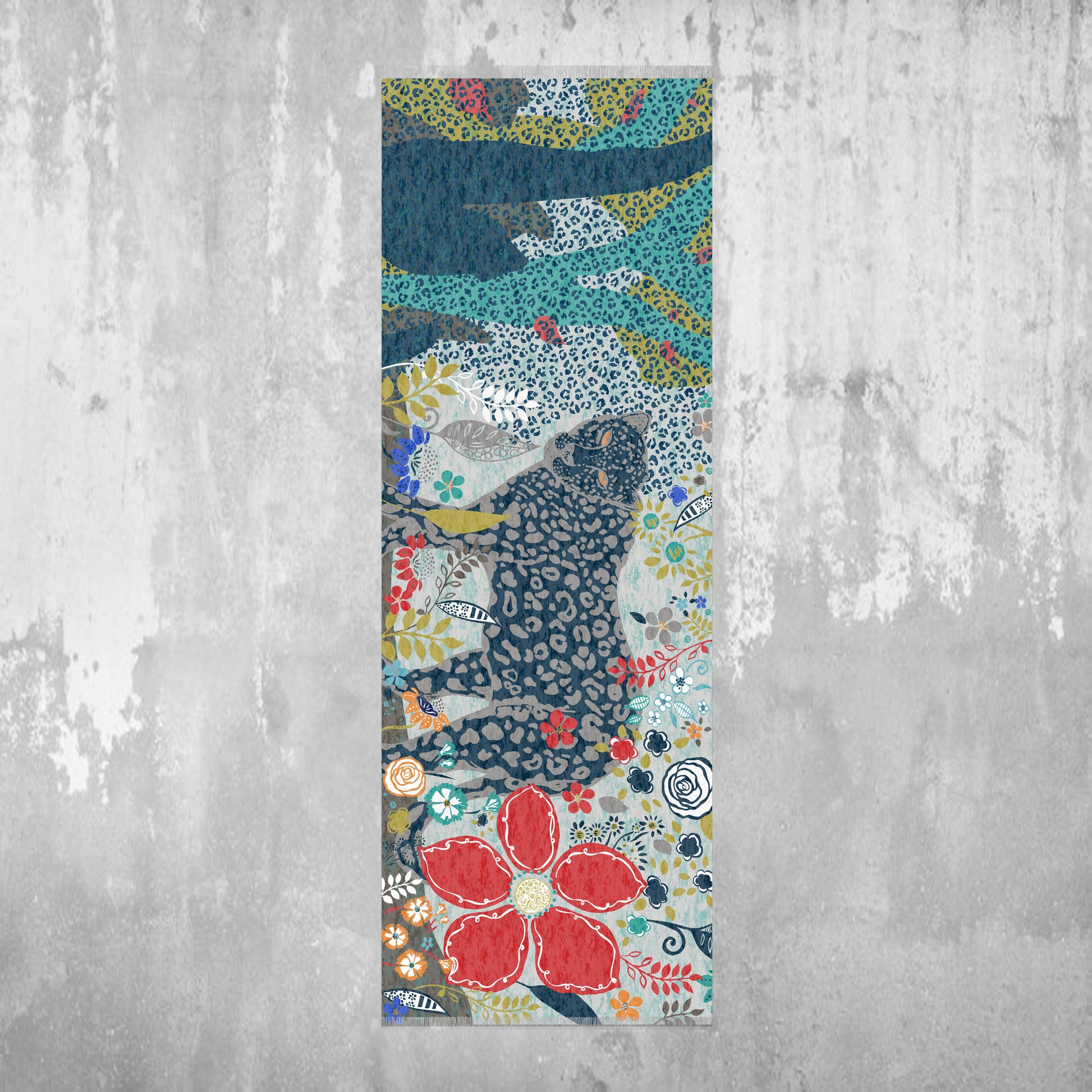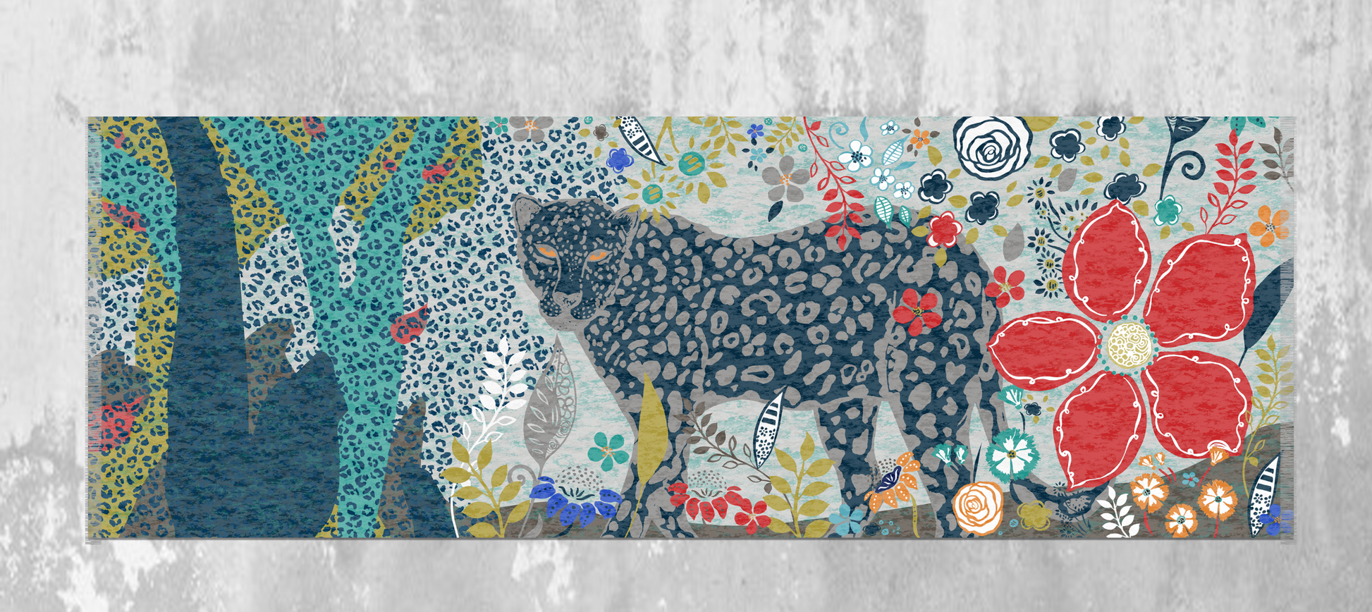 "Garden Prowl" is based on my watercolor artwork. It is inspired by my love/facination with big cats. It is made entirely with organic cotton and is light weight, soft and drapes nicely. It is also breathable and comfortable to wear. The simple comb fringe adds a sophisticated style.