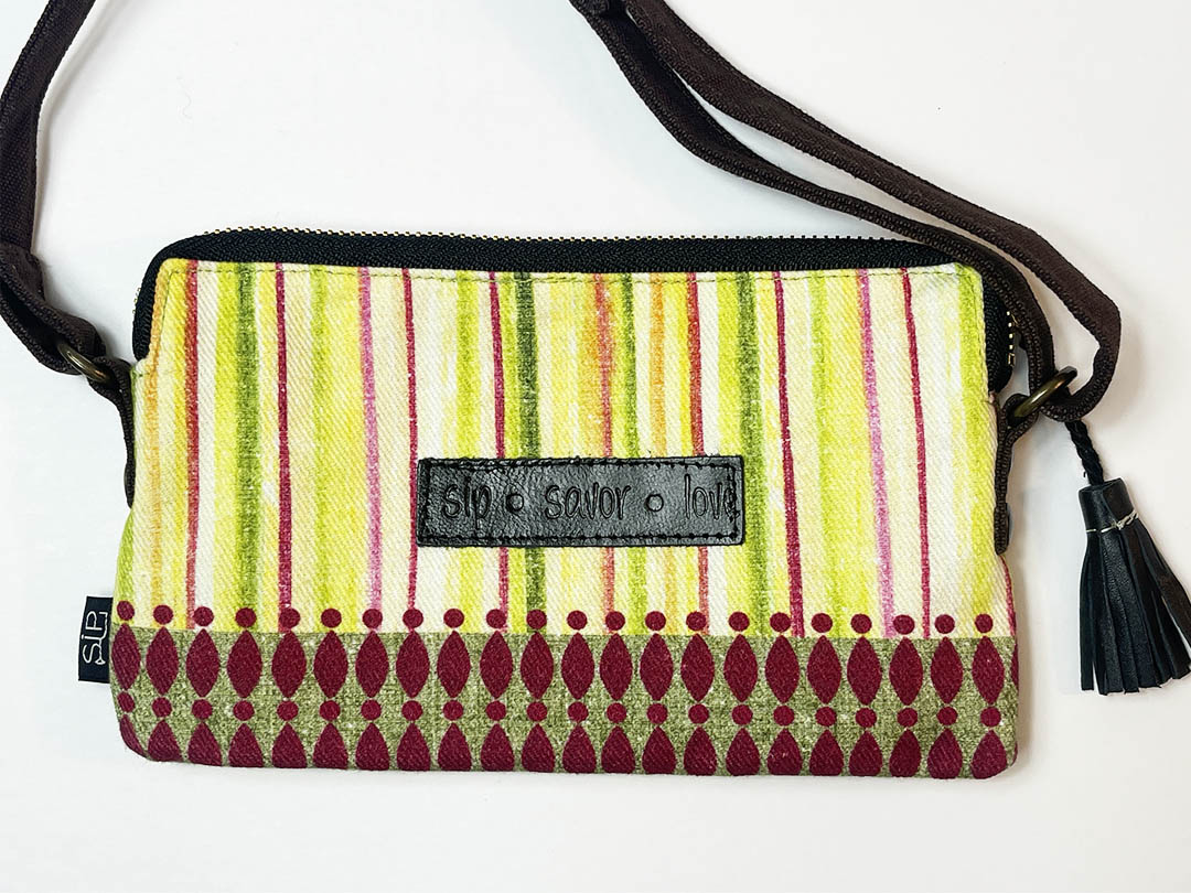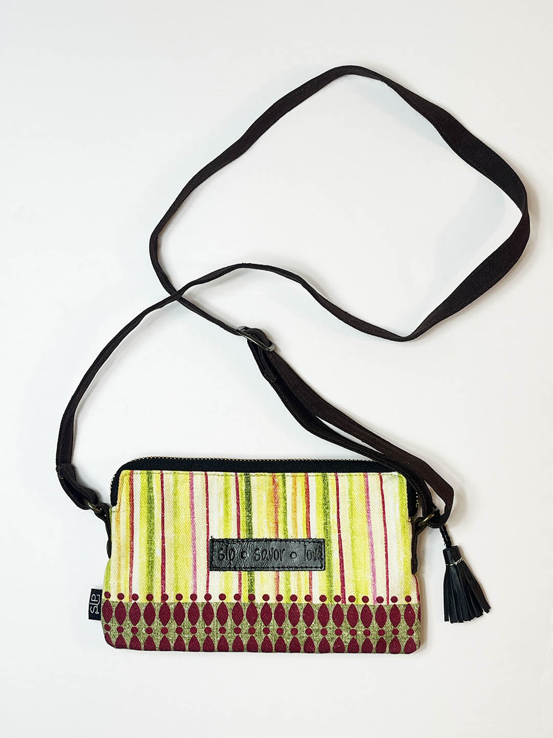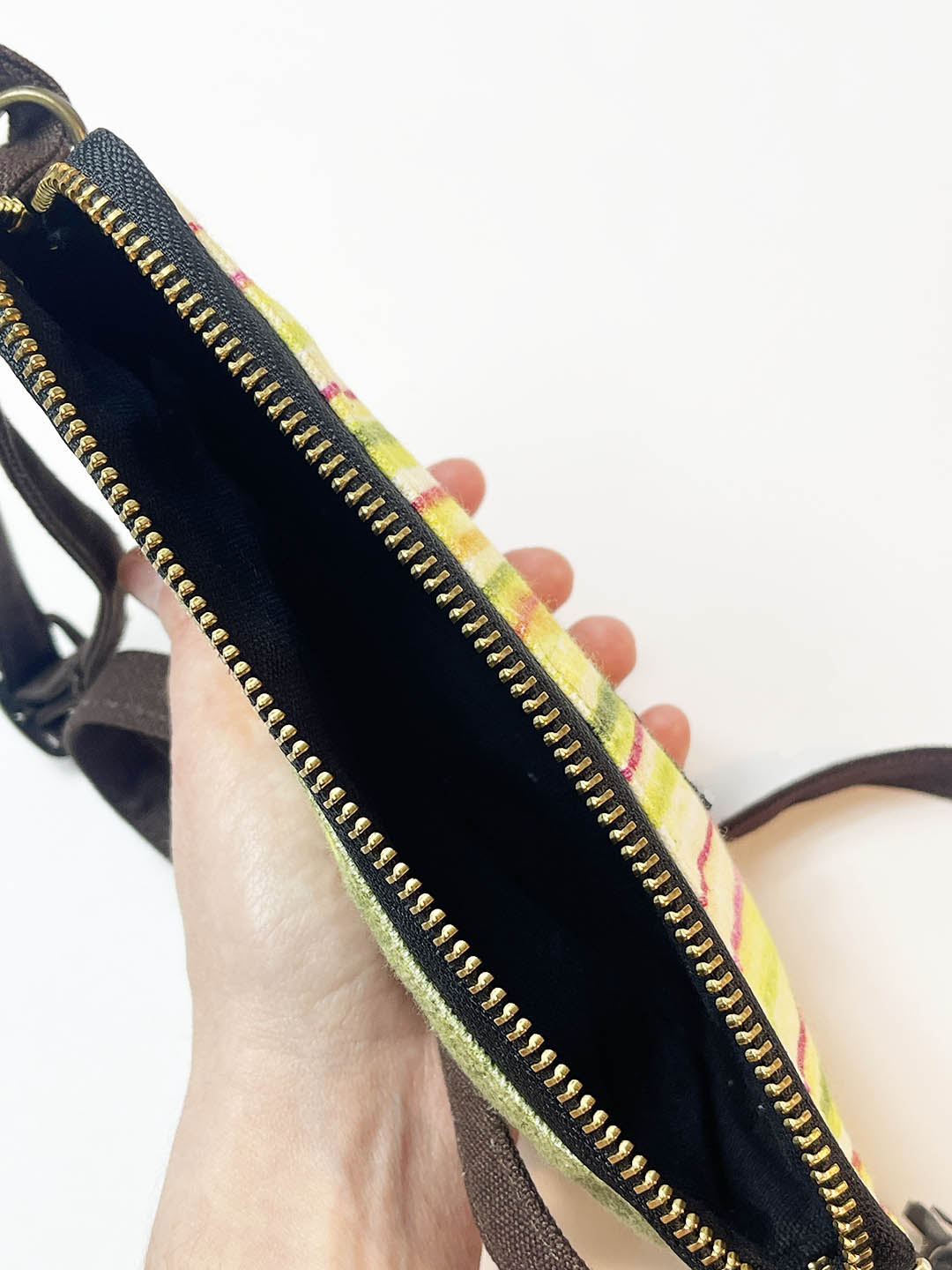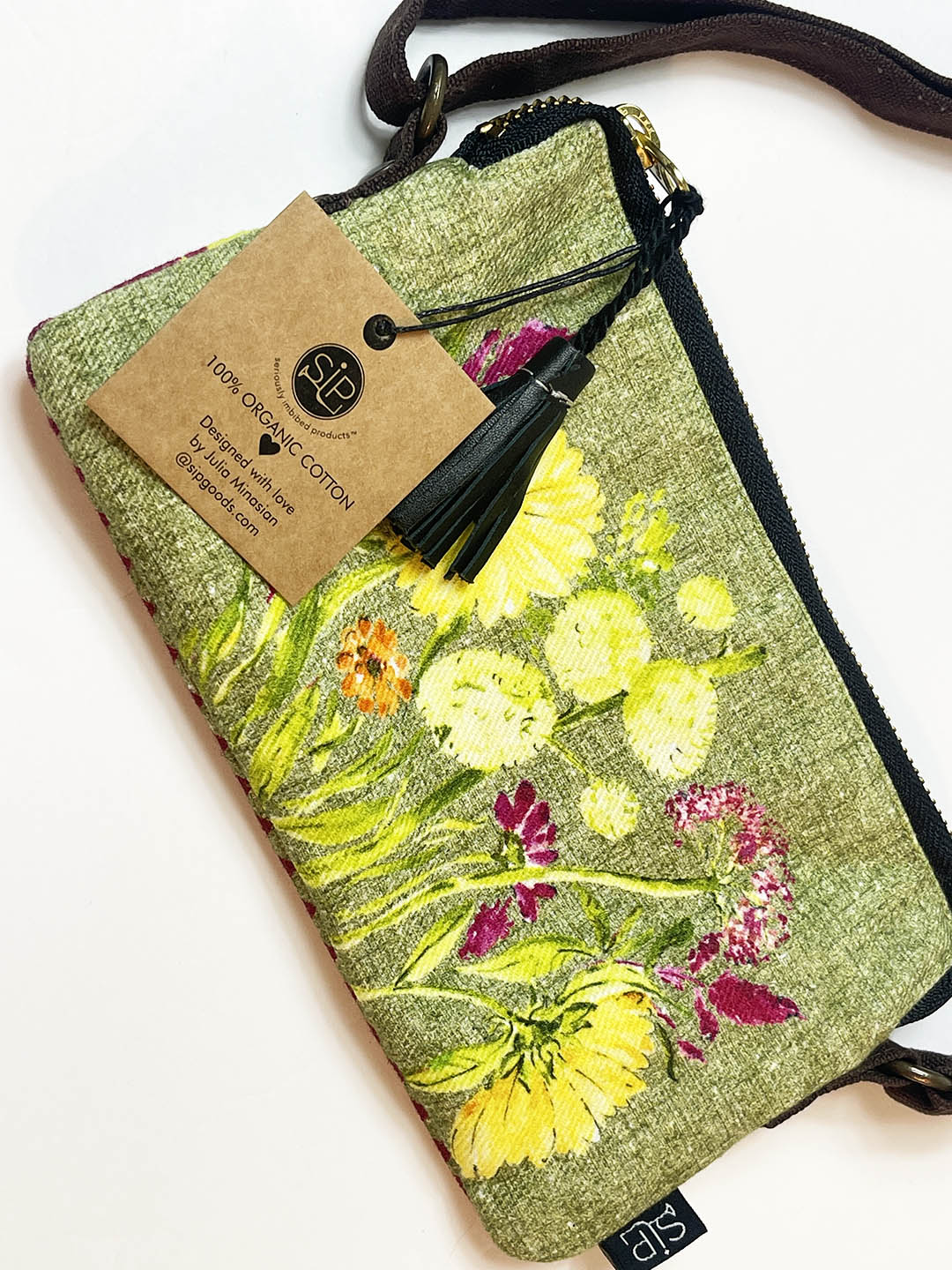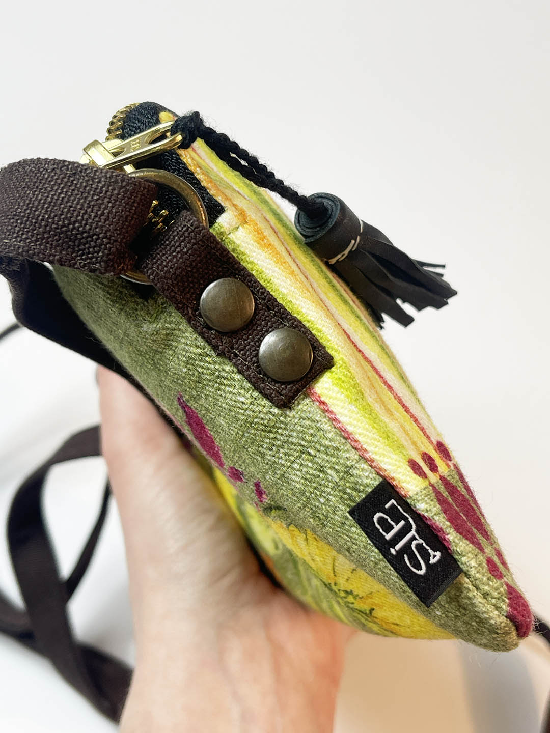 This is a fun cross body bag designed to hold a mobile phone and a few other essentials so you can be hands free when out and about. The straps are made from organic cotton canvas to look like leather. The inside is fully lined in black organic cotton and the zipper is stylishly chunky and high end. There's an added leather tassel and a leather tag with our company motto 'sip savor love'. Also there is a small woven tag on the side that gives a shout out to my brand name!