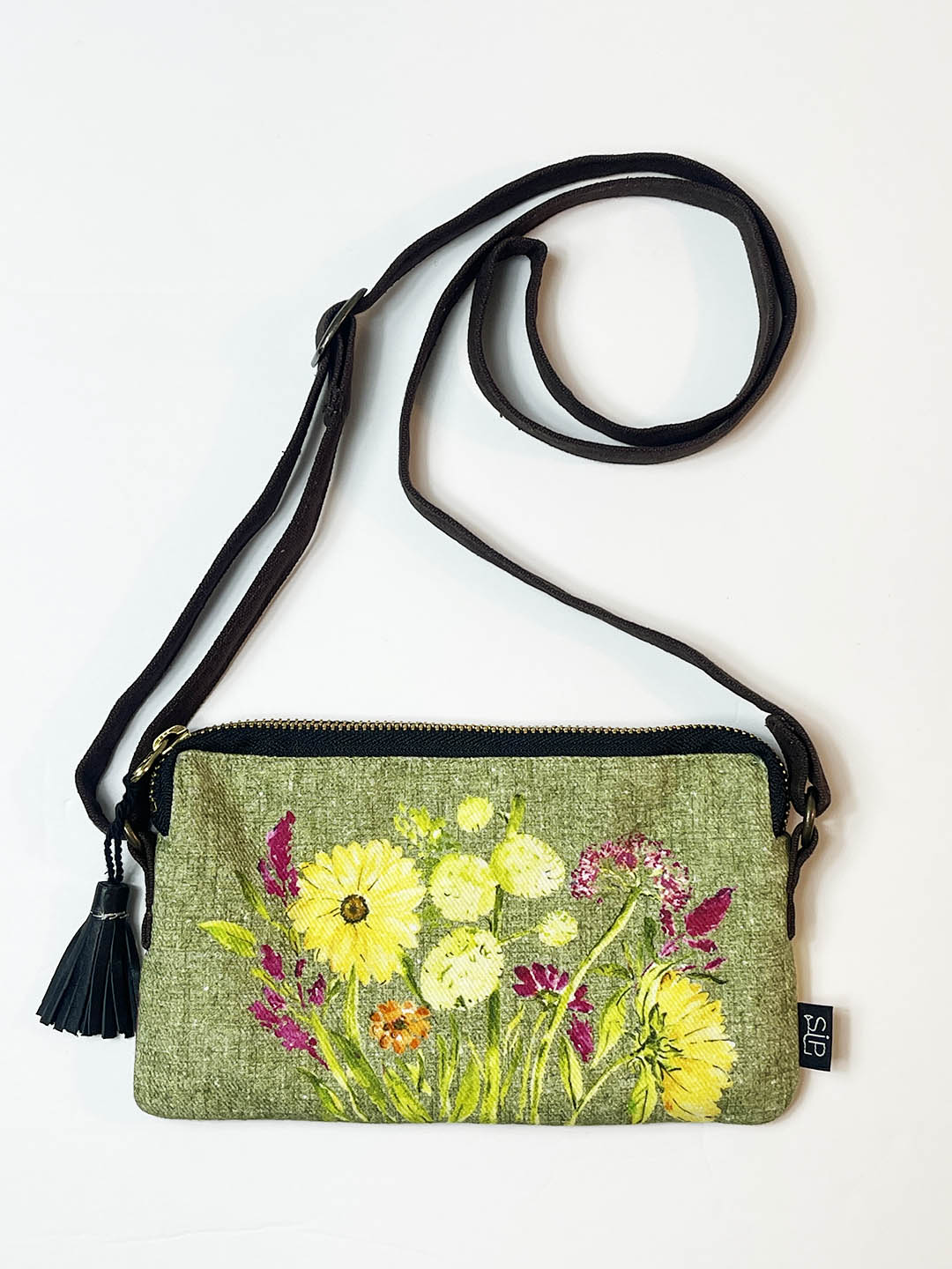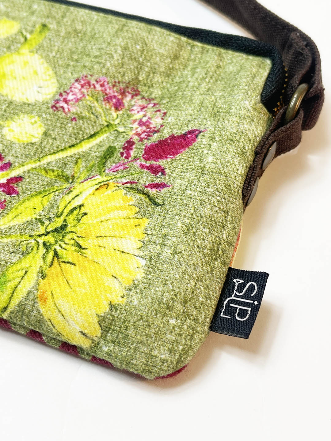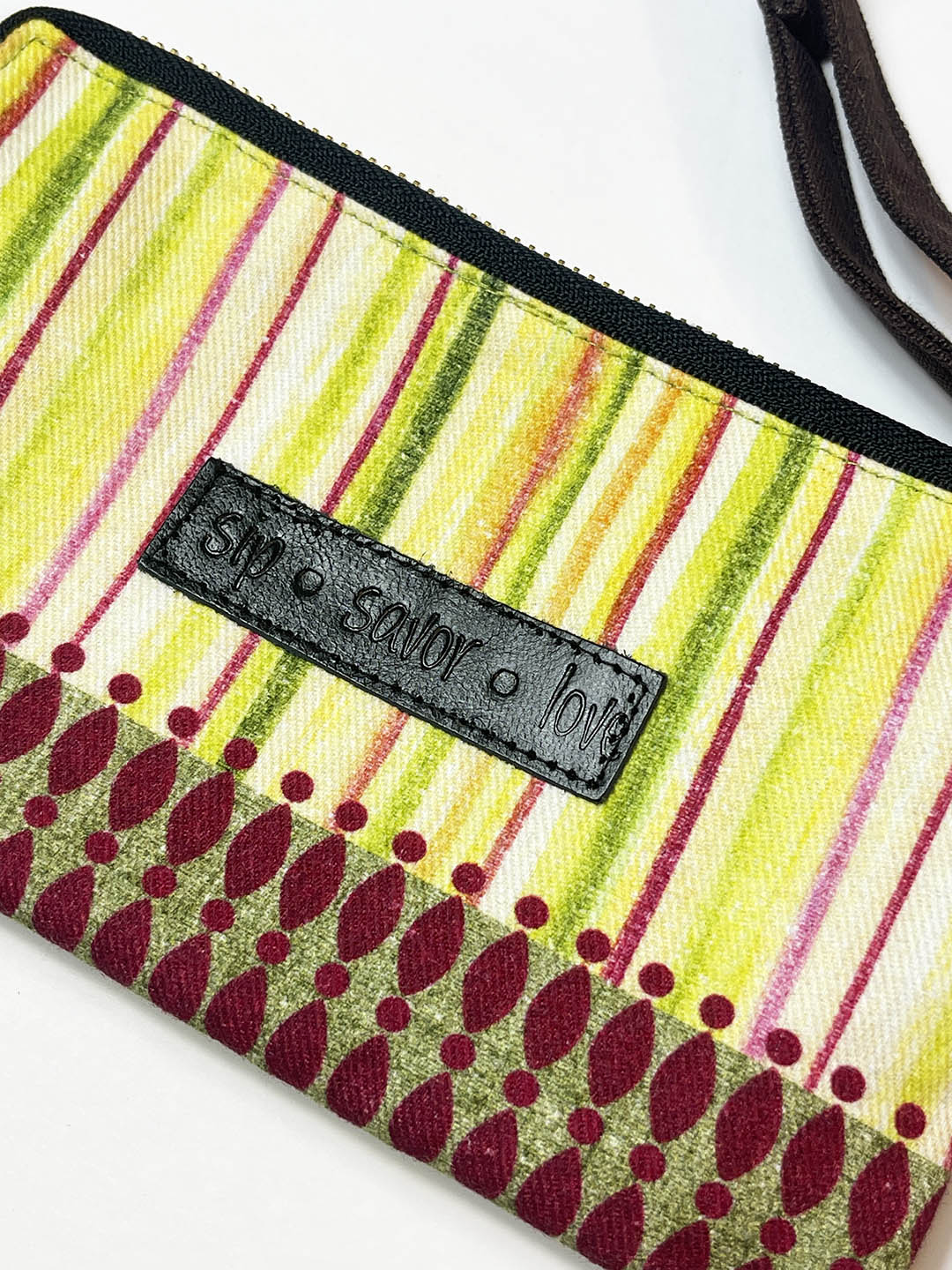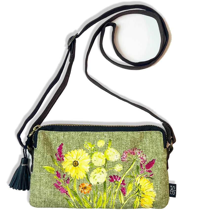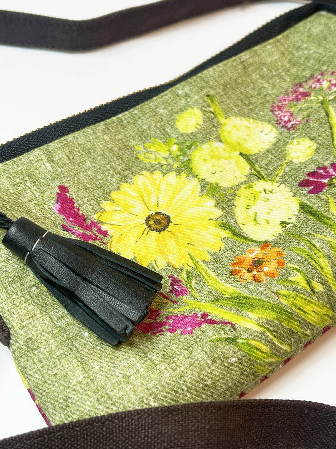 This is a fun cross body bag designed to hold a mobile phone and a few other essentials so you can be hands free when out and about. The straps are made from organic cotton canvas to look like leather. The inside is fully lined in black organic cotton and the zipper is stylishly chunky and high end. There's an added leather tassel and a leather tag with our company motto 'sip savor love'. Also there is a small woven tag on the side that gives a shout out to my brand name!