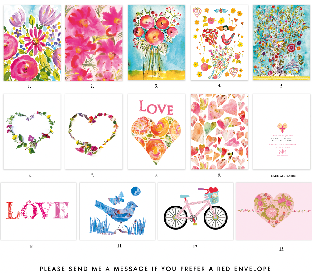 These are all a part of my Cards to Make You Smile Collection. If you prefer a red envelope please send me a message.