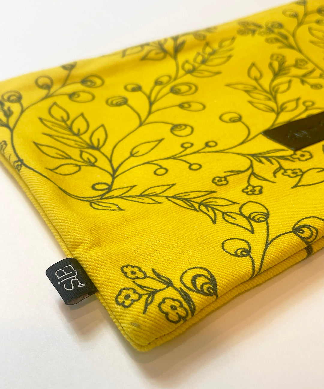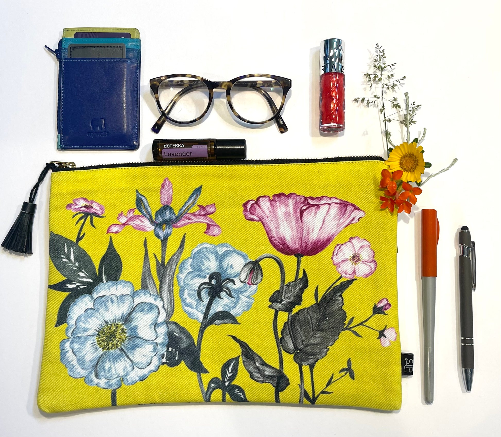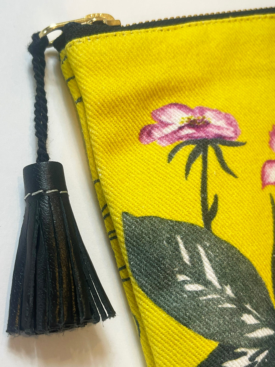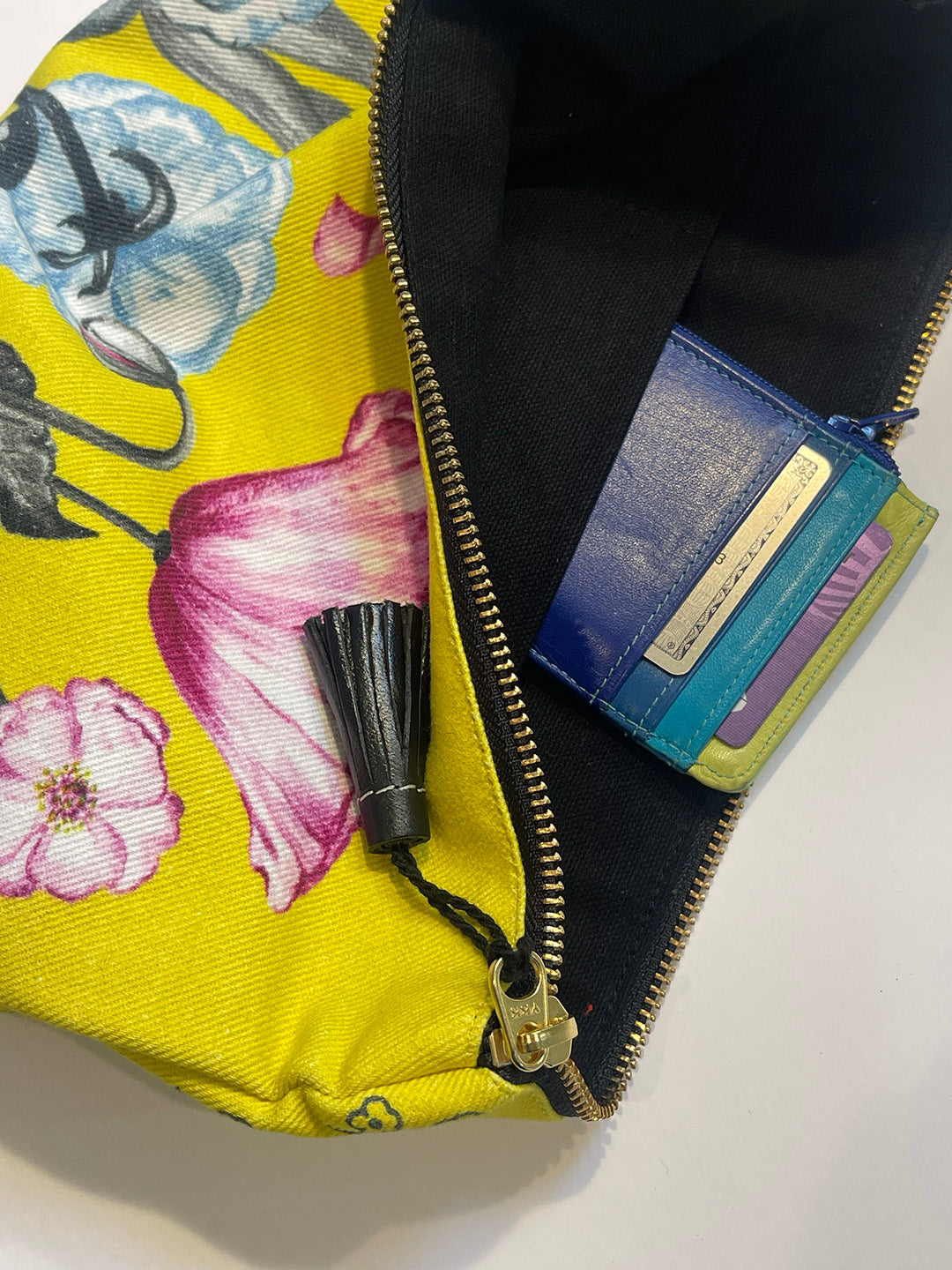 Size approx 12.5” x 8.5”. 100% high grade organic cotton. Quality construction, leather tassel, leather embossed tag (with my company motto to remind us to SIP SAVOR and LOVE), extra quality chunky gold zipper. Inside pockets. Reverse of bag is a contrast print. Please note that the inside lining is not waterproof. It is washable.