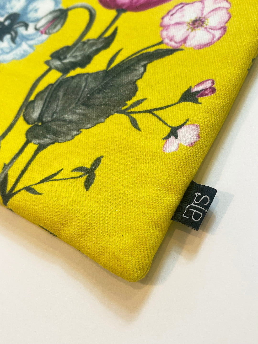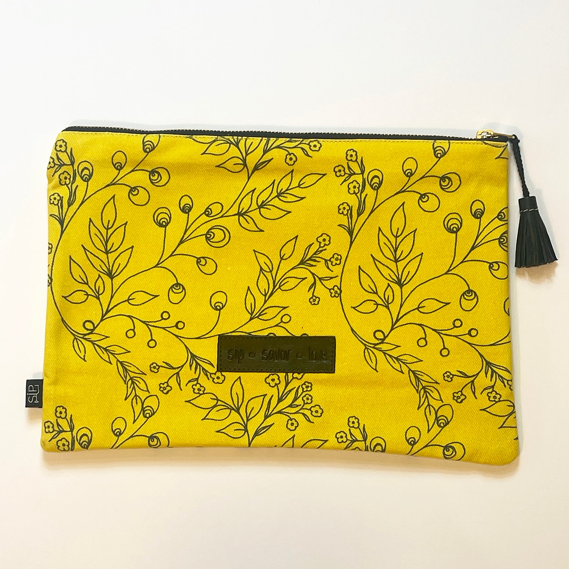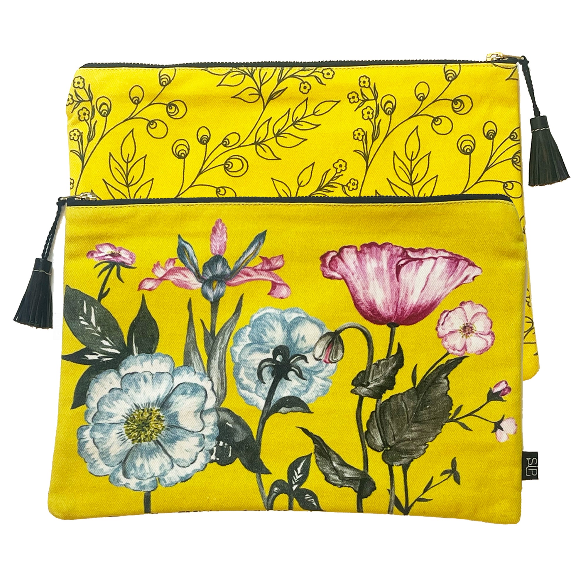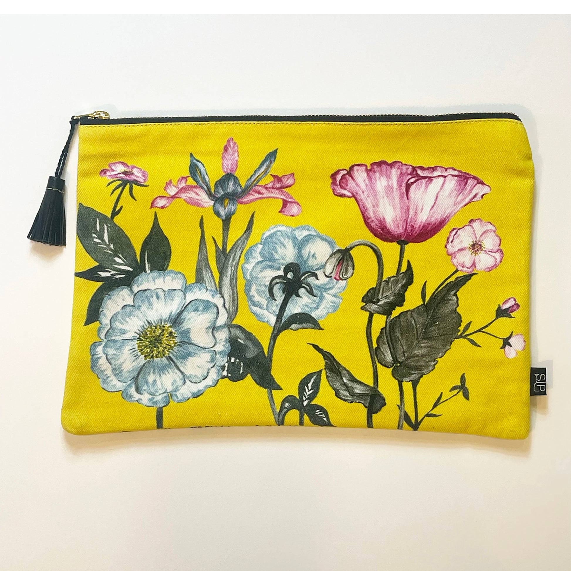 Size approx 12.5” x 8.5”. 100% high grade organic cotton. Quality construction, leather tassel, leather embossed tag (with my company motto to remind us to SIP SAVOR and LOVE), extra quality chunky gold zipper. Inside pockets. Reverse of bag is a contrast print. Please note that the inside lining is not waterproof. It is washable.