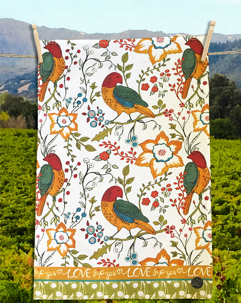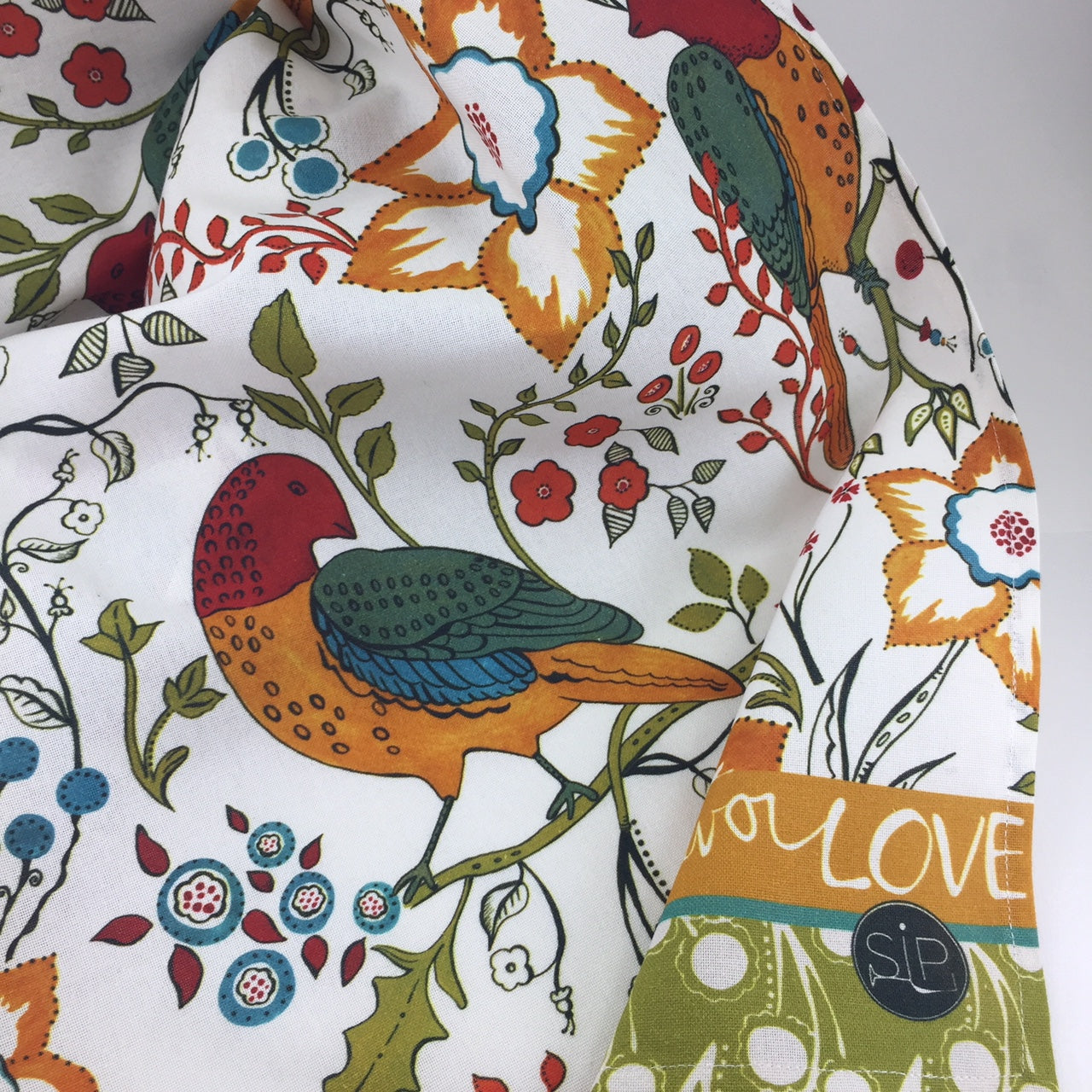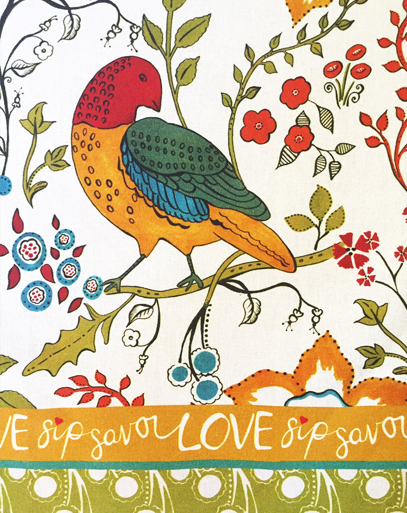 This towel is inspired by both my love of birds and their song in the garden. It is painted with watercolors and then the scanned icons are repeated in a pattern. I wanted this design to have a traditional feel but with a twist. I called this 'Jungle Song' but in retrospect wish I had called it 'Garden Song' as the birds feel more English country garden than jungle!
