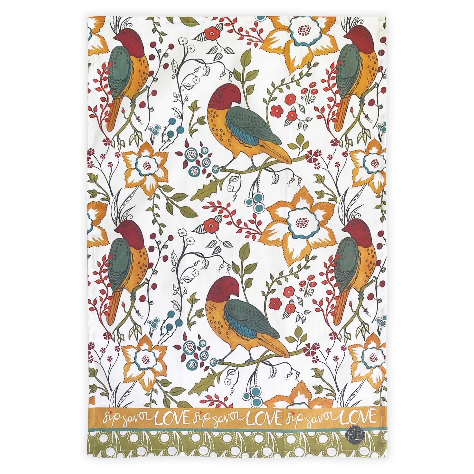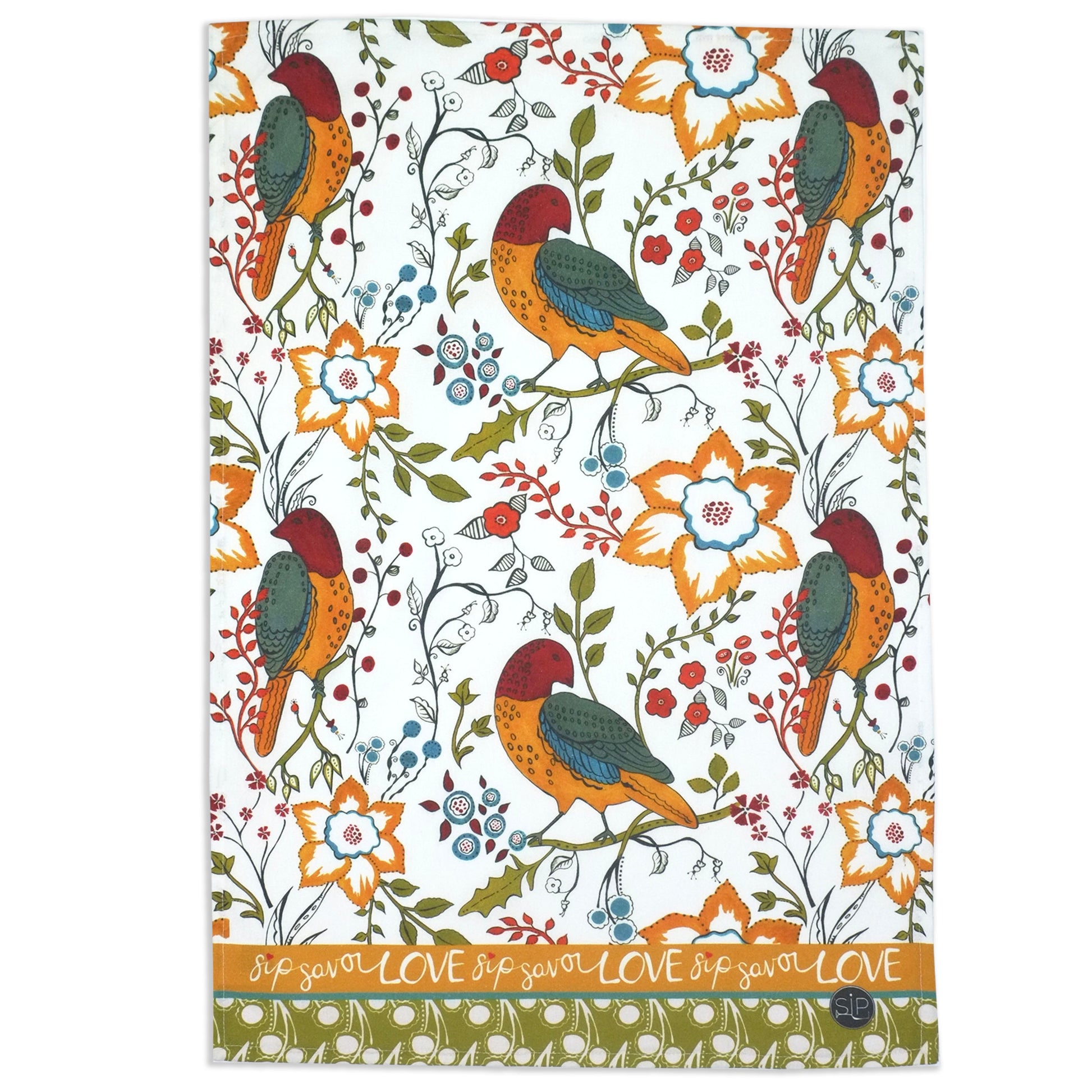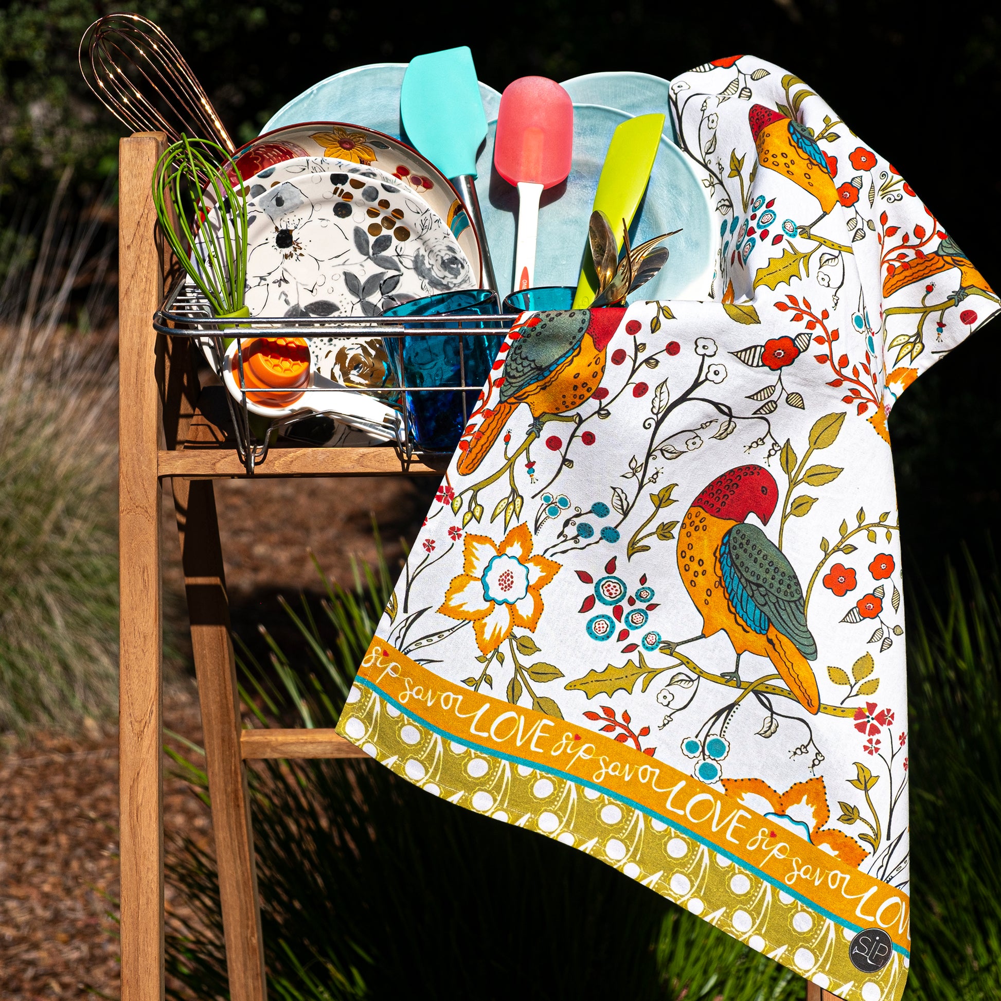 This towel is inspired by both my love of birds and their song in the garden. It is painted with watercolors and then the scanned icons are repeated in a pattern. I wanted this design to have a traditional feel but with a twist. I called this 'Jungle Song' but in retrospect wish I had called it 'Garden Song' as the birds feel more English country garden than jungle!
