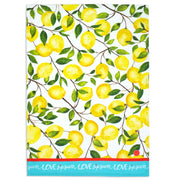 Super size approximately 20” x 30”. 100% high grade organic cotton. Beautifully mitered corners and thoughtful hanging loop. Natural and long lasting dyes so the colors do not fade after many washings. Color safe. Delightfully fresh and fun colors: Aqua, Olive Green, Lemon Yellow, Bark Brown with touches of Cherry Red. Extra embroidery.