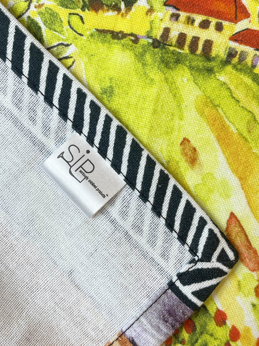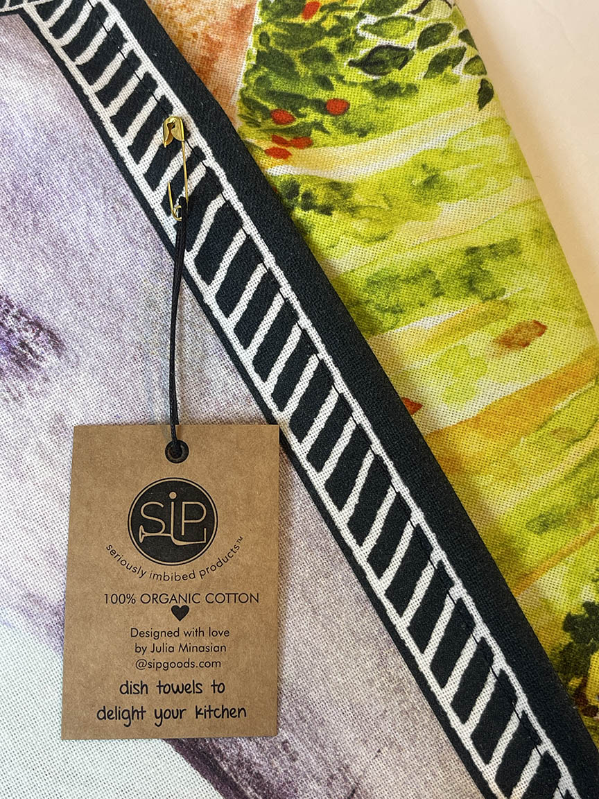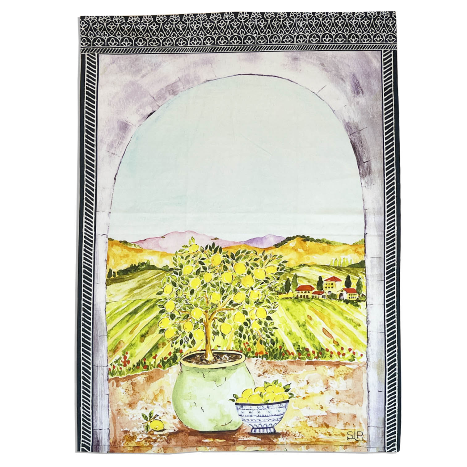 I always love to paint lemons! Just dipping my brush into the happy lemony yellow makes me smile. The art on this towel evokes an old world charm -sunshine, ancient archways, rolling hills with vineyards and a lemon tree in a courtyard! I hope you can smell the deliciousness of the lemon through my art!