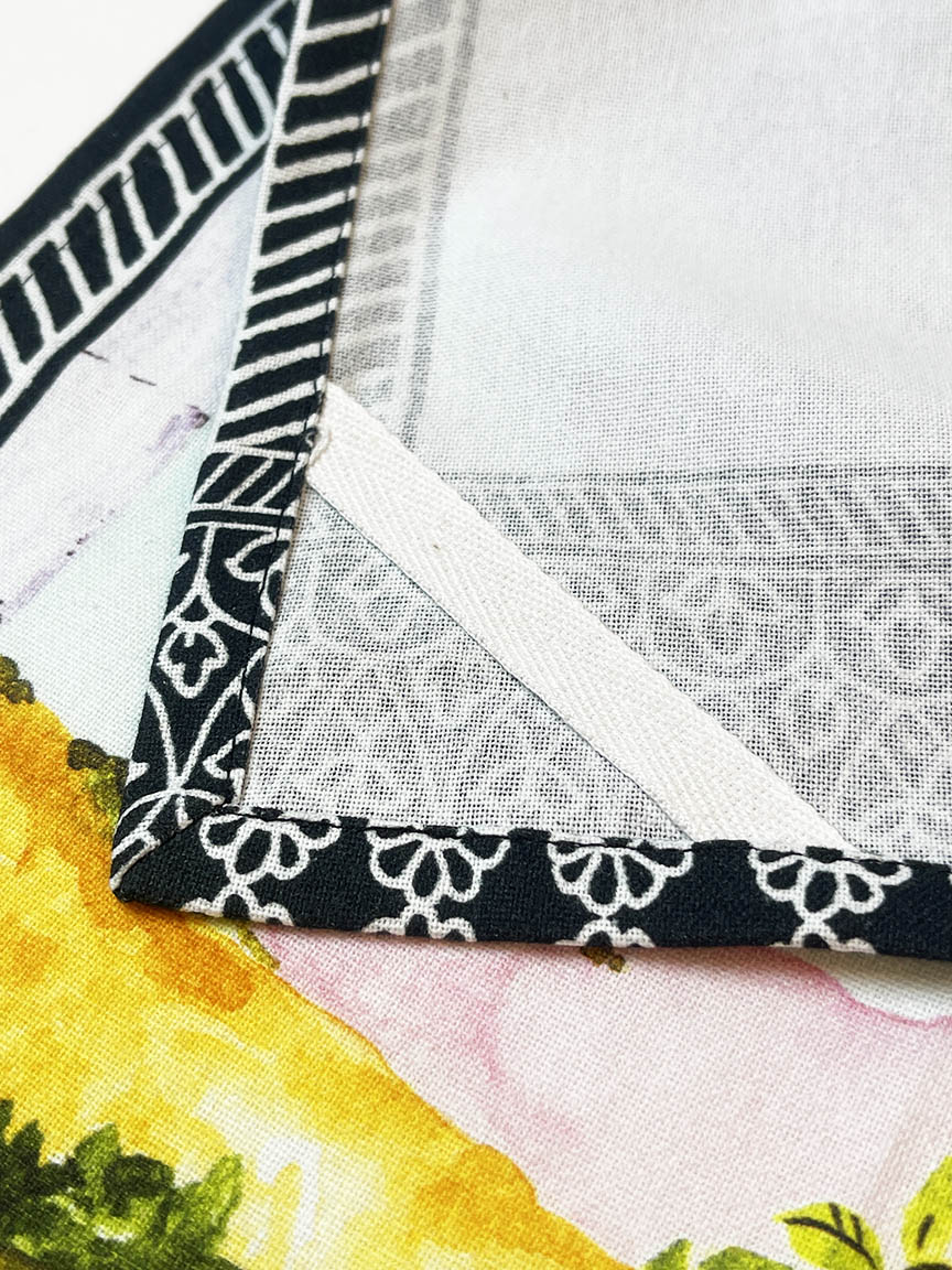 Super size approximately 20” x 30”. 100% high grade organic cotton. Beautifully mitered corners and thoughtful hanging loop. Natural and long lasting dyes so the colors do not fade after many washings. Color safe. Delightfully fresh and fun colors: Sky blue, Olive Green, Lemon Yellow, Bark Brown with touches of lavender and crimson.