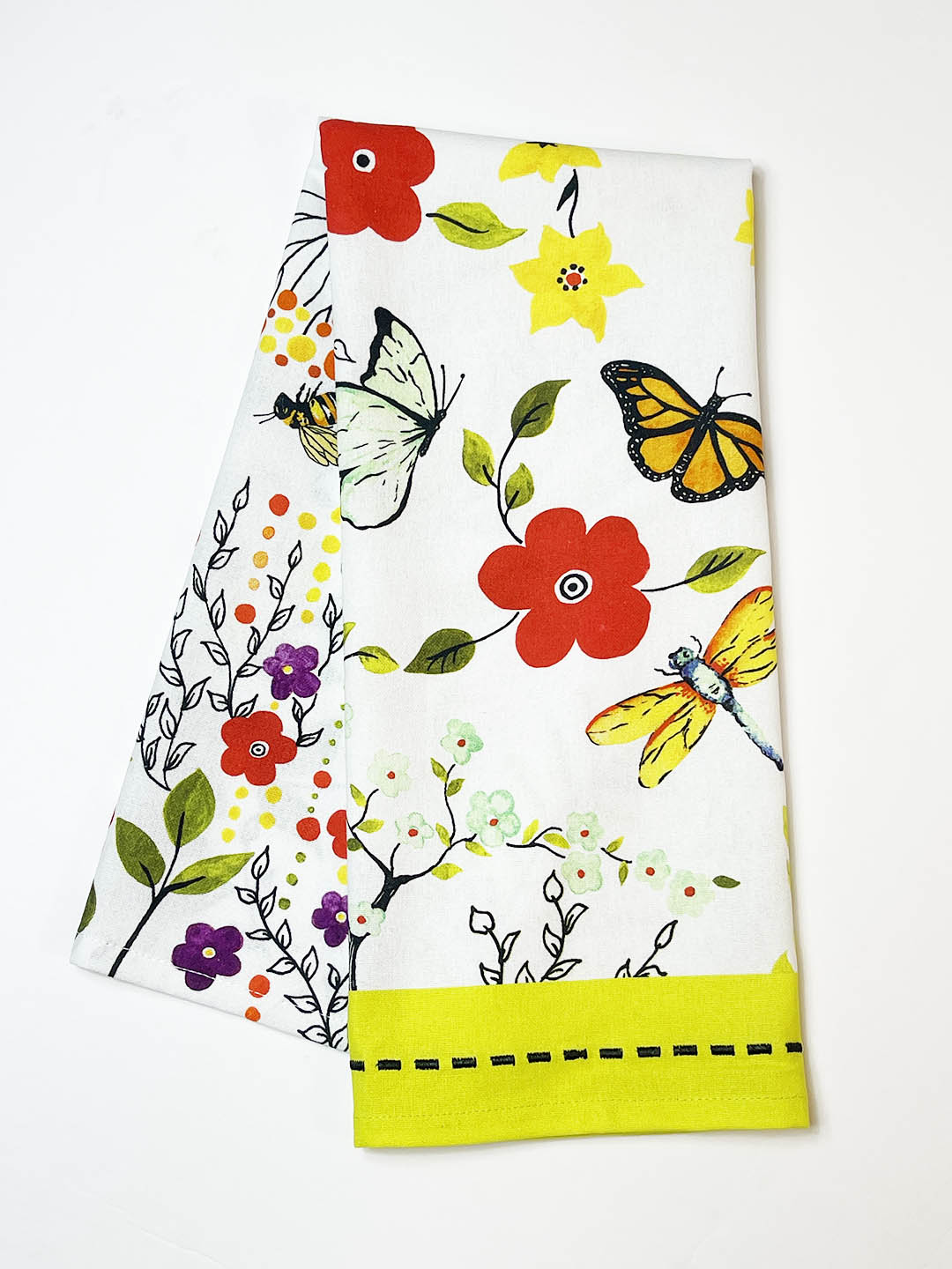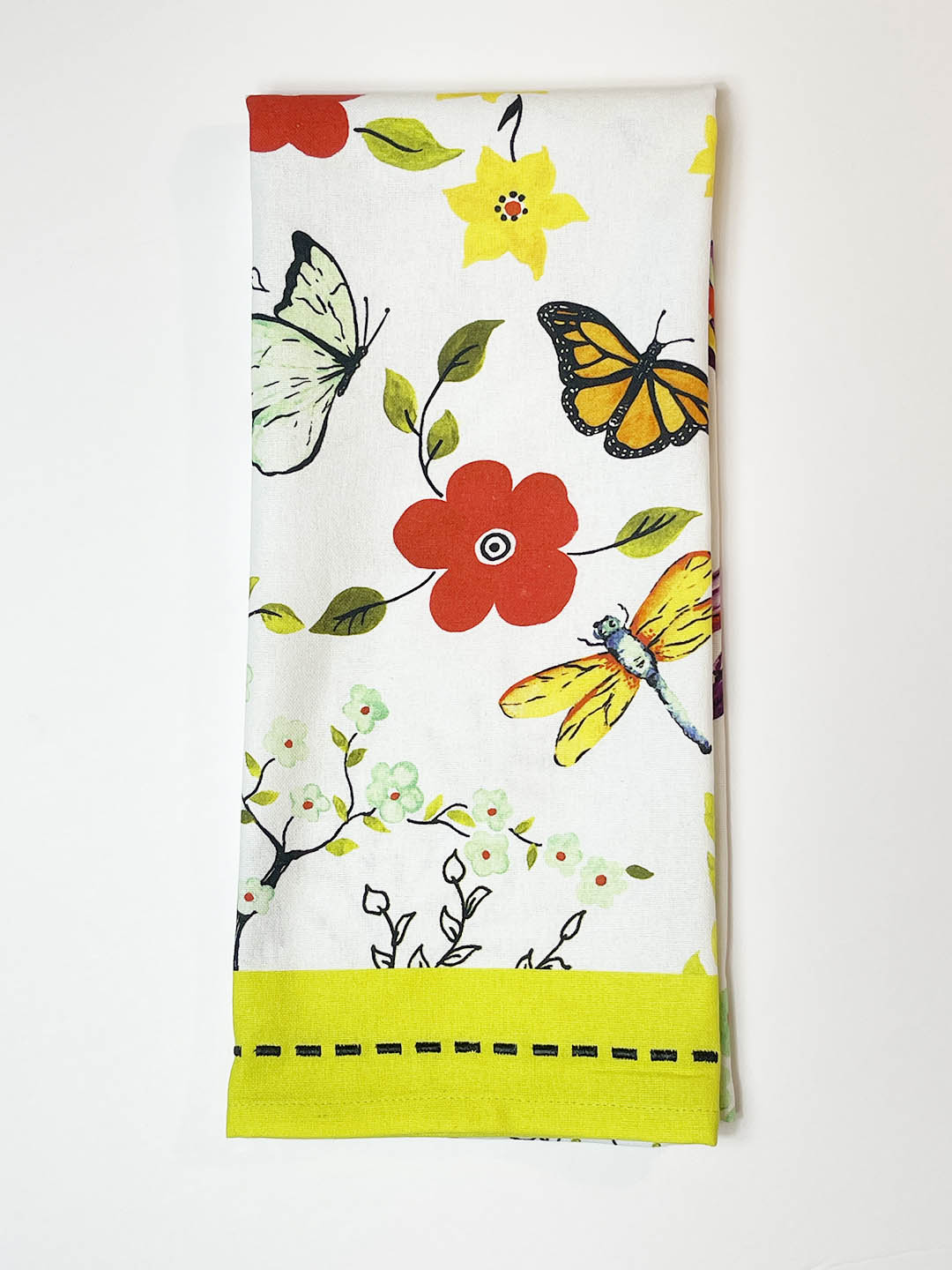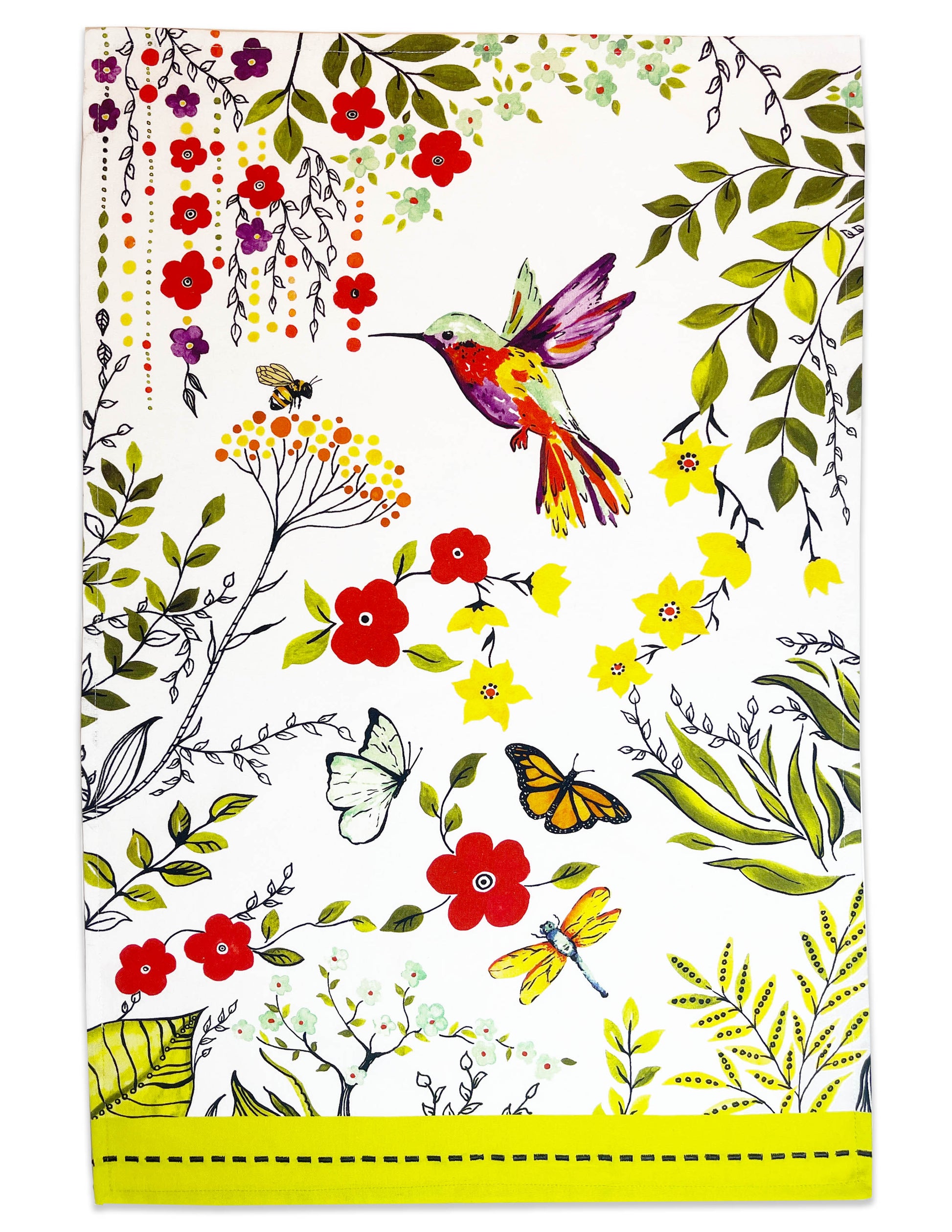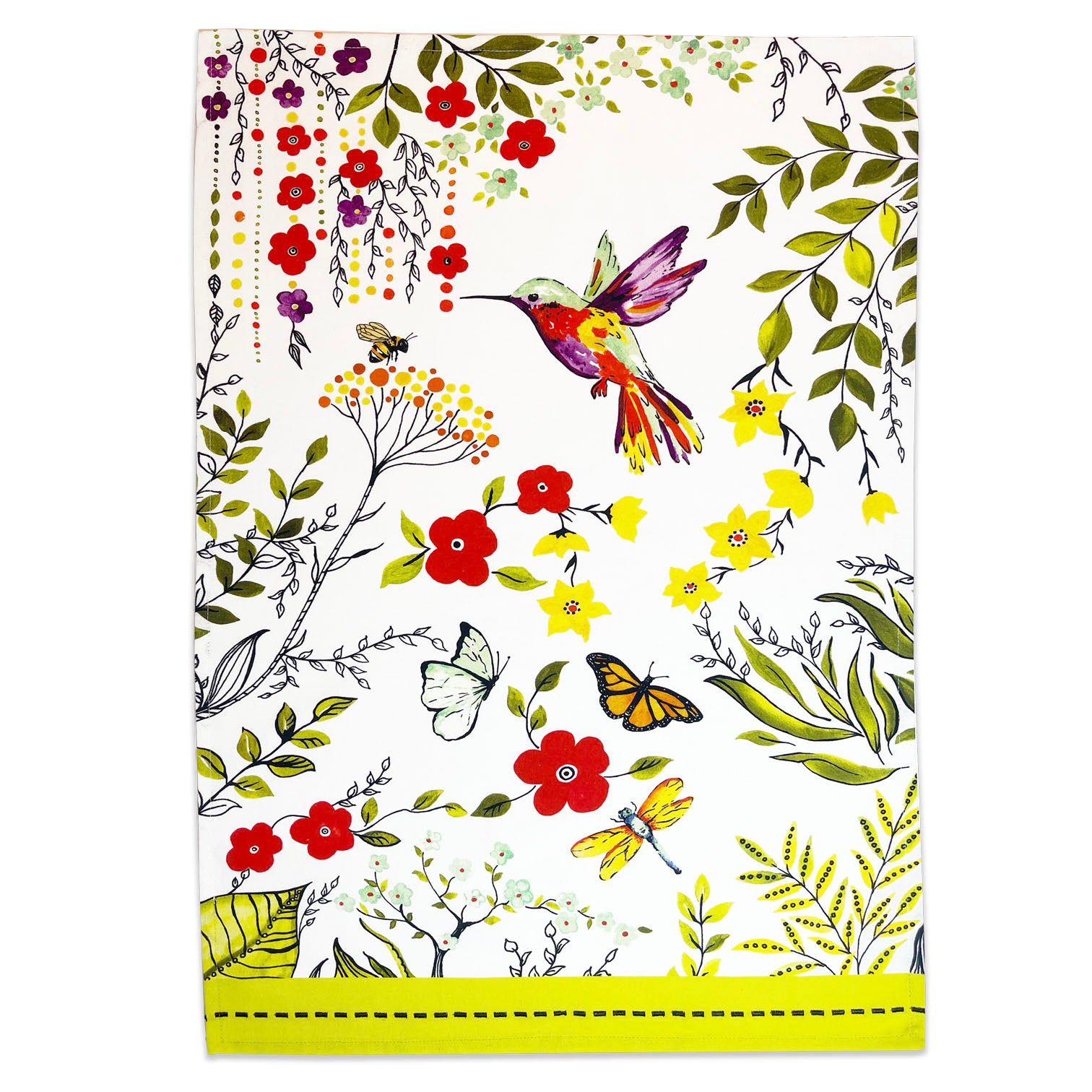 Super size approximately 20” x 30”. 100% high grade organic cotton. Beautifully mitered corners and thoughtful hanging loop. Natural and long lasting dyes so the colors do not fade after many washings. Color safe. Delightfully fresh and fun colors: Aqua, Olive Green, Lemon Yellow, Bark Brown with touches of Cherry Red. Extra embroidery.