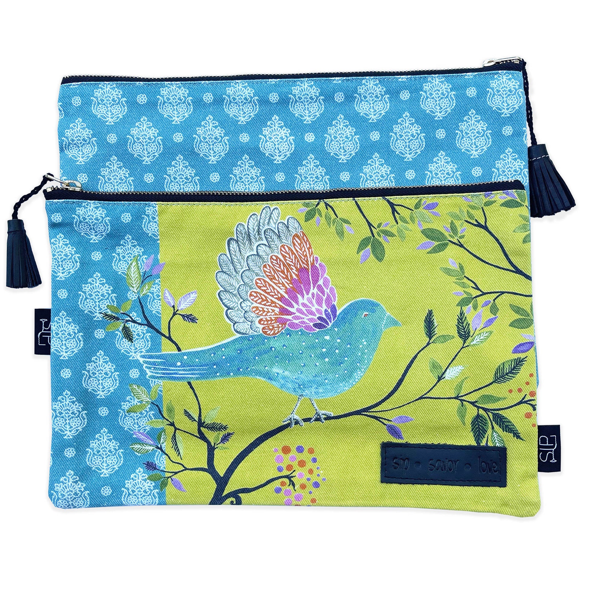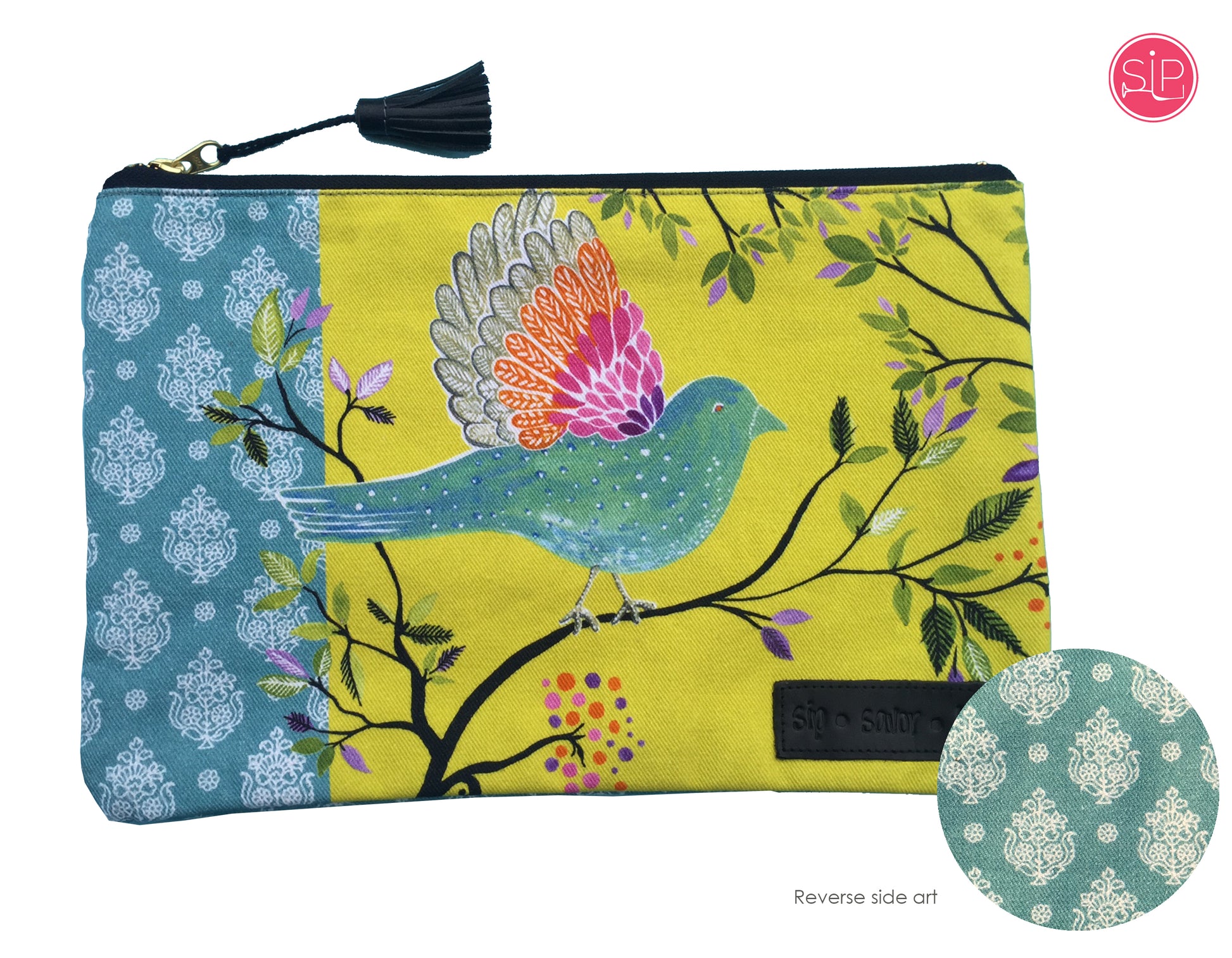 Size approx 12.5” x 8.5”. 100% high grade organic cotton. Quality construction, leather tassel, leather embossed tag (with my company motto to remind us to SIP SAVOR and LOVE), extra quality chunky gold zipper. Inside pockets. Reverse of bag is a contrast print. Please note that the inside lining is not waterproof. It is washable.