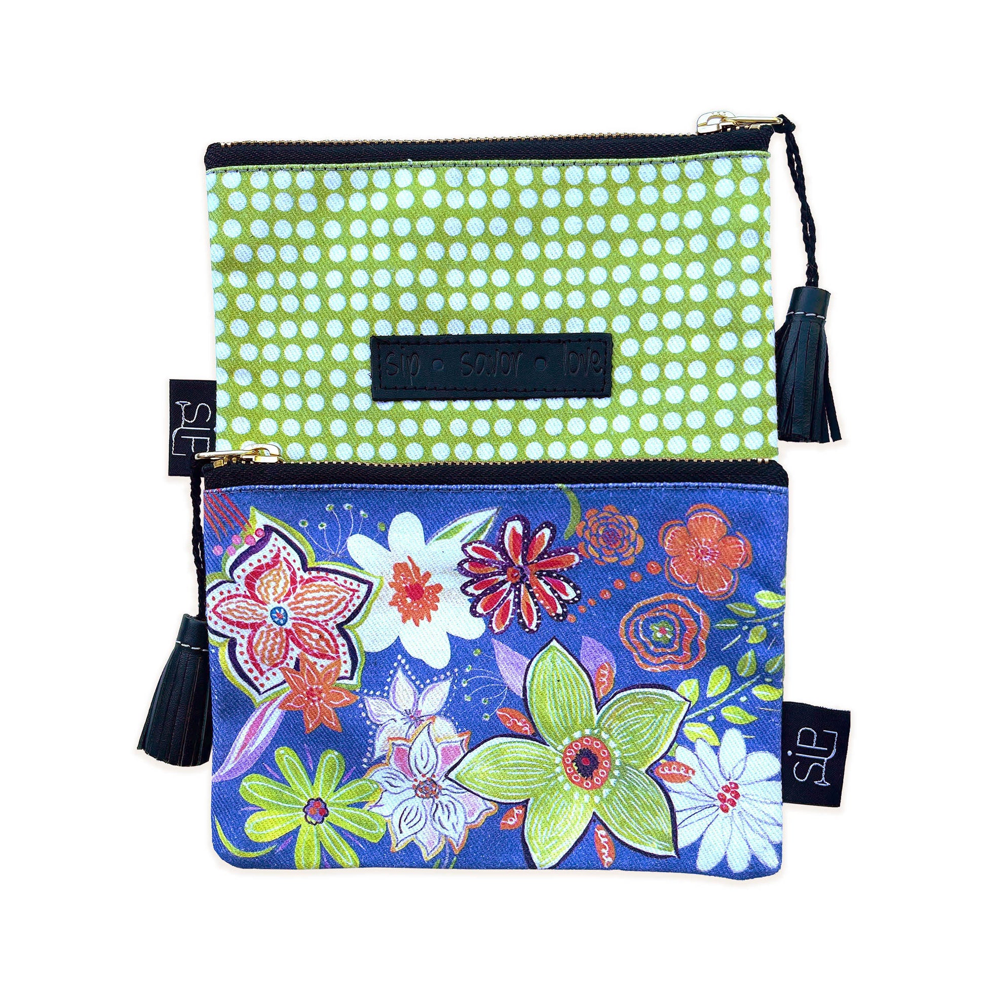 Size approx. 6.5" x 4.5”. 100% high grade organic cotton. Quality construction, woven tag high quality zipper. Reverse of bag is as shown with leather tag. Please note that the inside lining is not waterproof. It is washable.