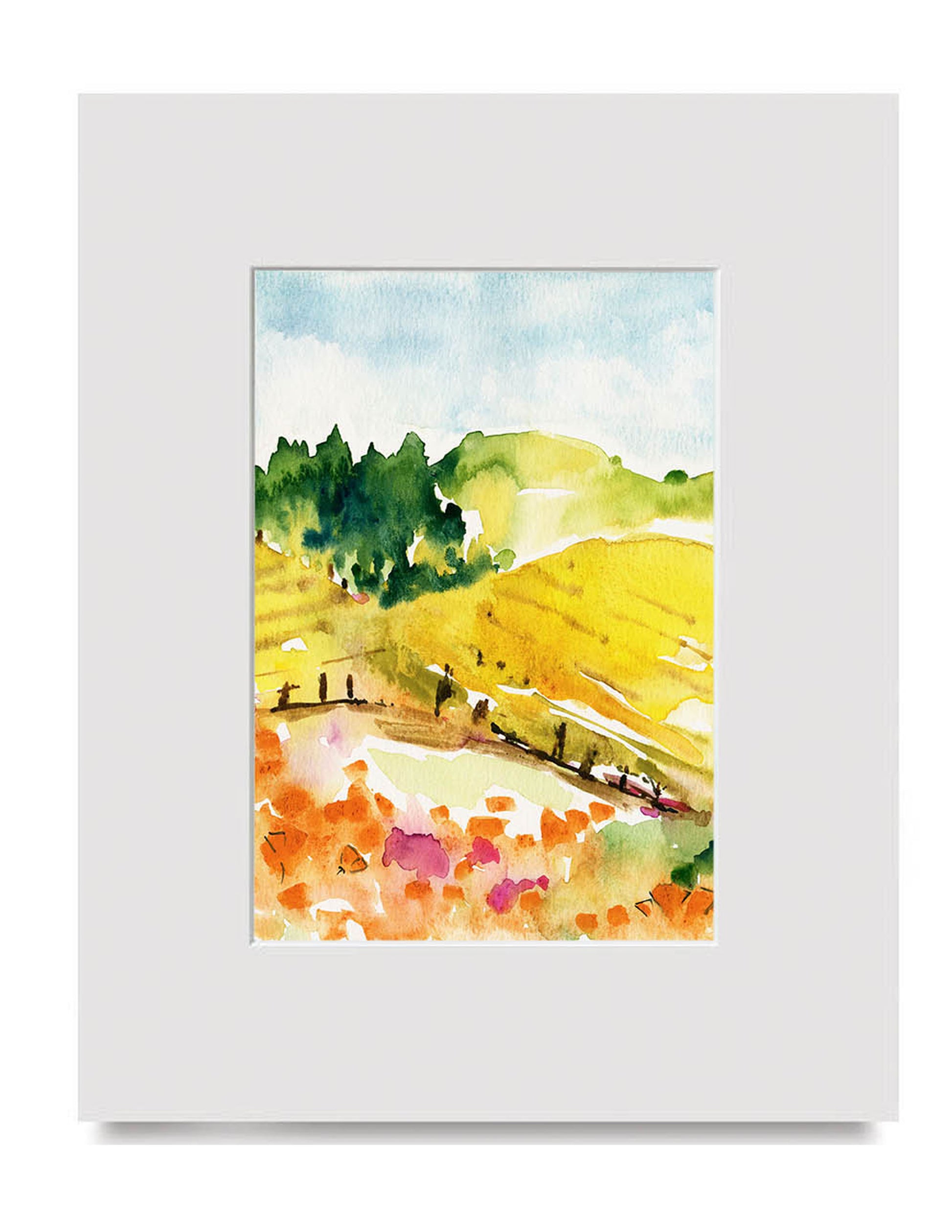 There's something amazing about the West Coast Hills and I love to paint them. The continually changing color of the different seasons has dramatic contrasts. I love the bright orange poppies and springtime wild flowers which are juxtaposed against wide blue sky and either verdant green or golden yellow hills. In the Fall, the vineyards are rich with autumnal hues which just take one's breath away. It's lovely to see the resurrection of vineyards that were destroyed during prohibition times. I hope the stillness and calm of these watercolors reminds you of your time appreciating this beauty.