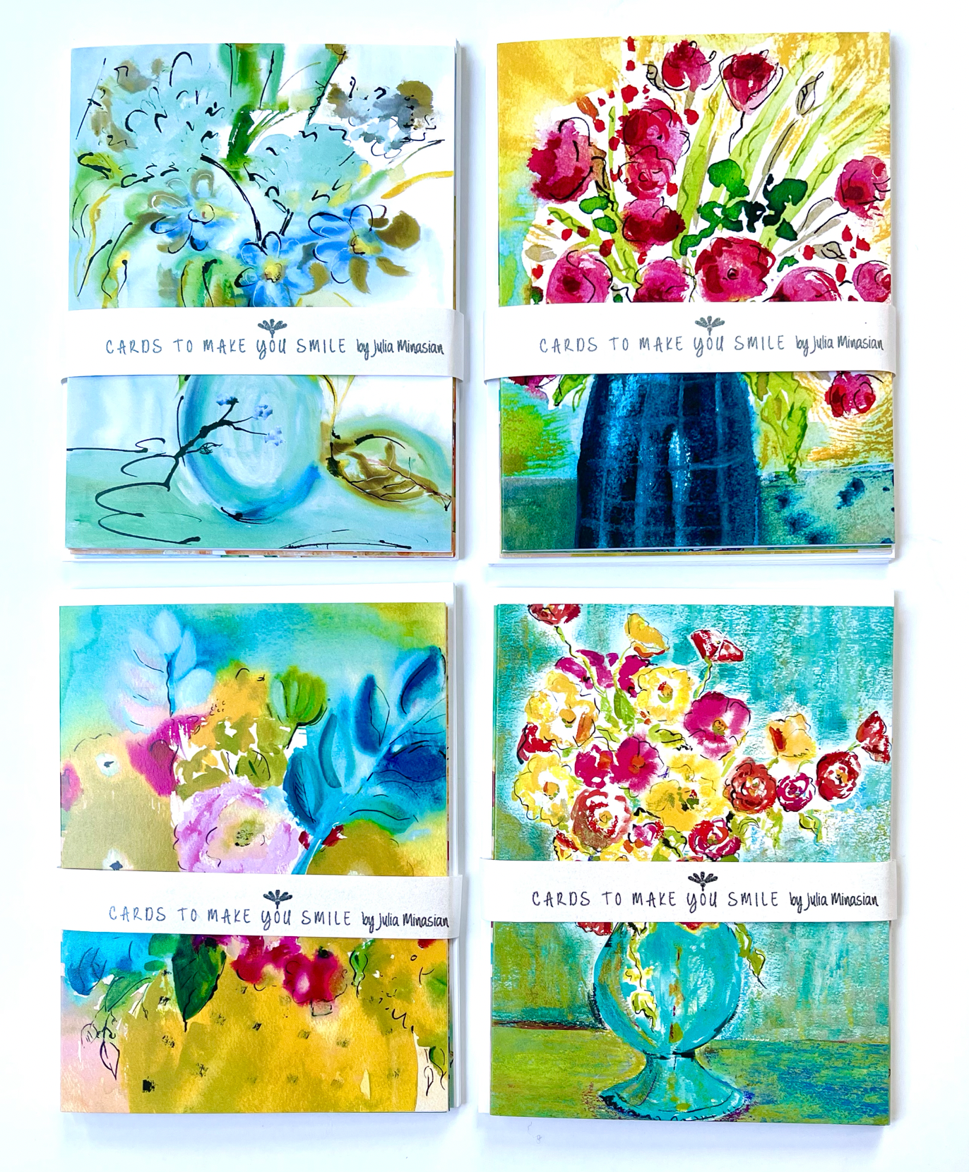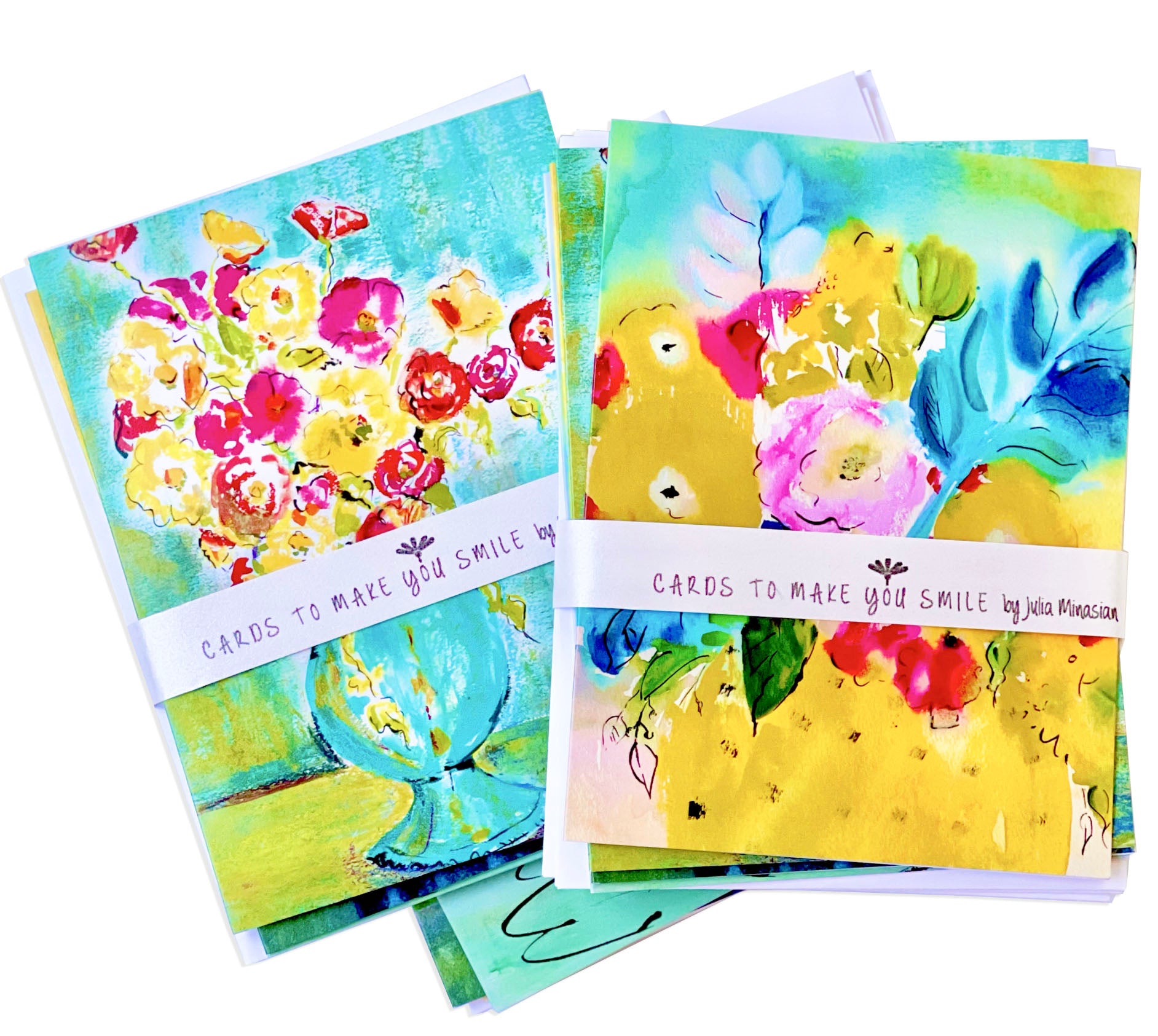 Set of four mixed note cards from original watercolor paintings by Julia Minasian. "Designed to Make you smile" series.