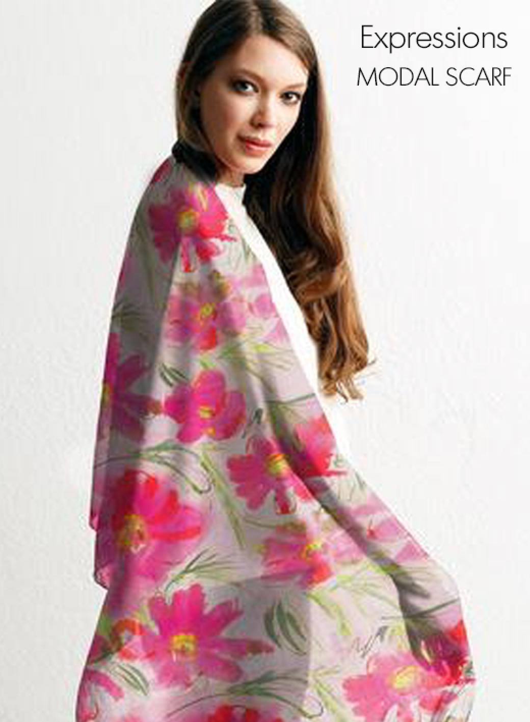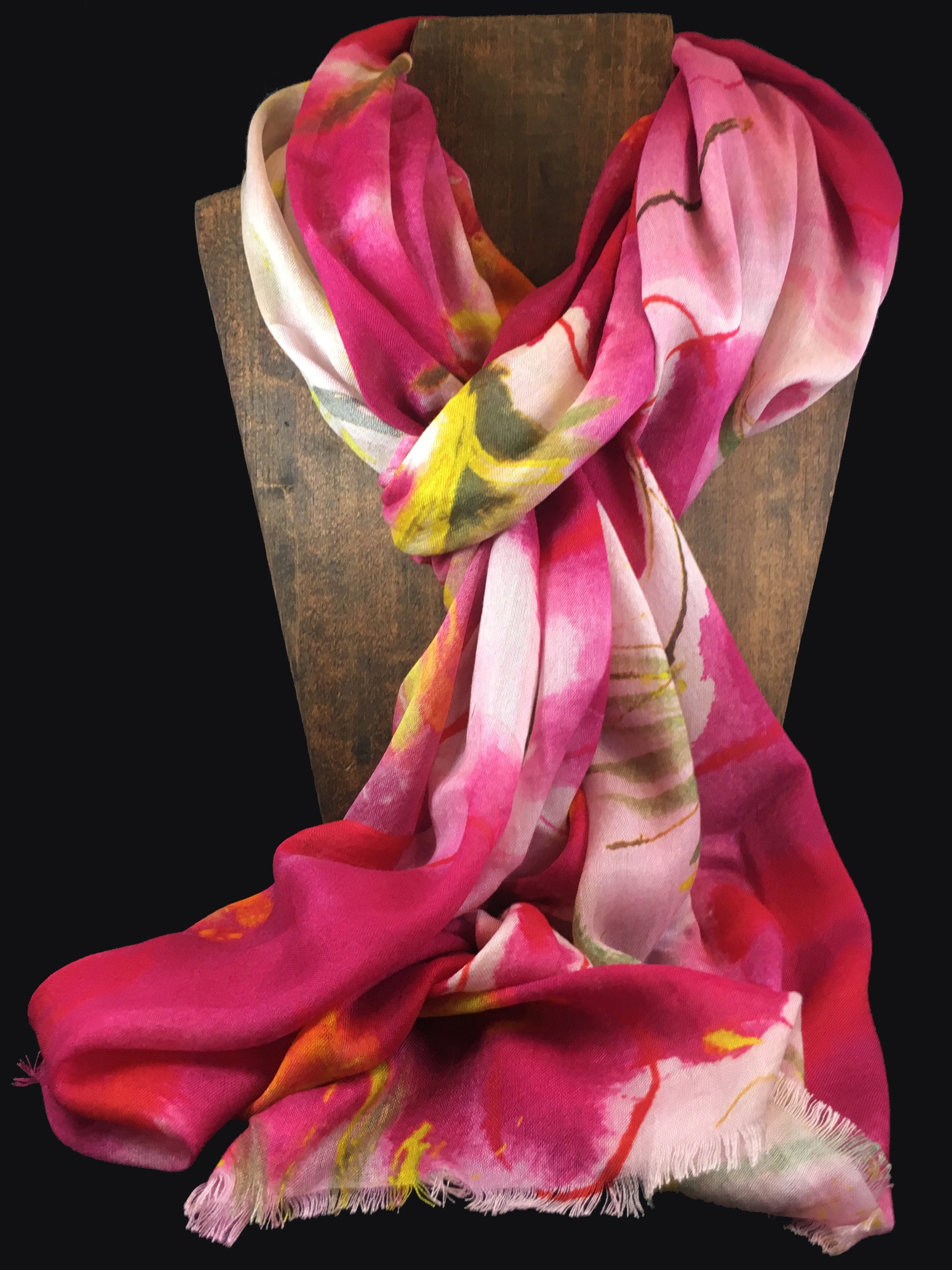 These chic, eco friendly scarves are unique fashion statements based on my own original watercolor artwork. They are luxuriously soft and drape beautifully, like natural silk, and very breatheable. From their wonderful feel, you would never guess that they are made from the pulp of beech trees, also known as “Modal” or “botanical silk.” The botanical origin means that the fabric is much more eco-friendly than material derived from silk worms.