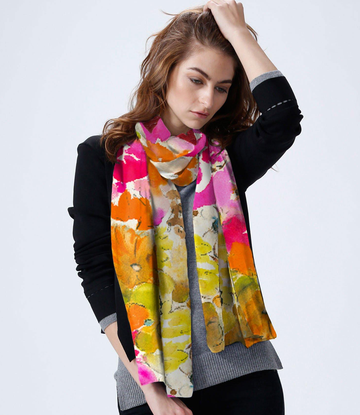 These chic, eco friendly scarves are unique fashion statements based on my own original watercolor artwork. They are luxuriously soft and drape beautifully, like natural silk, and very breatheable. From their wonderful feel, you would never guess that they are made from the pulp of beech trees, also known as “Modal” or “botanical silk.” The botanical origin means that the fabric is much more eco-friendly than material derived from silk worms.