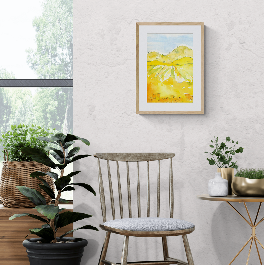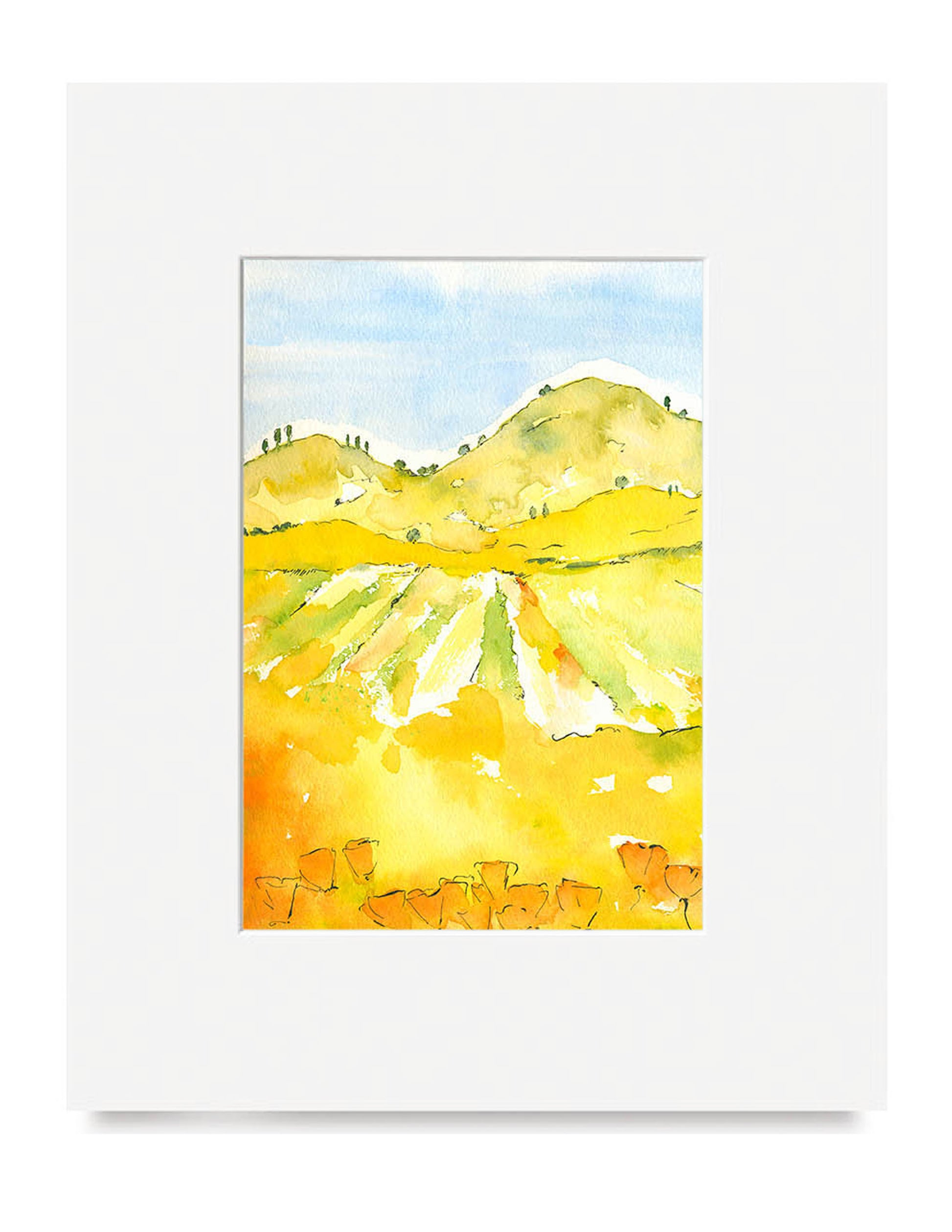 There's something amazing about the West Coast Hills and I love to paint them. The continually changing color of the different seasons has dramatic contrasts. I love the bright orange poppies and springtime wild flowers which are juxtaposed against wide blue sky and either verdant green or golden yellow hills. In the Fall, the vineyards are rich with autumnal hues which just take one's breath away. It's lovely to see the resurrection of vineyards that were destroyed during prohibition times. I hope the stillness and calm of these watercolors reminds you of your time appreciating this beauty.