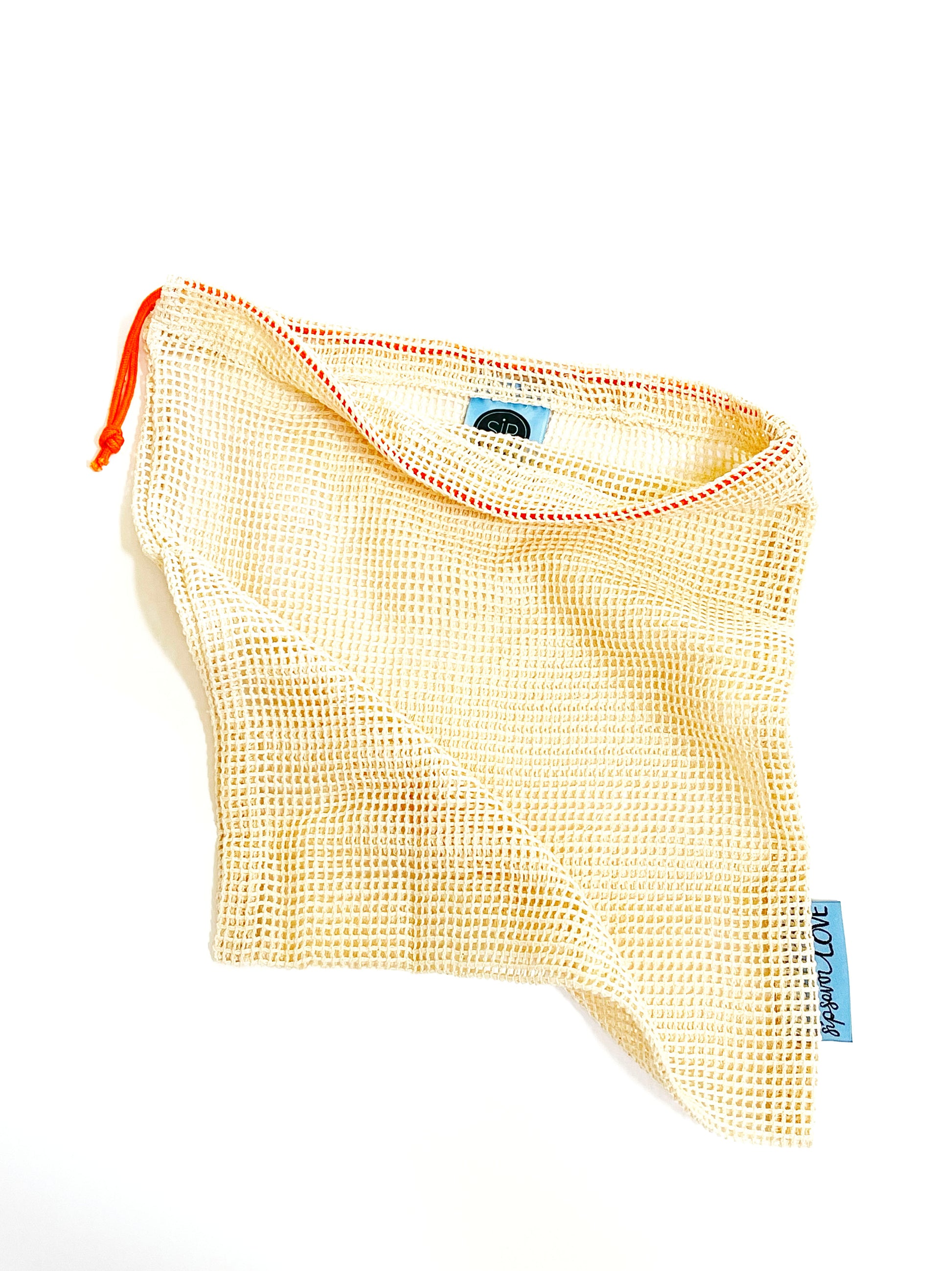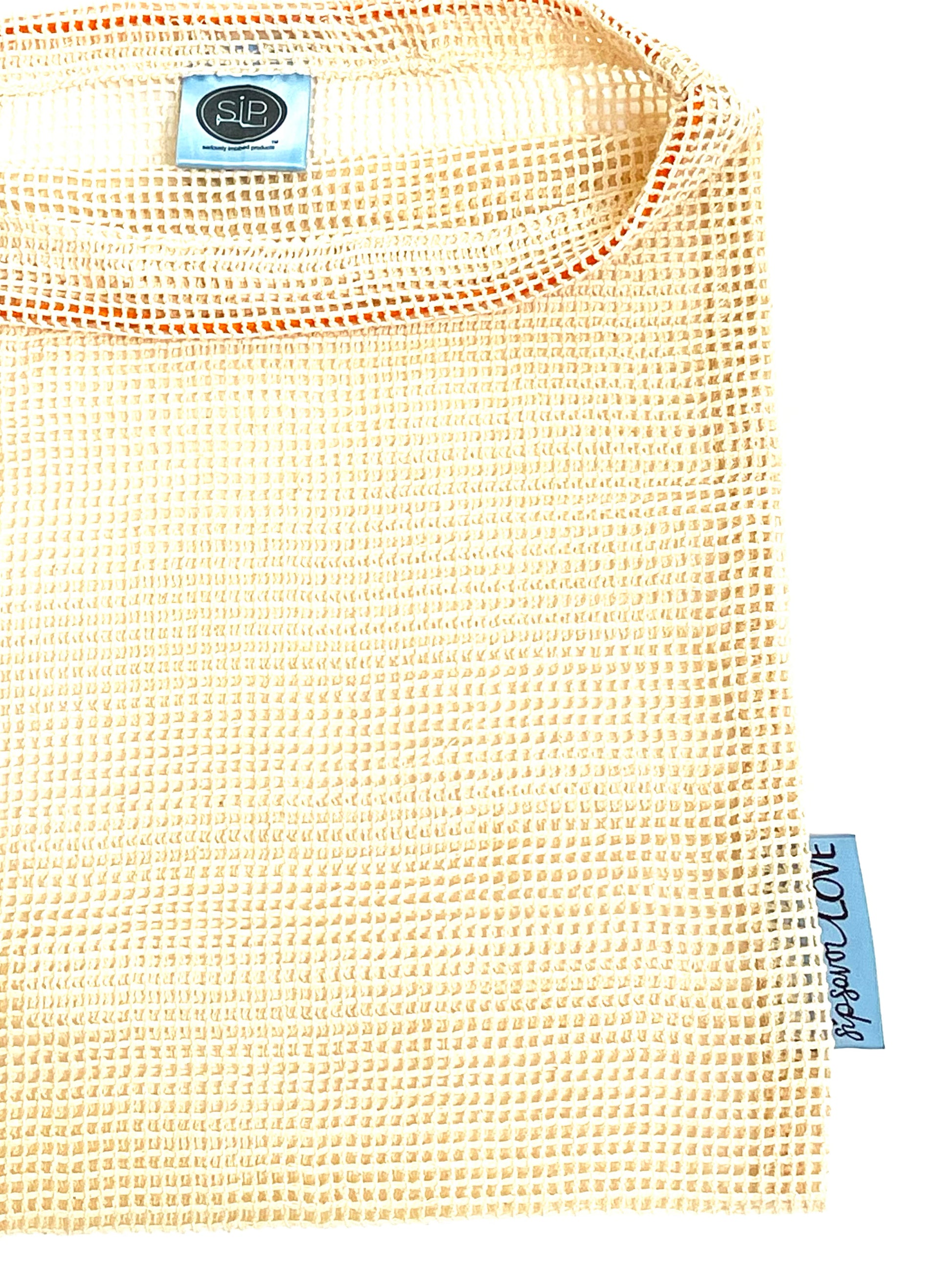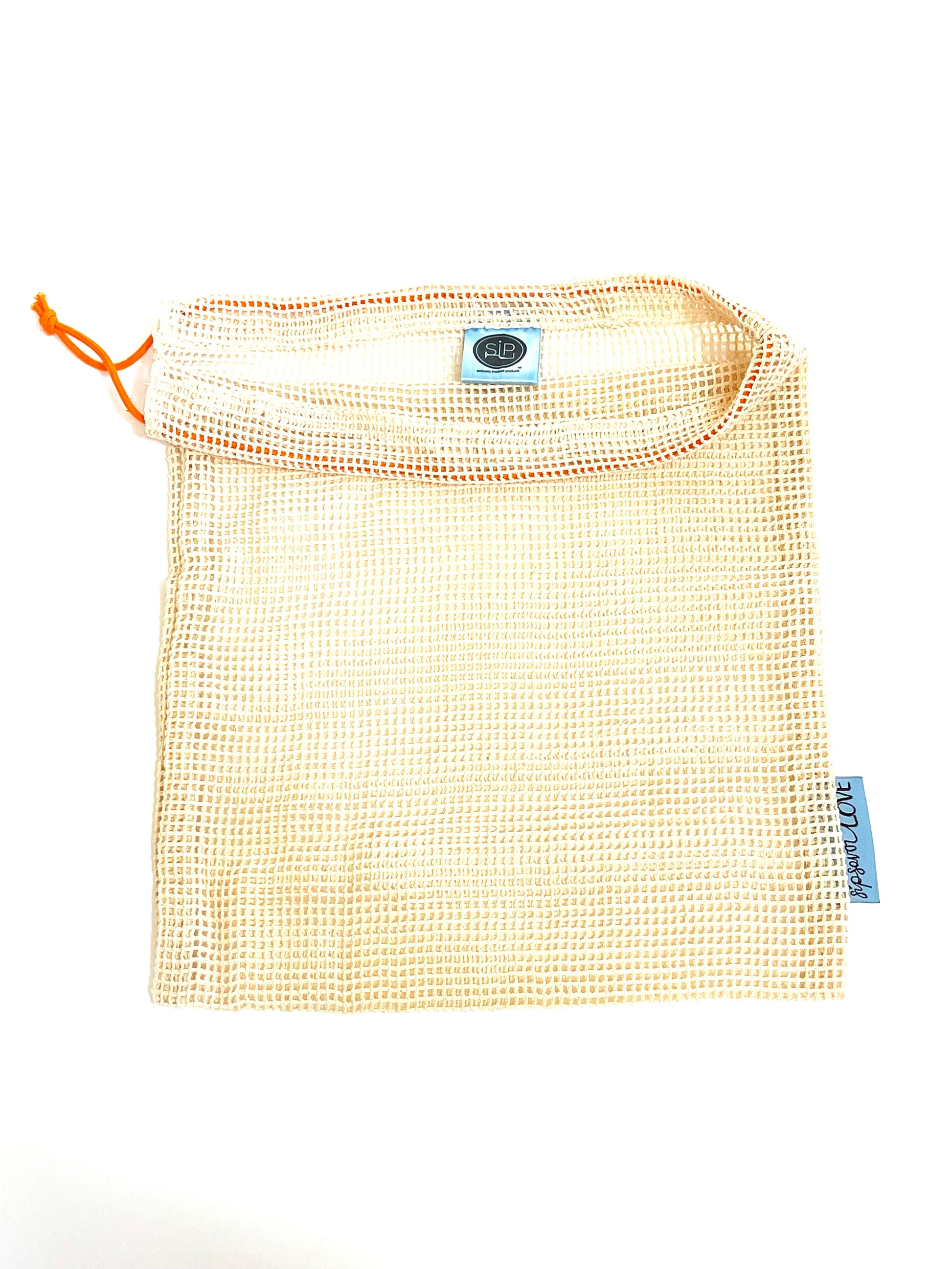This organic cotton mesh produce bag is 12" x 10". We added a stylish woven tag with the words 'sip savor love' - (our company motto and a reminder to live in the moment).
