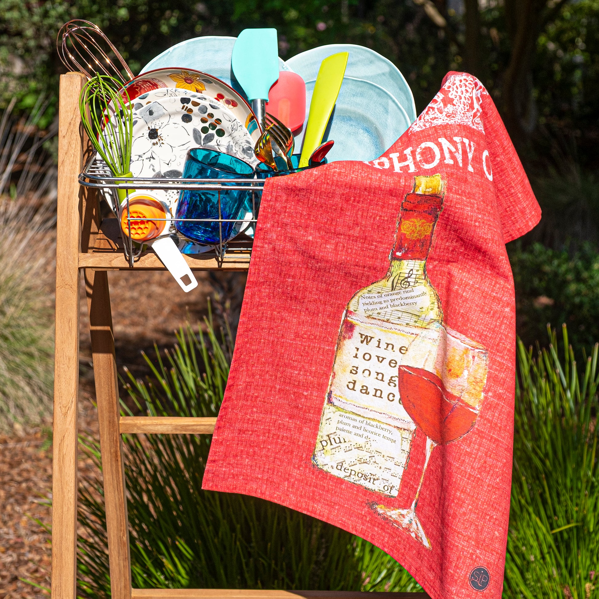 Super size 20” x 30”. 100% high grade organic cotton. Beautifully mitered corners and thoughtful hanging loop. Natural and long lasting dyes so the colors do not fade after many washings. Color safe. Colors: Pinot Noir Red with Cloud White.