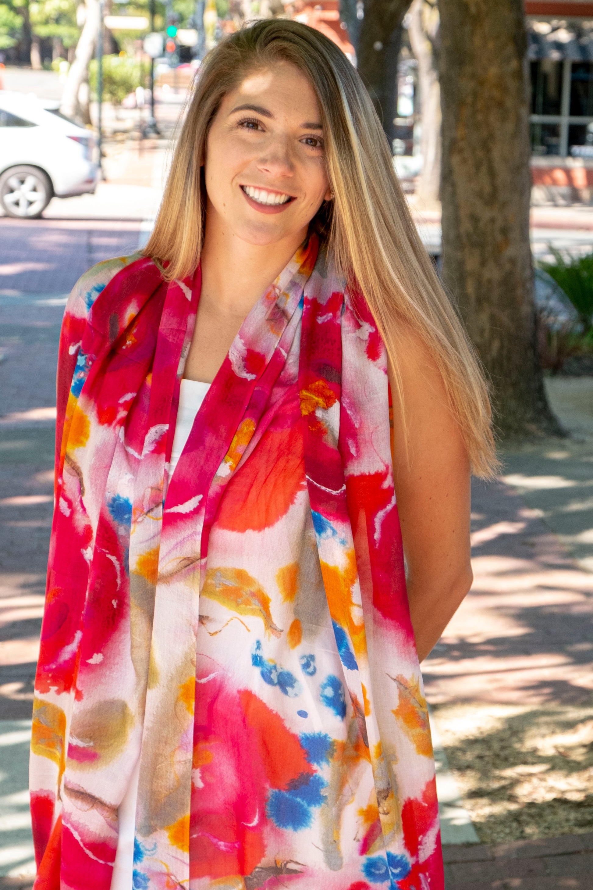 I live in California and find that these scarves are a perfect weight to wear year round here. The botanical fibers provide some warmth in the winter, yet I can wear them comfortably even upwards of 90 degrees in the summer. Pair them with a simple dress year round for a dressier look or top your blue jeans/white t shirt look for a great pop of color. Most important is to let it feel natural. Have fun just throwing it on and make a unique fashion statement!