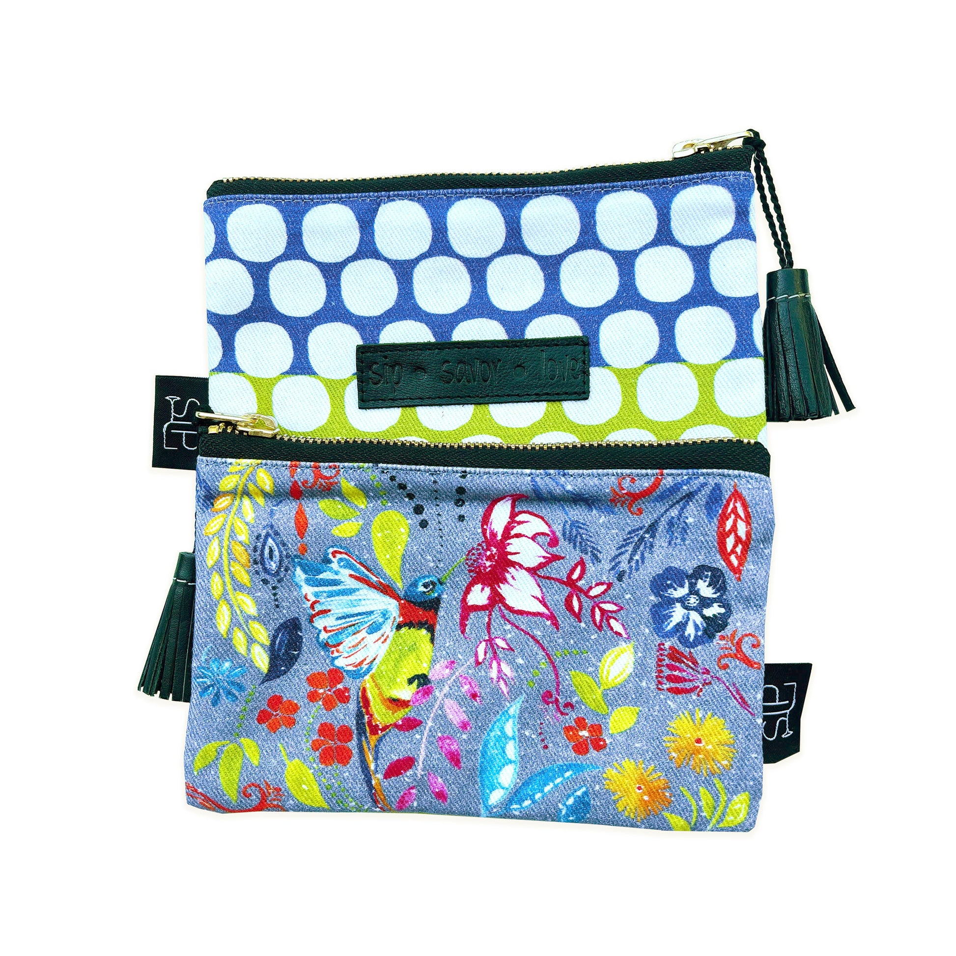 Size approx. 6.5" x 4.5”. 100% high grade organic cotton. Quality construction, woven tag high quality zipper. Reverse of bag is as shown with leather tag. Please note that the inside lining is not waterproof. It is washable.
