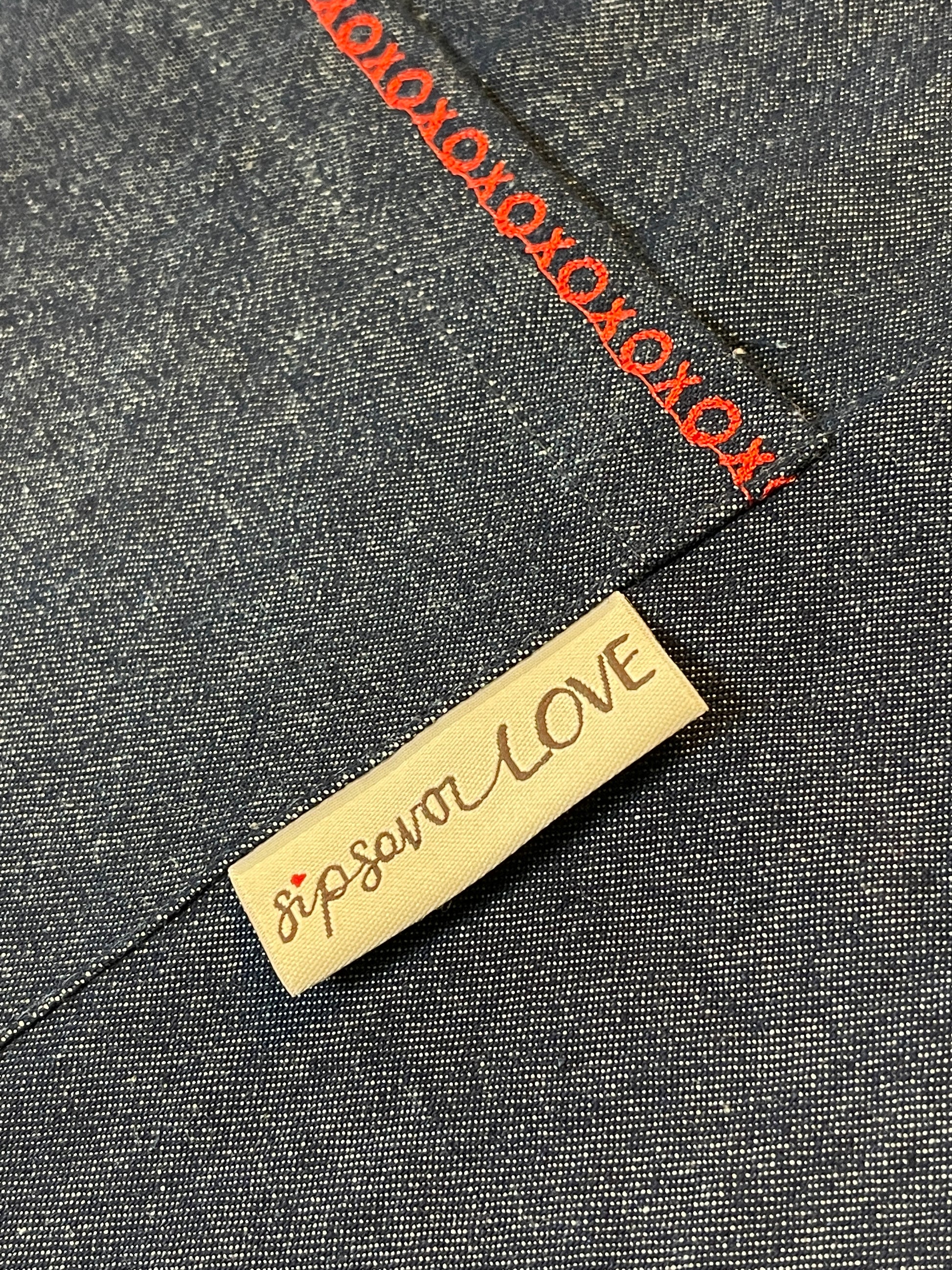 My company motto can be seen on many of my products and here it is as a woven tag to the side of the large front pocket. Sip Savor Love. Each day can feel richer when we make this positive focus part of our daily intention. May your days feel inspired!