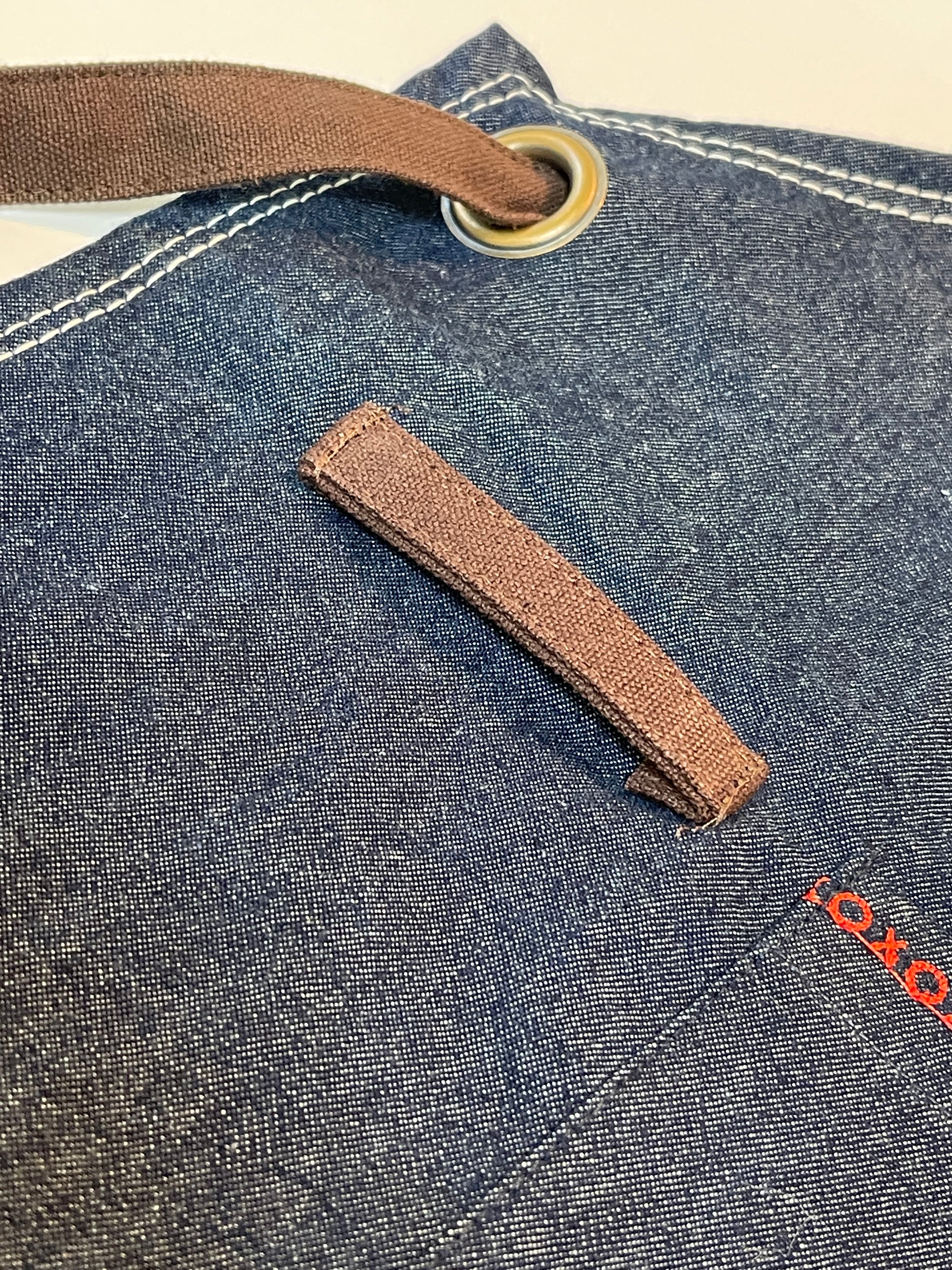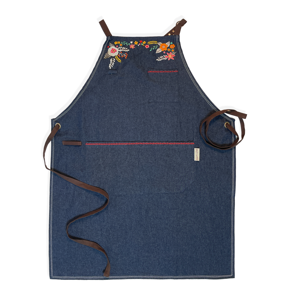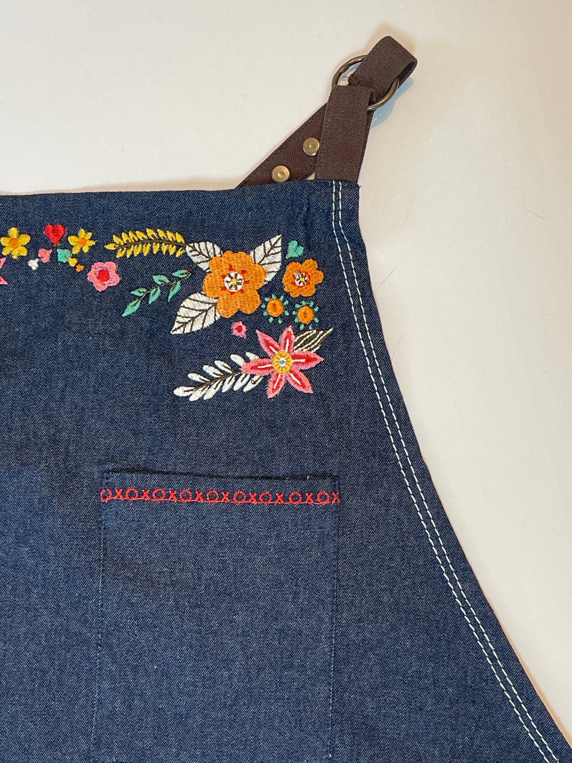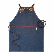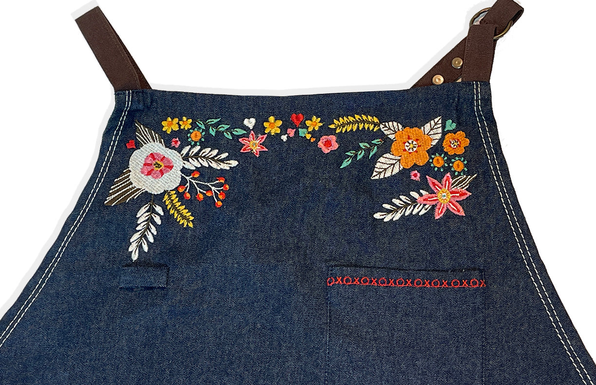 Features include: 37” tall. 100% high grade organic cotton/denim. Beautifully mitered corners. Top and center pockets with embroidered hugs and kisses. Eye glass or pen loop, towel loop and criss cross straps. The straps are organic cotton canvas in a deep brown to give the look of leather!