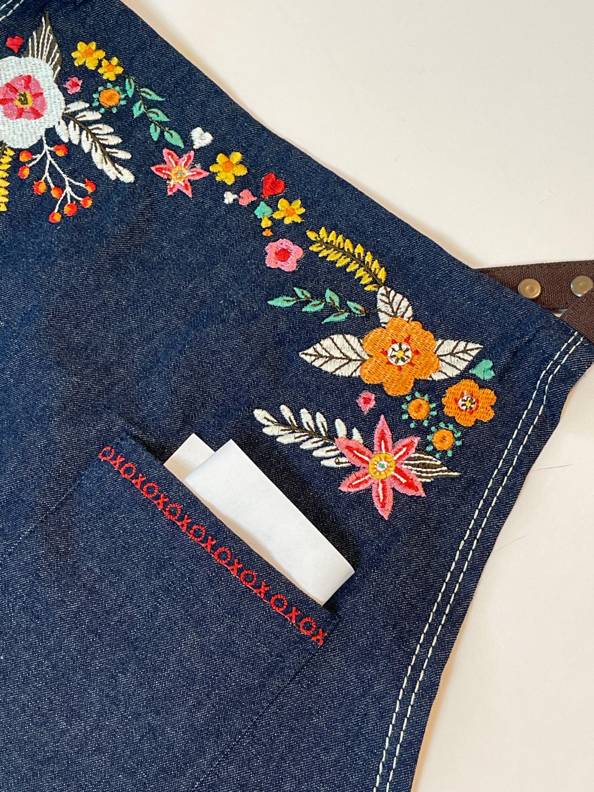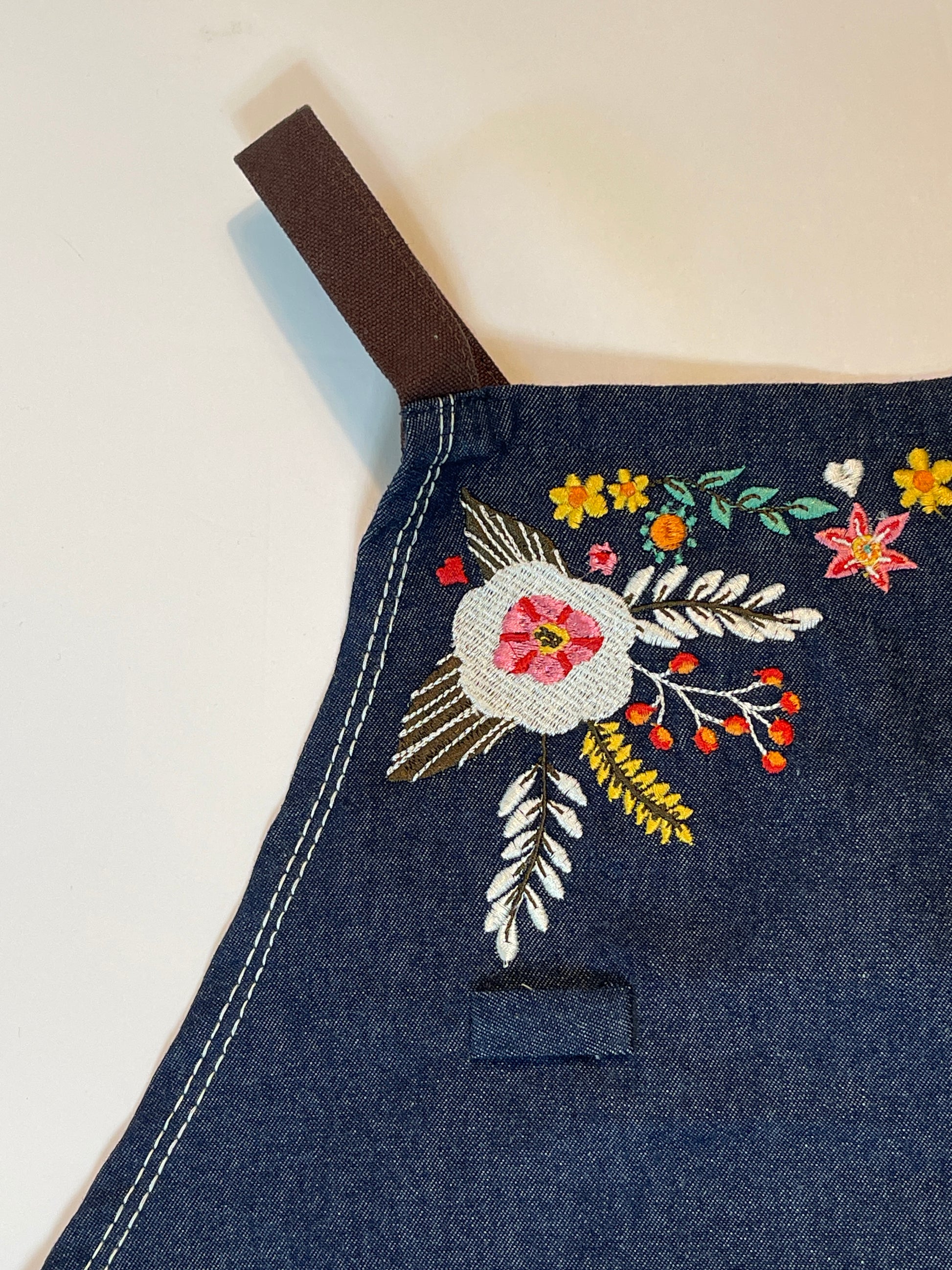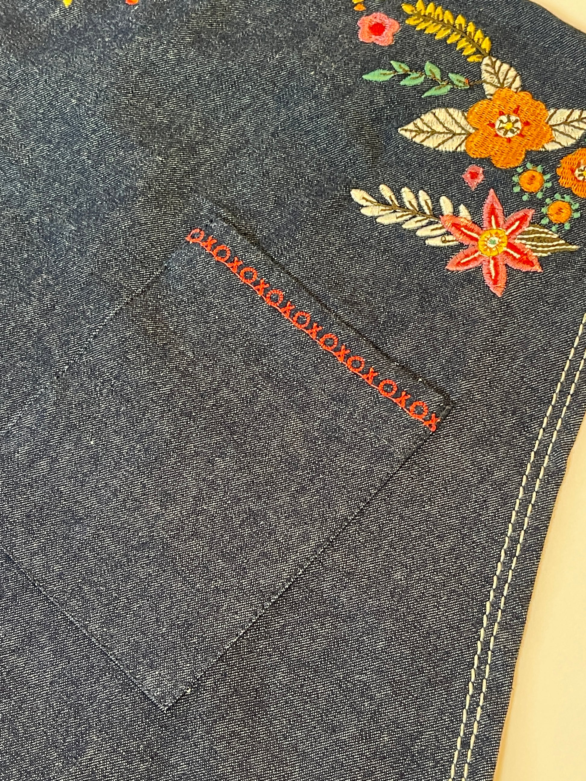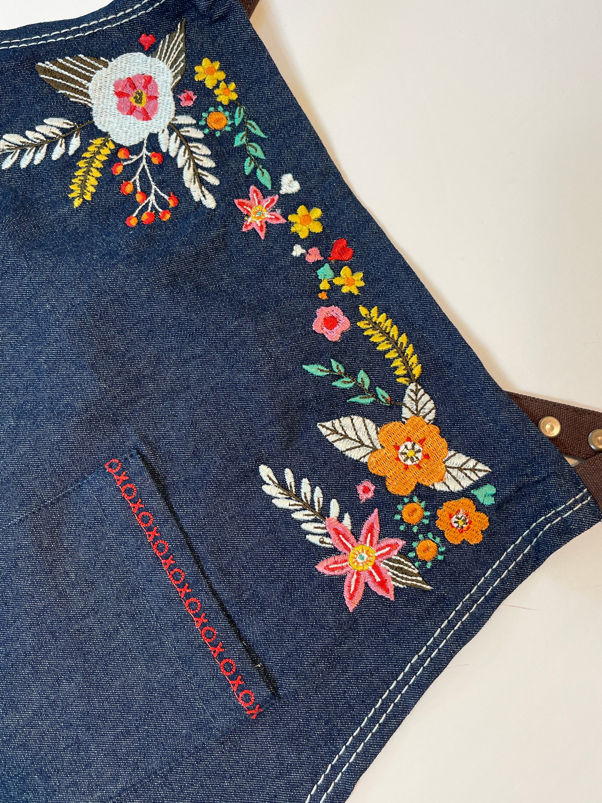 Features include: 37” tall. 100% high grade organic cotton/denim. Beautifully mitered corners. Top and center pockets with embroidered hugs and kisses. Eye glass or pen loop, towel loop and criss cross straps. The straps are organic cotton canvas in a deep brown to give the look of leather!