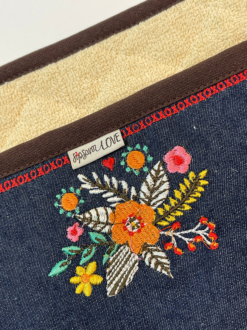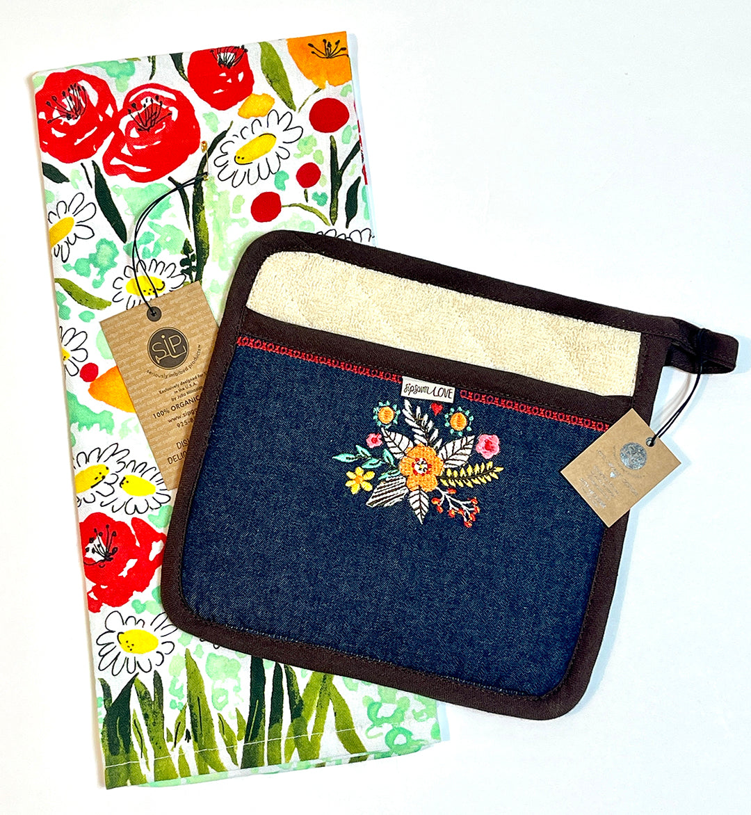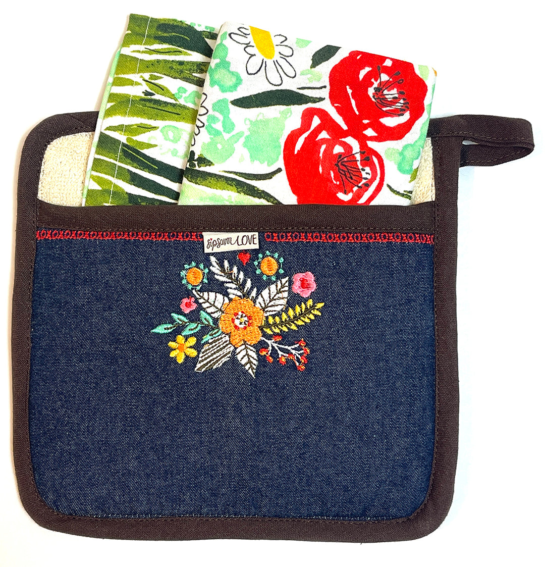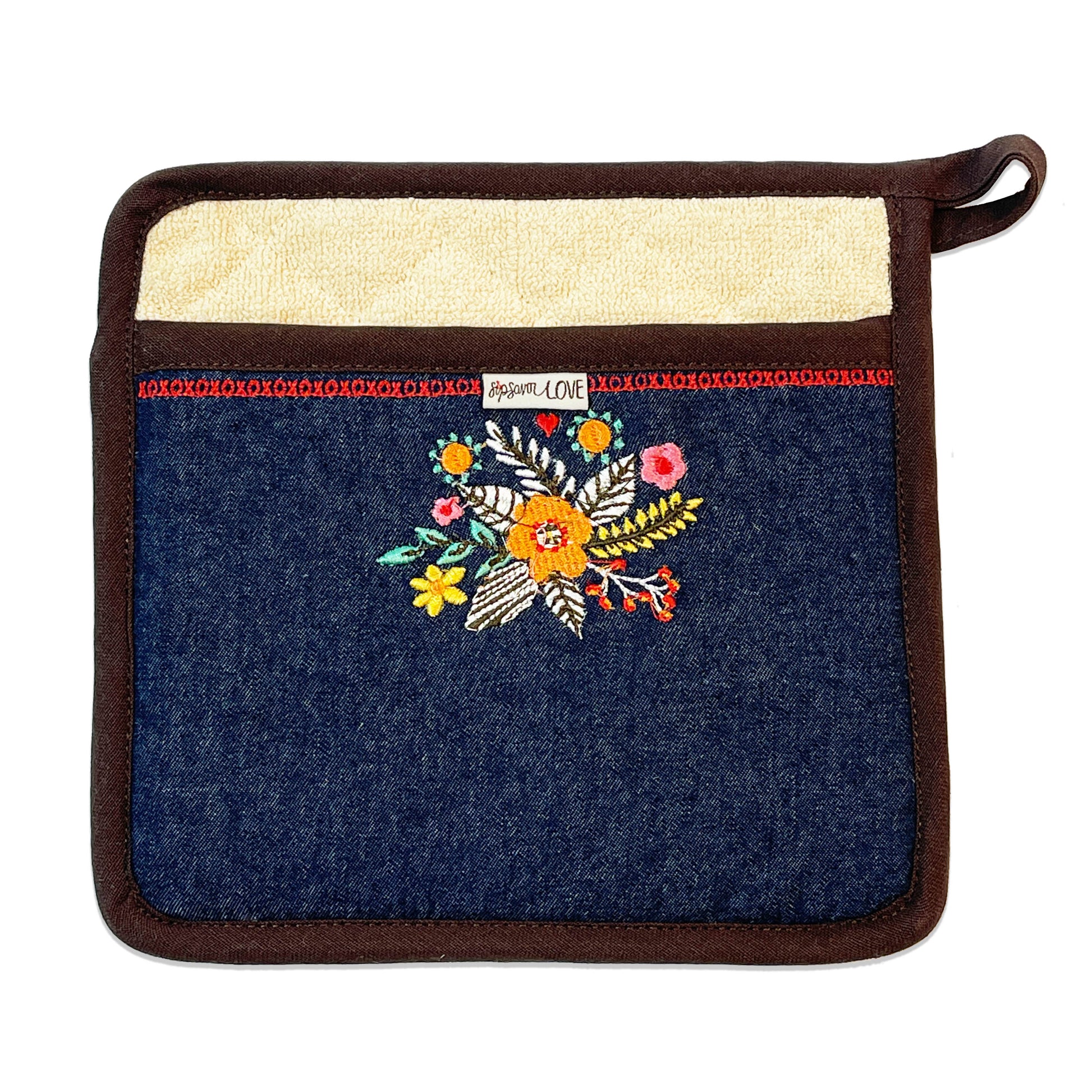 Functional art for your kitchen! This stylish Pot Holder is filled with fun and colorful embroidery. There are hugs and kisses, lively flowers and our 'sip savor love' woven tag to remind you - it's all about LOVE!