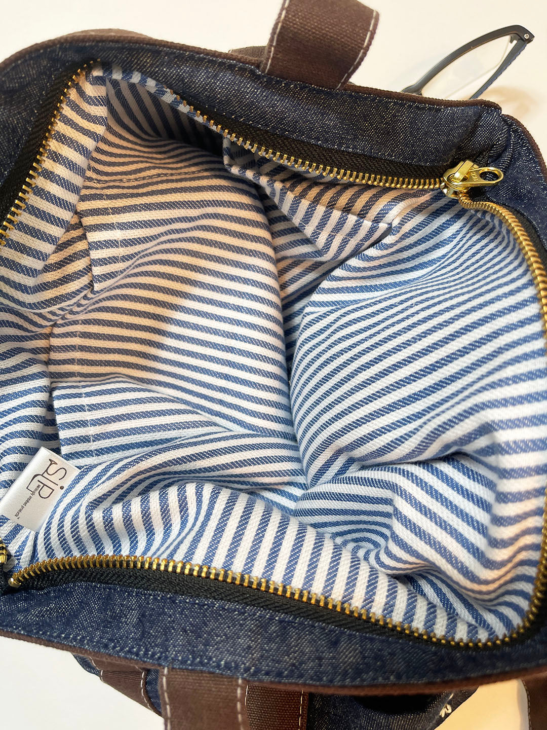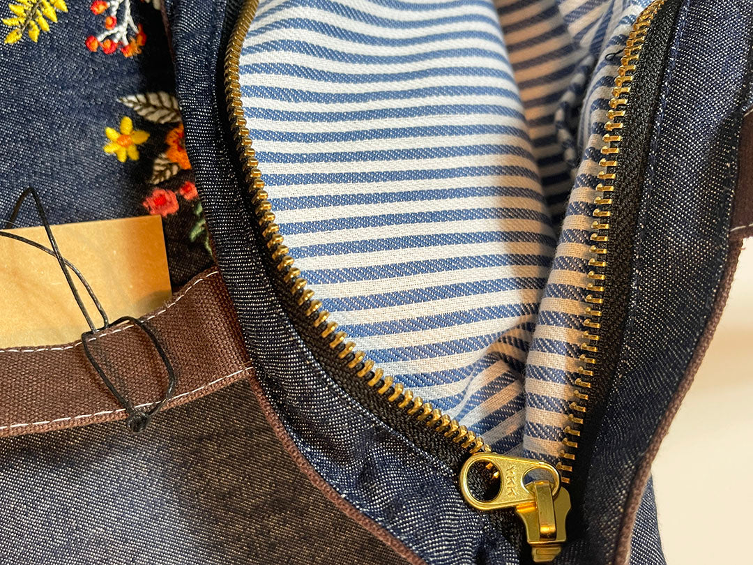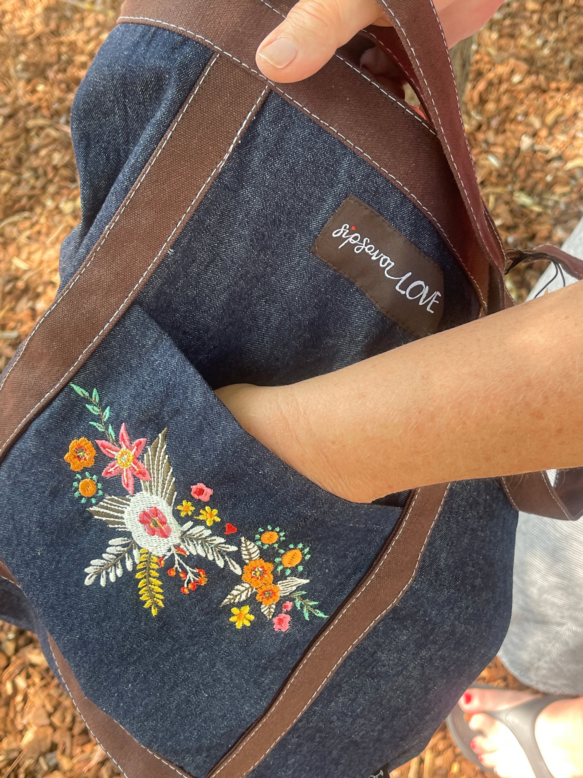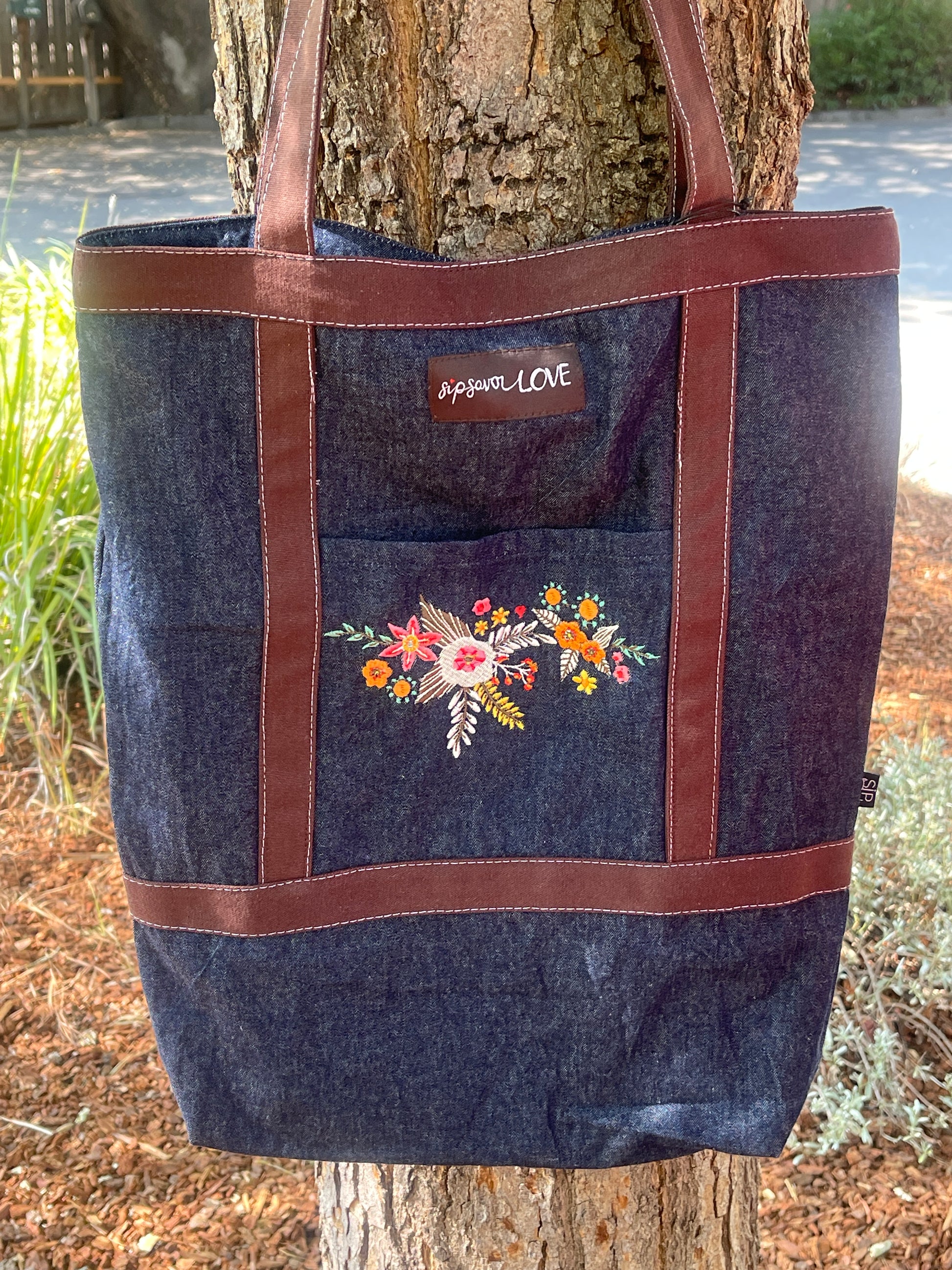 Unique Tote Bag! This has both inside and outside pockets, a quality zipper and a wonderful woven stripe lining. The embroidery was so much fun to design. I wanted it to feel spontaneous and colorful but not overwhelm the denim and I think it was produced perfectly.