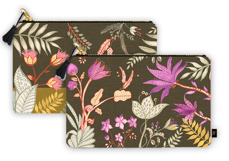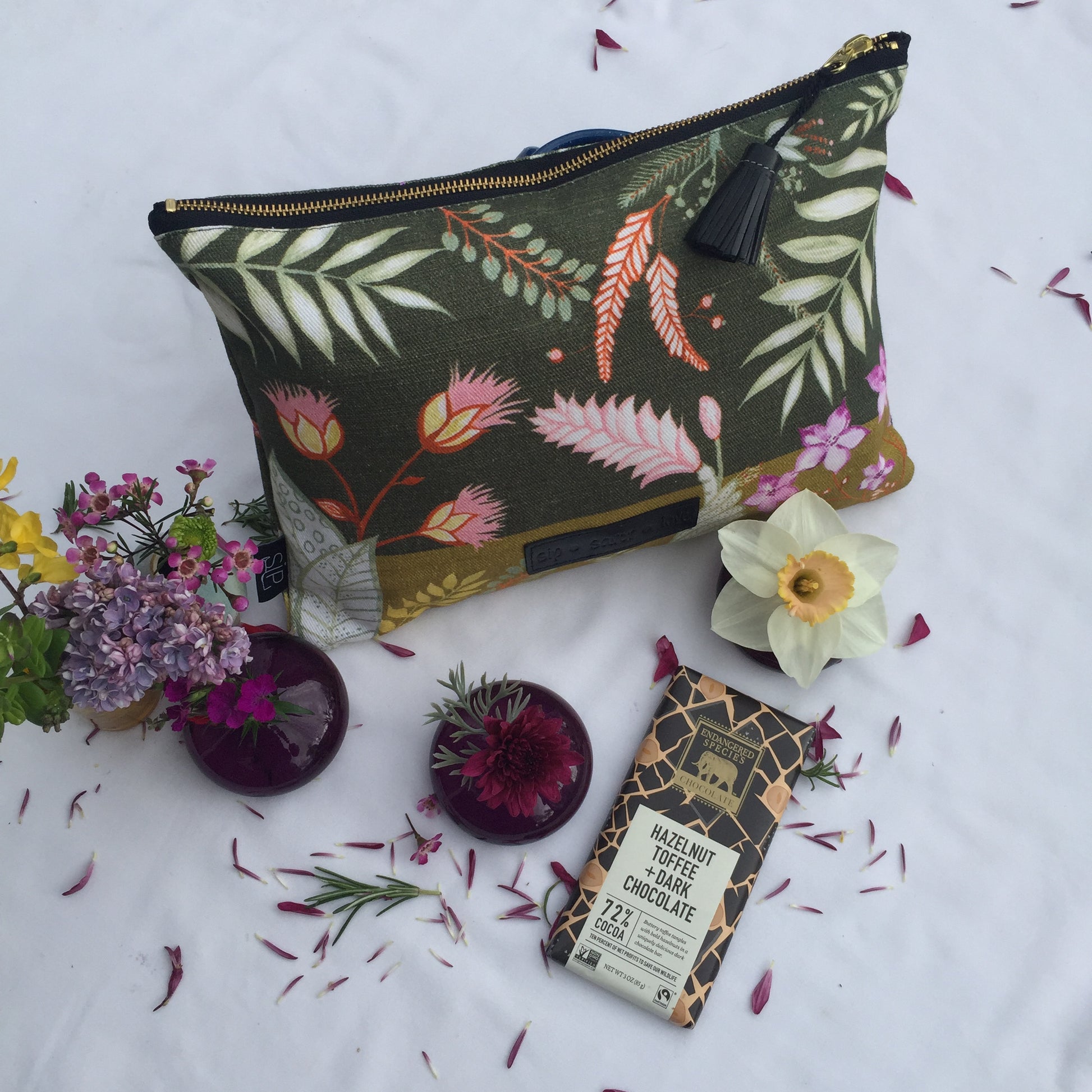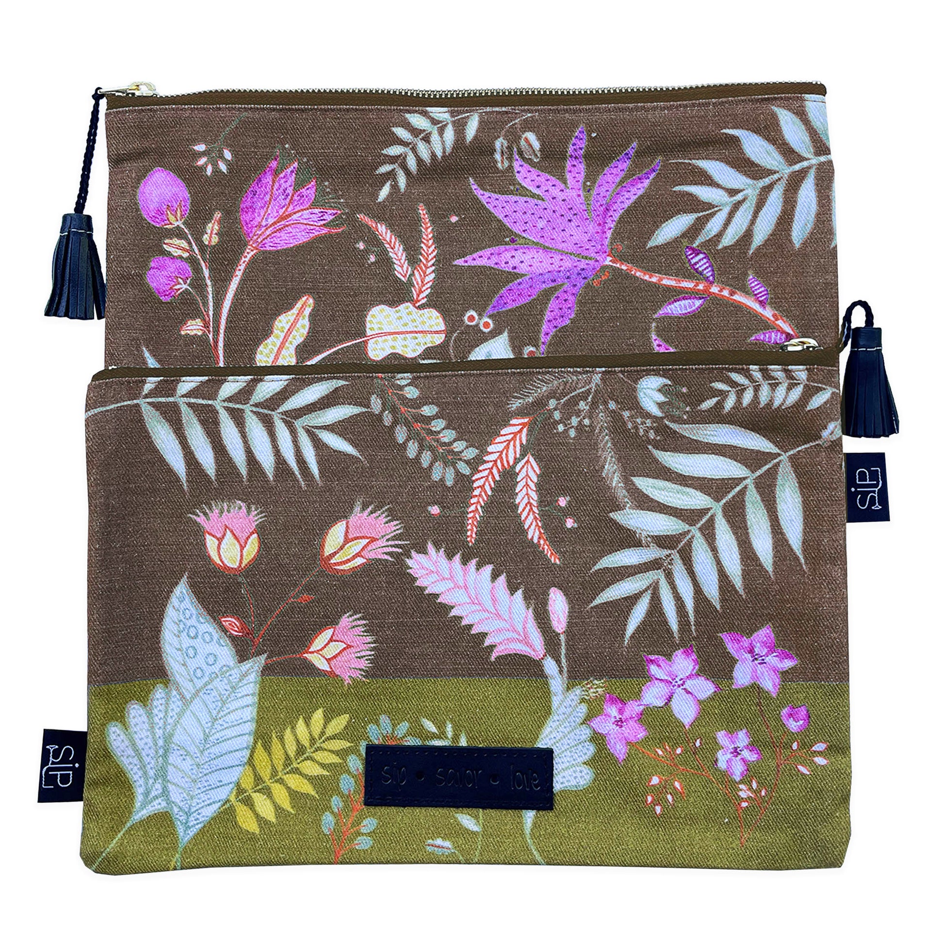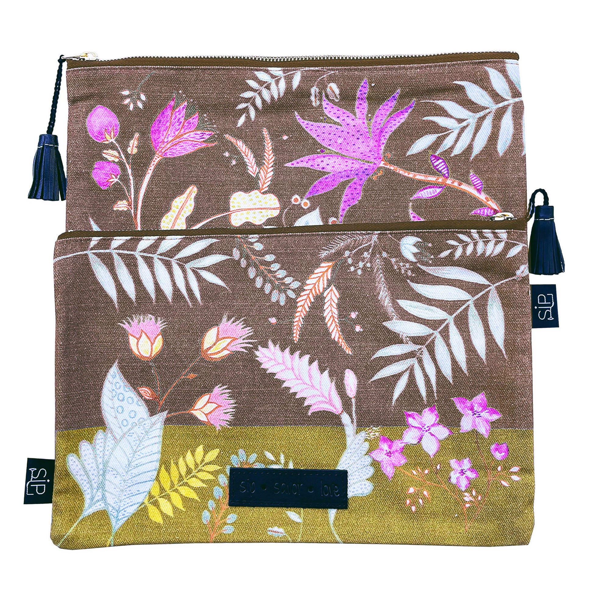 Size 12.5” x 8.5”. 100% high grade organic cotton. Quality construction, leather tassel, leather embossed tag (with my company motto to remind us to SIP SAVOR and LOVE), extra quality chunky gold zipper. Inside pockets. Reverse of bag is the same print. Please note that the inside lining is not waterproof. It is washable.