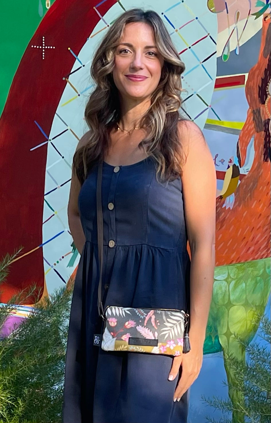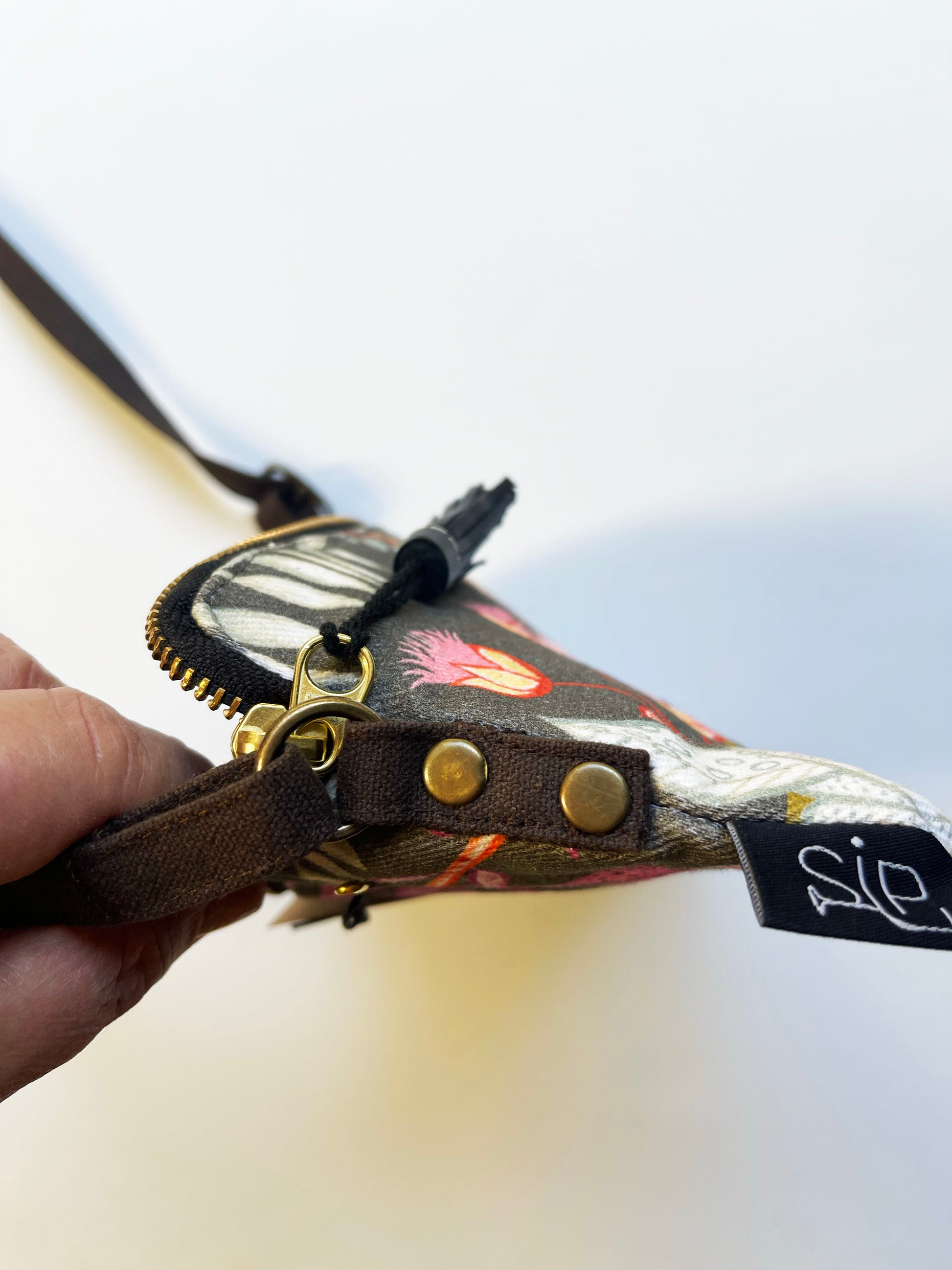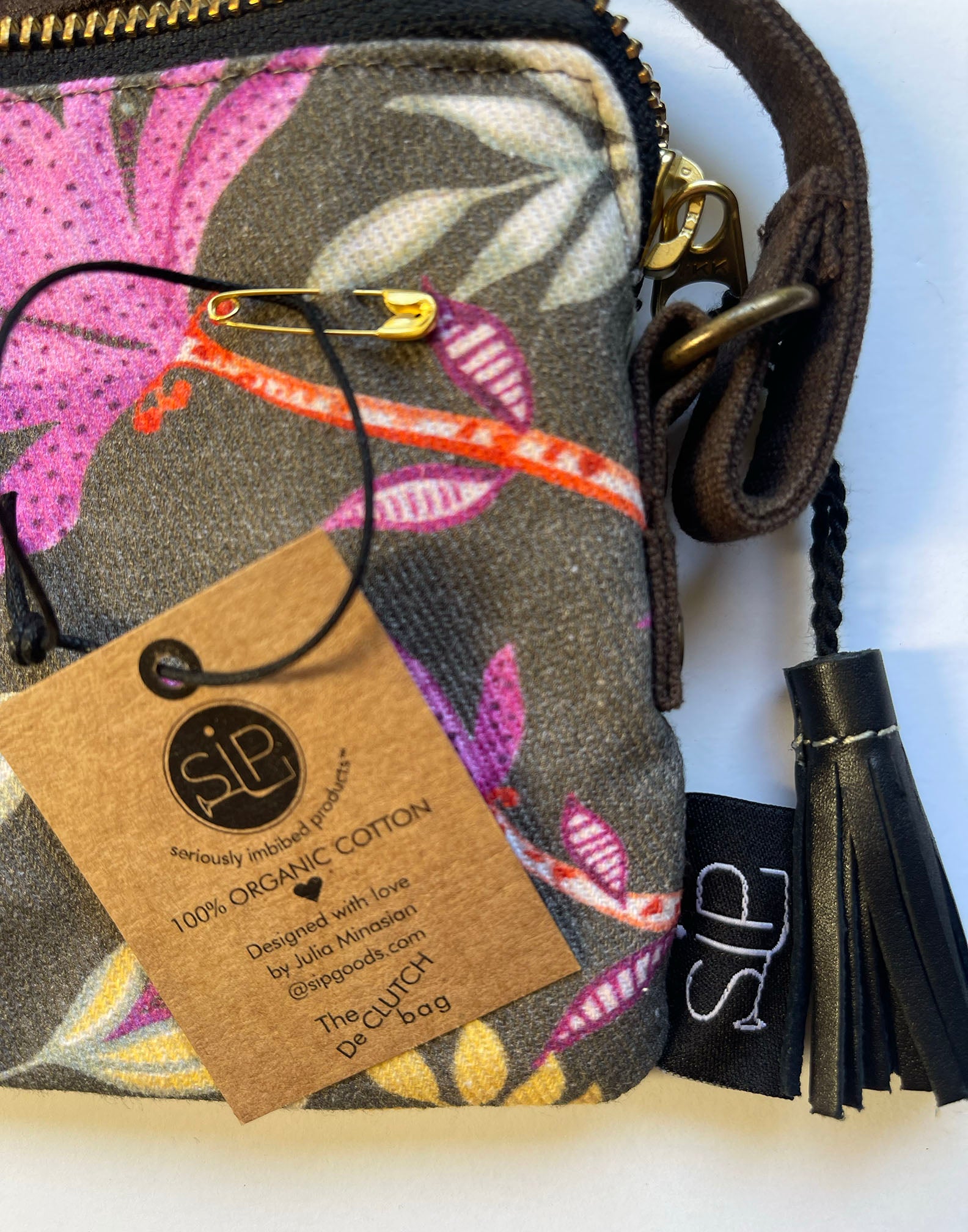 This is a fun cross body bag designed to hold a mobile phone and a few other essentials so you can be hands free when out and about. The straps are made from organic cotton canvas to look like leather. The inside is fully lined in black organic cotton and the zipper is stylishly chunky and high end. There's an added leather tassel and a leather tag with our company motto 'sip savor love'.
