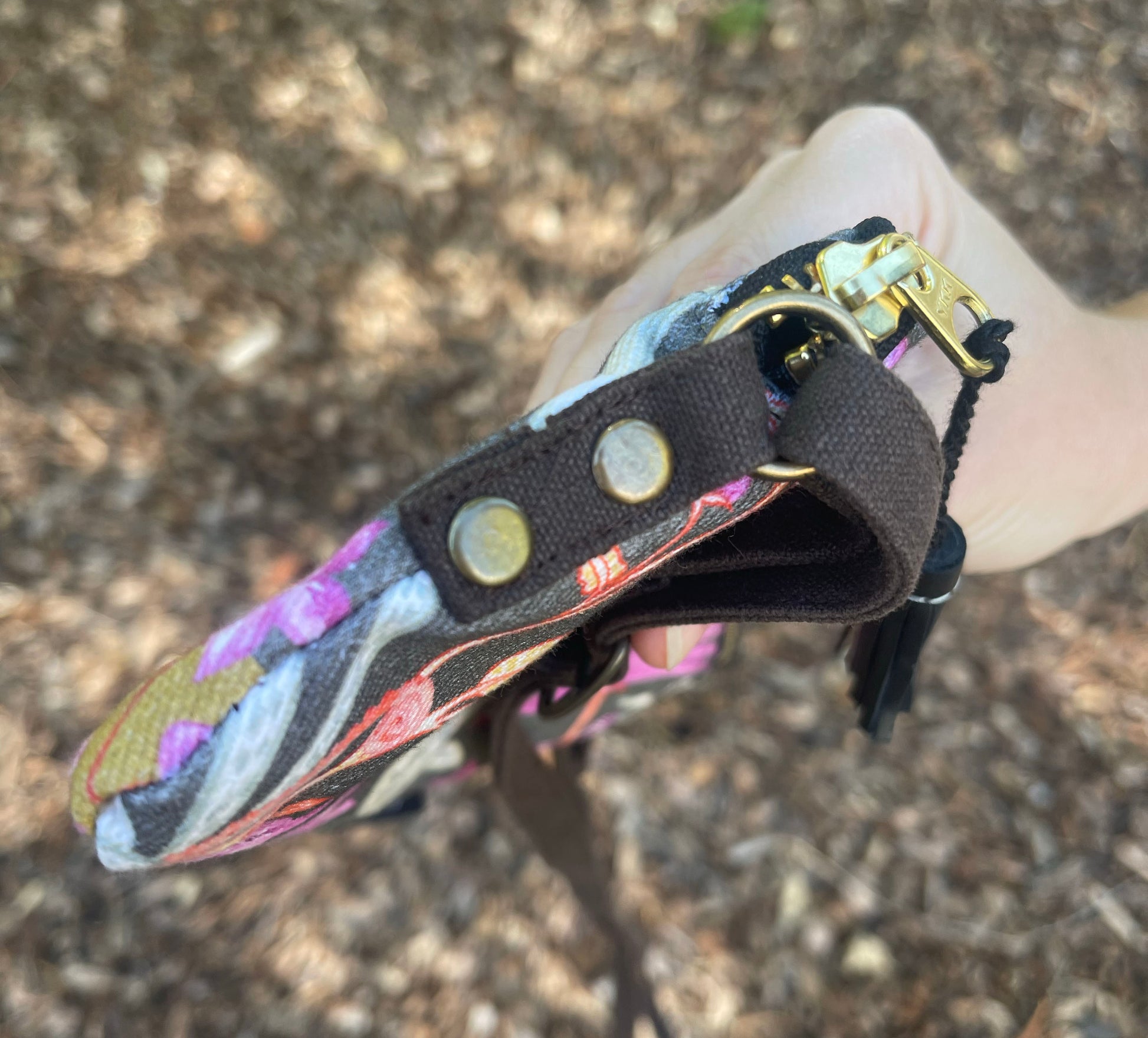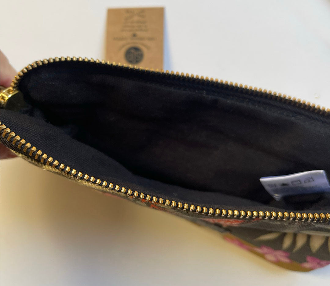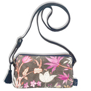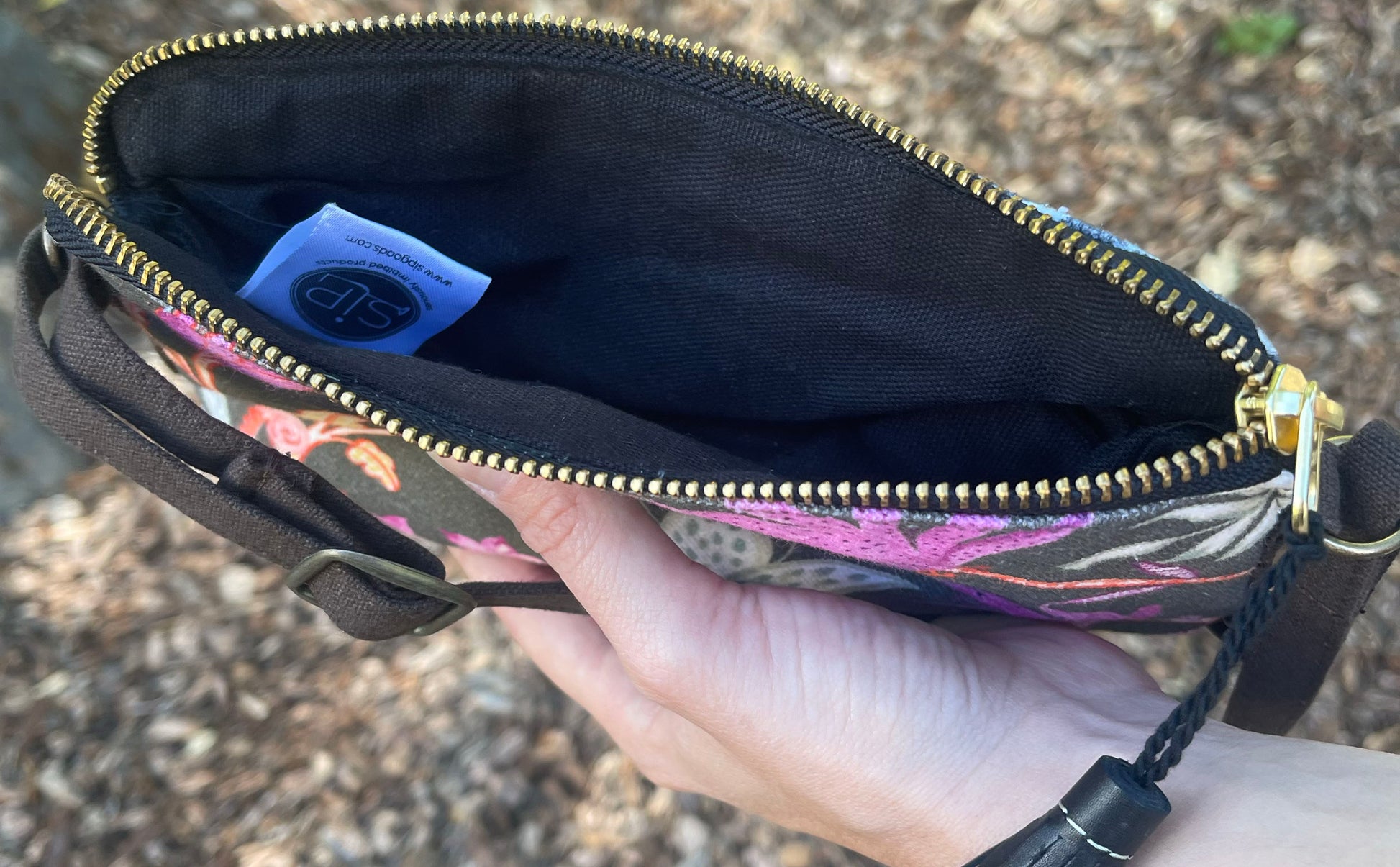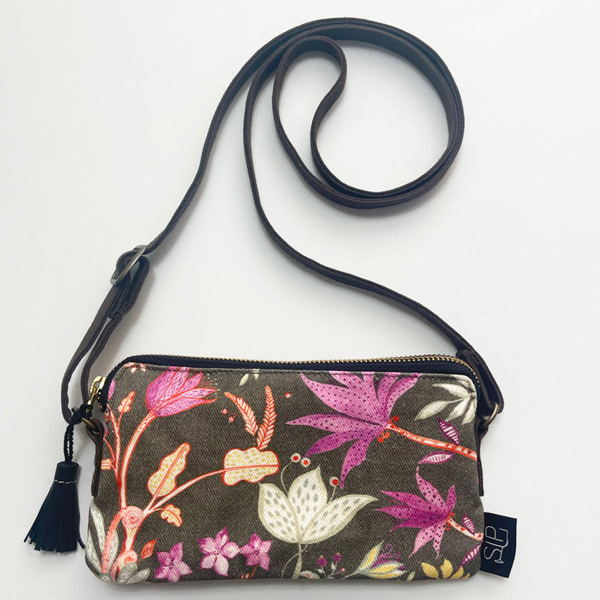 This is a fun cross body bag designed to hold a mobile phone and a few other essentials so you can be hands free when out and about. The straps are made from organic cotton canvas to look like leather. The inside is fully lined in black organic cotton and the zipper is stylishly chunky and high end. There's an added leather tassel and a leather tag with our company motto 'sip savor love'.