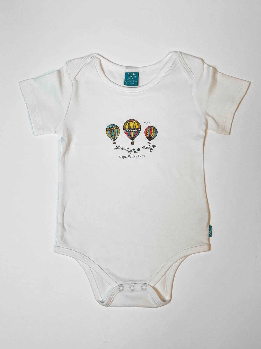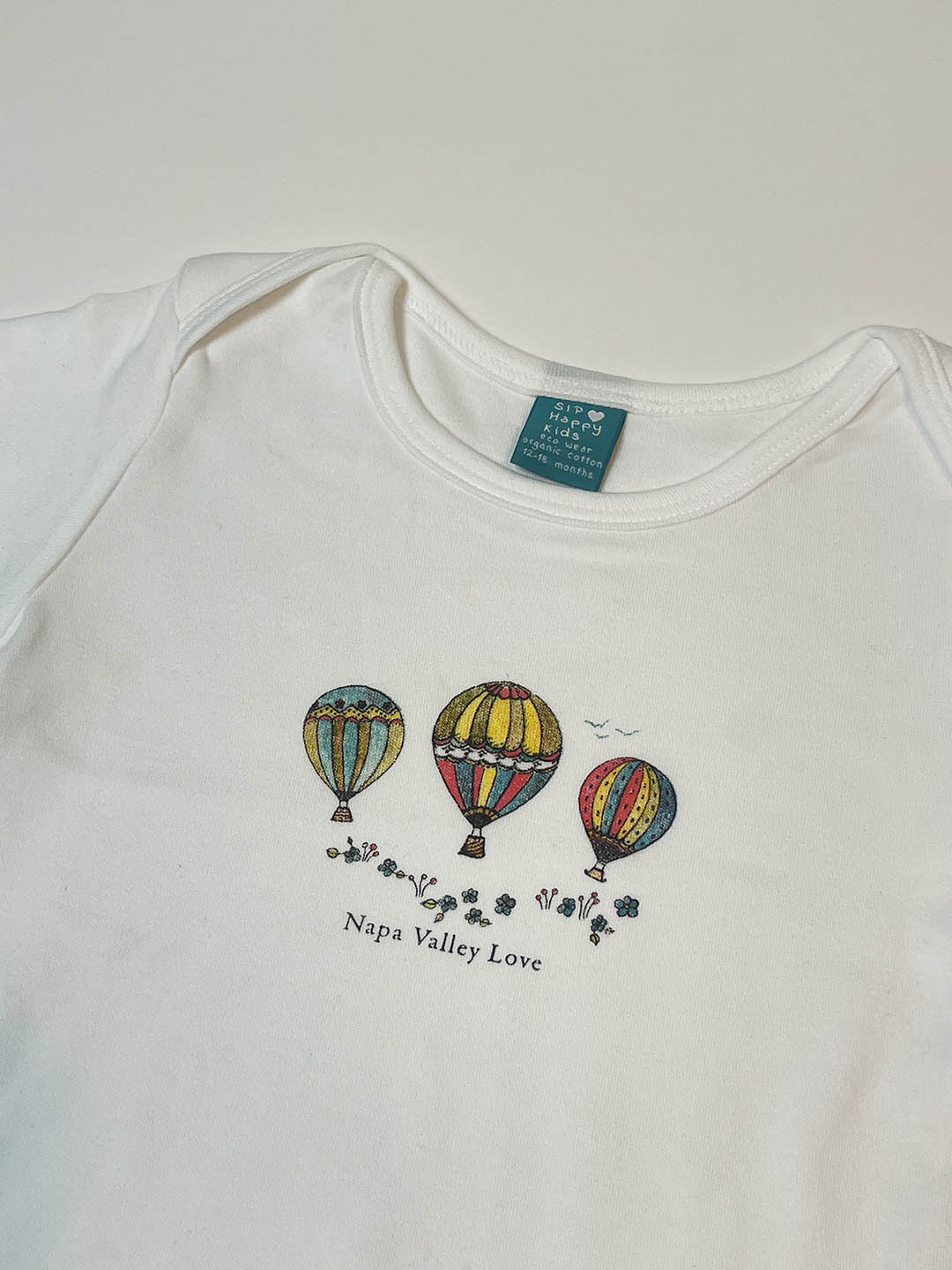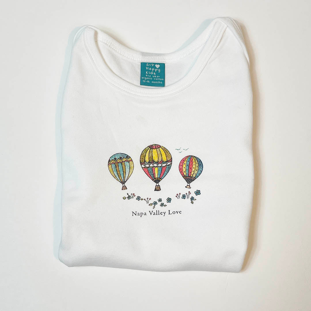 They are beautifully made with luxuriously soft organic cotton. The design of 'Up Up and Away' is of 3 vintage style balloons rising up to float among the birds while leaving a meadow of wild flowers far below. What a perfect gift for anyone who loves the Napa Valley, hot air balloons and whimsical design.