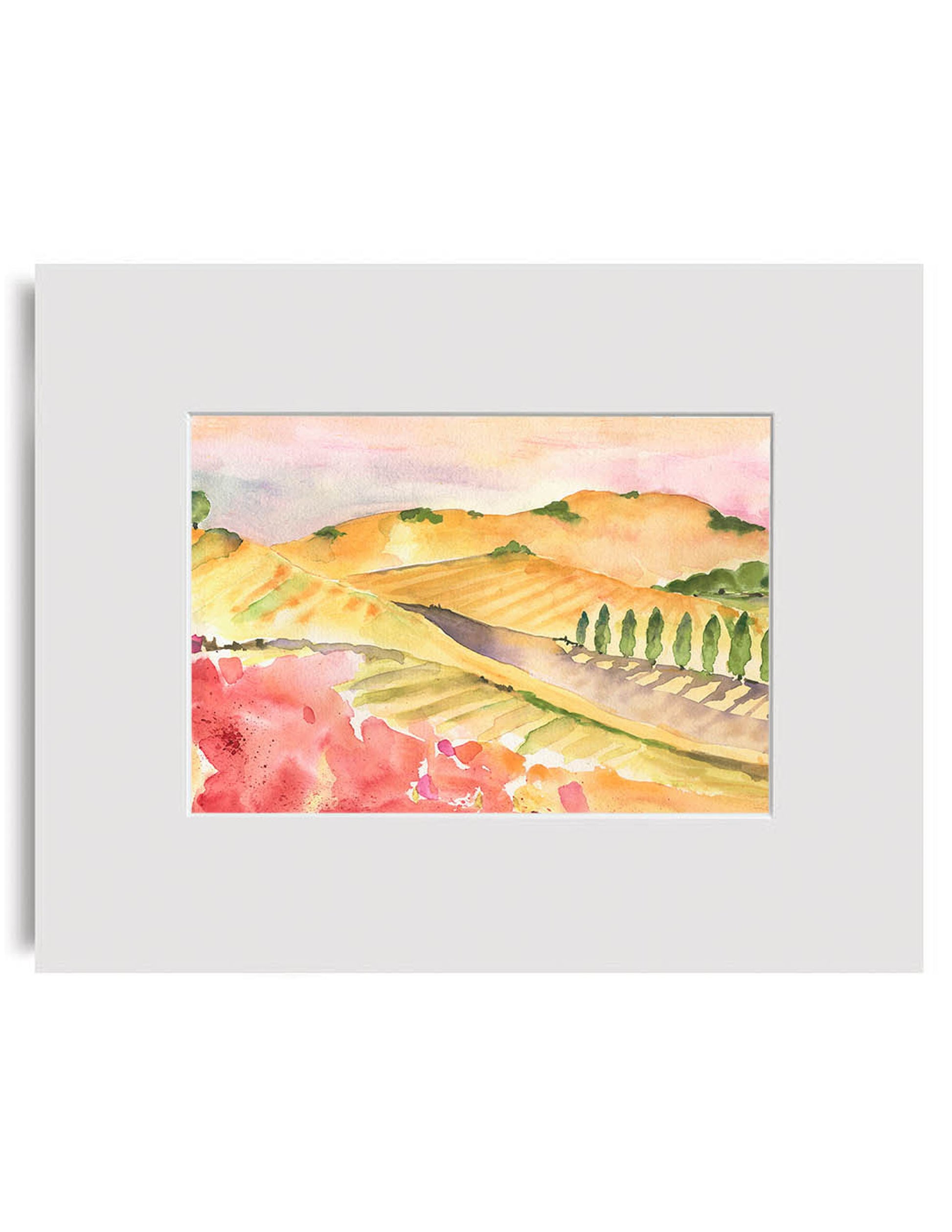 There's something amazing about the West Coast Hills and I love to paint them. The continually changing color of the different seasons has dramatic contrasts. I love the bright orange poppies and springtime wild flowers which are juxtaposed against wide blue sky and either verdant green or golden yellow hills. In the Fall, the vineyards are rich with autumnal hues which just take one's breath away. It's lovely to see the resurrection of vineyards that were destroyed during prohibition times. I hope the stillness and calm of these watercolors reminds you of your time appreciating this beauty.